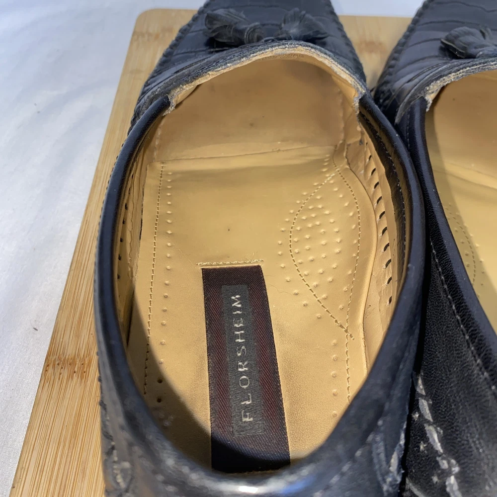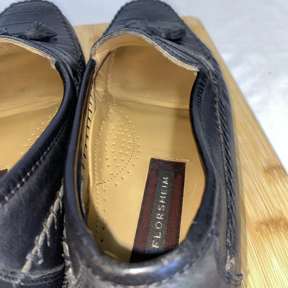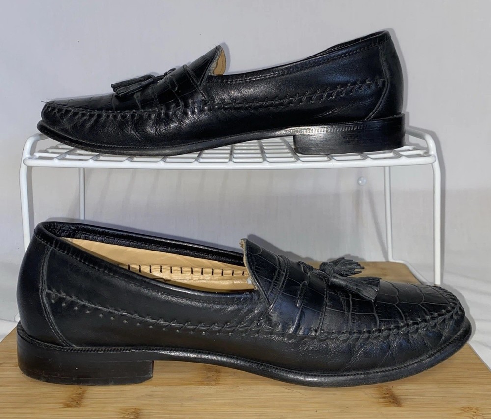 Step into classic sophistication with these Florsheim Pisa Tassel Loafers. Crafted from black leather with a subtle croc-embossed texture, these slip-on dress shoes feature elegant tassels and a sleek silhouette—ideal for formal wear or polished business attire. Condition: • Excellent pre-owned condition • Minimal signs of wear • Uppers are clean and glossy • Soles and heels show usage • No cracks, major creases, or damage • Fully intact tassels and stitching Product Details: • Brand: Florsheim • Style: Pisa 18469 • Size: Men’s 9.5 D (Medium Width) • Color: Black • Material: Leather (with croc embossing) • Features: Slip-on, tassel loafer, leather lining • Sole: Man-made with leather feel • Made for comfort and style A refined, Italian-inspired look for the modern gentleman. Ships fast and carefully packed. Please view all photos for condition.