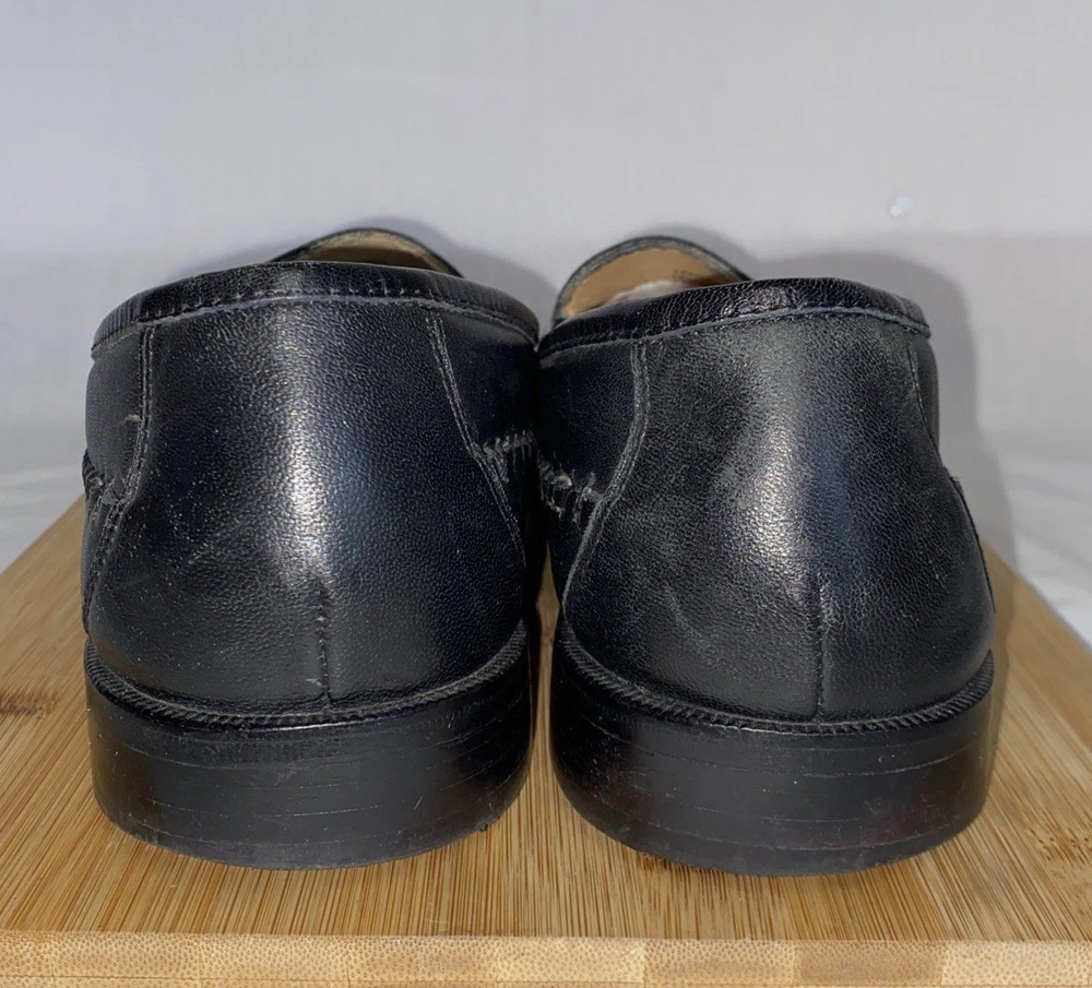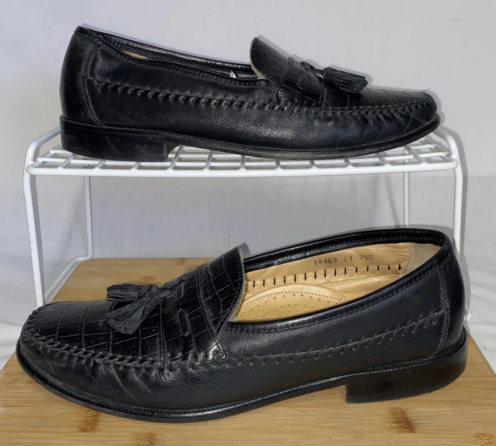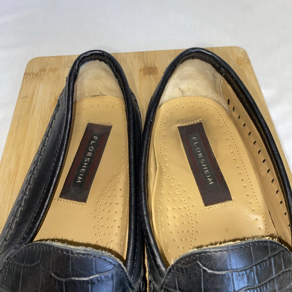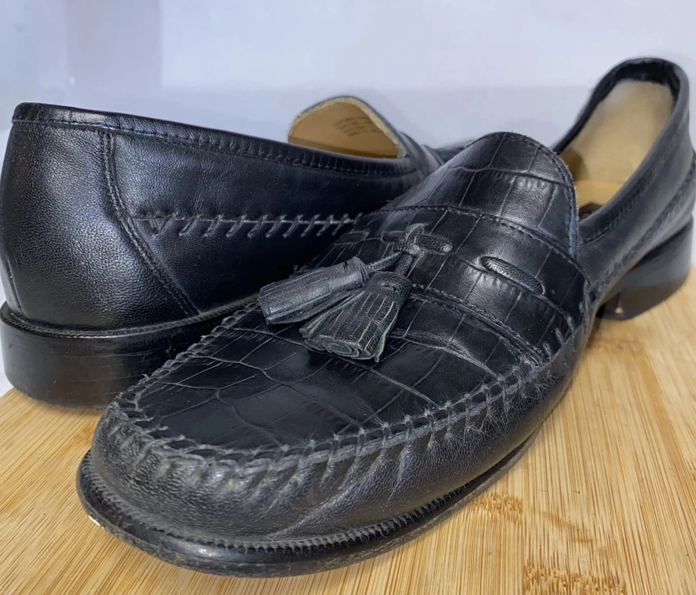 Step into classic sophistication with these Florsheim Pisa Tassel Loafers. Crafted from black leather with a subtle croc-embossed texture, these slip-on dress shoes feature elegant tassels and a sleek silhouette—ideal for formal wear or polished business attire. Condition: • Excellent pre-owned condition • Minimal signs of wear • Uppers are clean and glossy • Soles and heels show usage • No cracks, major creases, or damage • Fully intact tassels and stitching Product Details: • Brand: Florsheim • Style: Pisa 18469 • Size: Men’s 9.5 D (Medium Width) • Color: Black • Material: Leather (with croc embossing) • Features: Slip-on, tassel loafer, leather lining • Sole: Man-made with leather feel • Made for comfort and style A refined, Italian-inspired look for the modern gentleman. Ships fast and carefully packed. Please view all photos for condition.