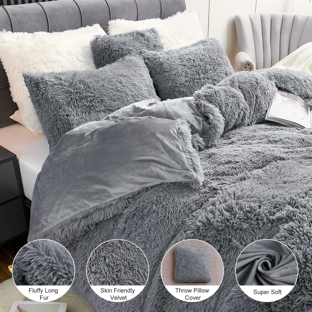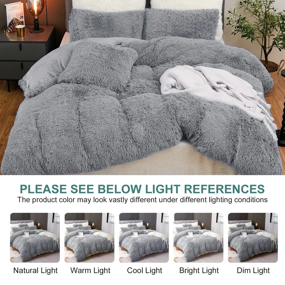 【LUXURY AND SOFT】 The front of the fluffy comforter cover is microfiber plush, which is super soft and comfortable. The back is silky velvet fabric that is delicate and skin-friendly, locking in warmth, gives you a warm and cosy sleep in the cold winter. 【WARM, COZY & STYLISH】 This fluffy bed set brings you the ultimate comfortable sleep experience, like sleeping on a cloud so you can fully relax in your bed. The stylish solid color design adds luxury to your room and is the perfect choice for updating your bathroom. It’s also a warm gift for your family, friends or colleagues, making them feel your caring. 【EASY TO INSTALL】 The faux fur comforter cover has a zipper closure at the bottom, and the metal zipper is smooth and durable, easy to disassemble; The 4 corner ties inside the plush comforter cover helps keep the quilt in place and prevent slipping for comfortable sleeping at night. 【OPTIONAL SIZE】 The light gray shaggy duvet cover set includes 1 x Queen size duvet cover (90"x 90"), 2 x Pillowcases (20" x 26"), and 1 x Throw pillow cover (18" x 18"). Note: Quilts and sheets are not included. This grey fluffy duvet cover set comes in a variety of colors and sizes so you can choose according to your preference and bedroom style. 【CARE INSTRUCTION】The comfortable fuzzy bedding set can be machine washable in cold water, gentle cycle, tumble dry low, do not bleach, do not iron. To protect the fur, turn it inside out when cleaning. We recommend cleaning before first use. Please feel free to us if you have any question, we will reply you within 24 hours and give you a satisfied answer.