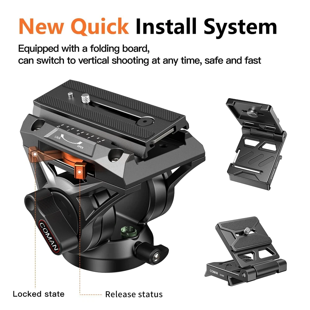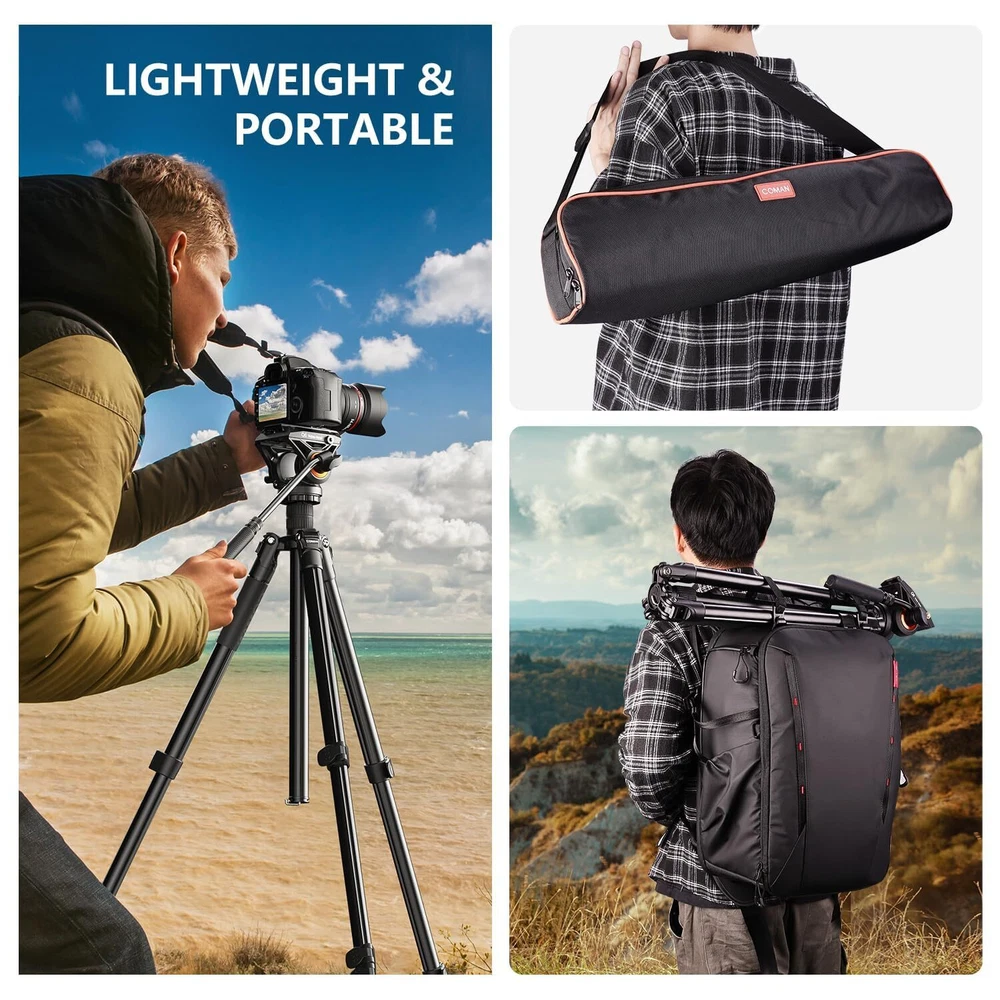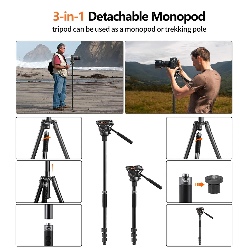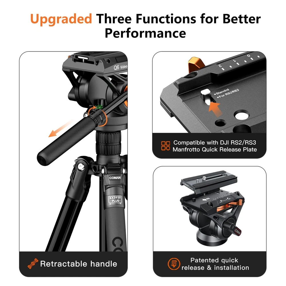 【NEW Q6 Fluid Head】 Multifunctional aluminum camera video tripod,newly upgraded Q6 gimbal is compatible with DJI RS2/RS3 ,Manfrotto Quick Release Plate,supports 360 ° panoramic view and+90 °/-70 ° tilt, which can bring a good feeling for smooth operation and easily capture stable and smooth videos 【Heavy Duty Metal Camera Tripod】Made of high quality aluminum alloy, the tripod is sturdy and lightweight.Telescopic drag handle can be retracted and detached, space-saving design for easy shooting,ideal for field and landscape photography or outdoor video shooting and filmmaking.Side 1/4" side screw holes for microphone, monitor or light 【Upgrade Quick Installation System】Compared with the traditional slide-in structure, press the QR plate directly from the top of the head and lock it within 1 second,or you can quick locking and releasing of the pull bolt the QR plate via the side,convenient to switch between tripod and gimbal shooting,for photographers quickly place the camera.Equipped with foldable panels, more possibilities for angle locking to switch between horizontal and vertical lenses.With L-shaped hexagonal key, the camera can be fixed without the need for additional tools 【Adjustable Height】360°thickened footbed, anti-skid design, fully applicable to complex terrain.Weight capacity of 10KG and folded length of 56cm, 4-section column legs with knob lock allows you to adjust the working height from 22.8" to 69.3".Unique internal quick plate update design with wrench allows photographers to quickly connect the camera without any other tools 【Multifunctional Tripod 】 The monopod with 180° upward folding legs, easily converted into a monopod by combining the center column with the detachable tripod legs; reversible center roll ,the monopod can be adjusted according to the different shooting needs of the photographer