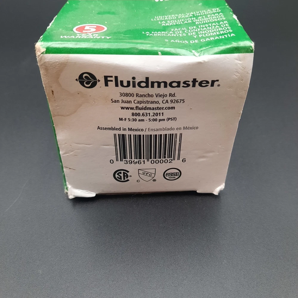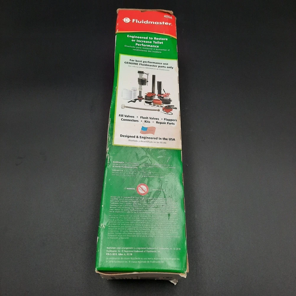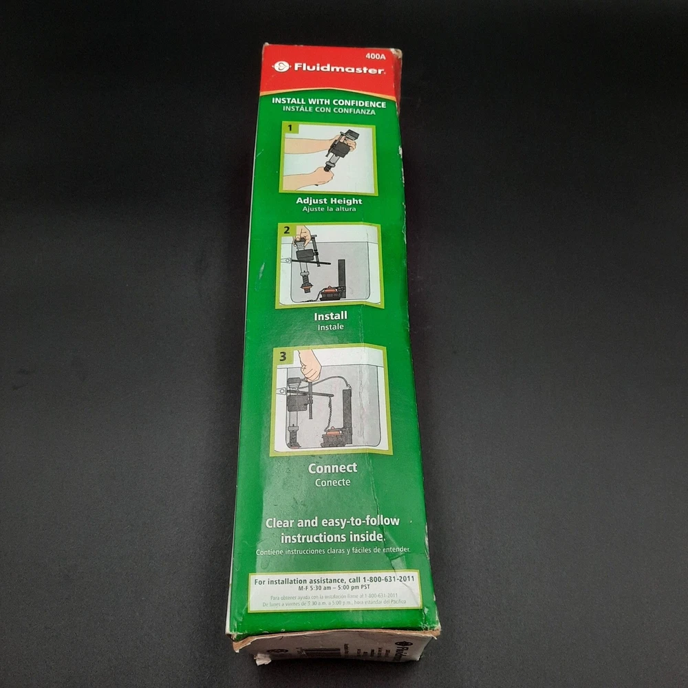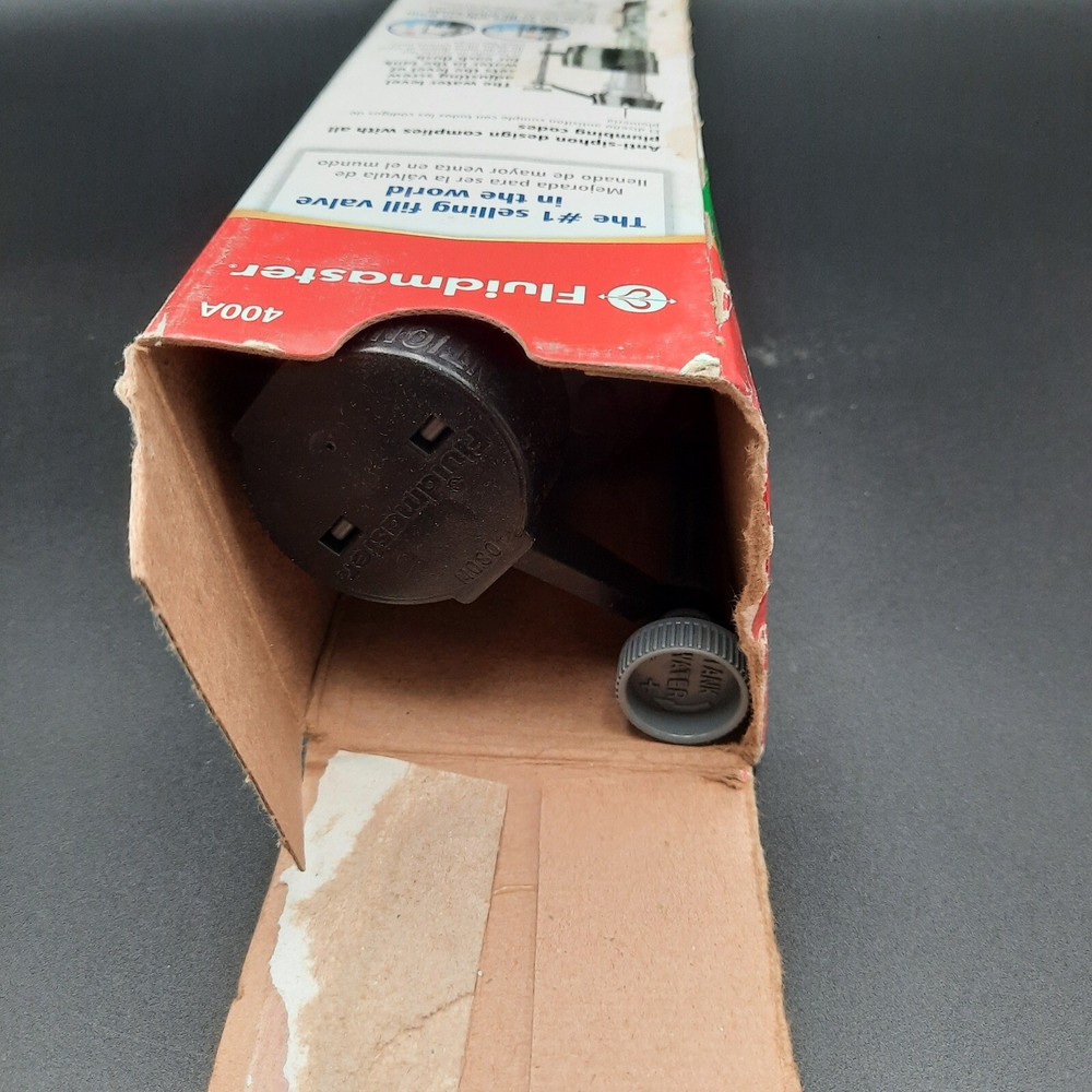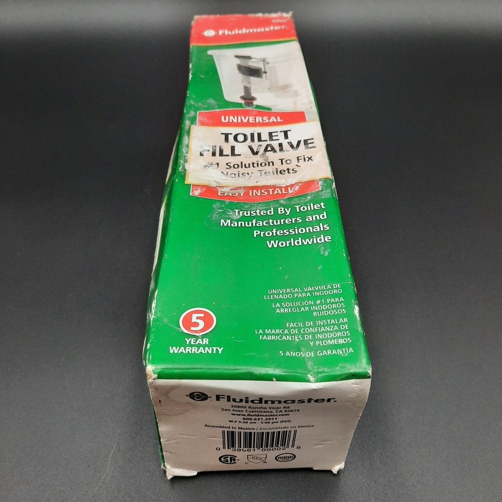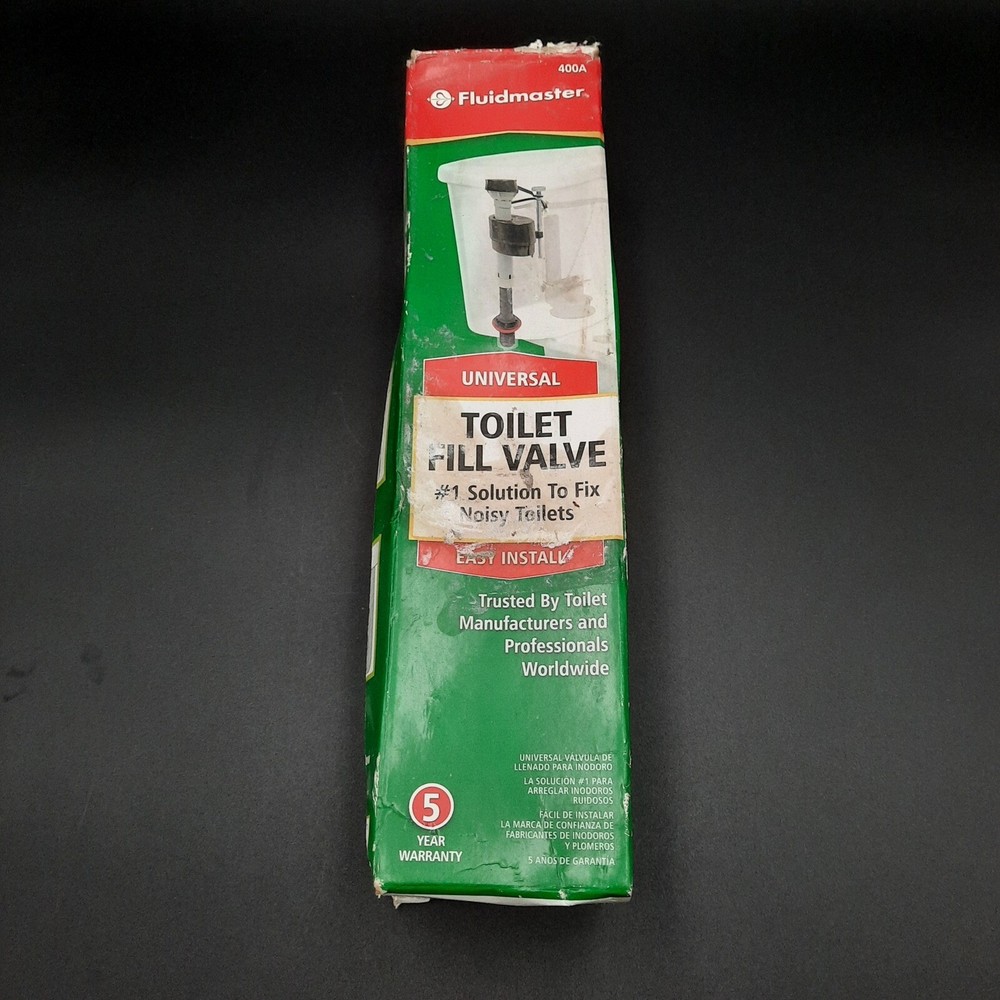Fluidmaster 400A universal toilet fill valve, designed to replace faulty or noisy toilet fill systems. Features anti-siphon compliance, adjustable height (9" to 14"), and a torque guard locknut to prevent overtightening damage. Package shows signs of wear but valve is unused and in excellent condition.