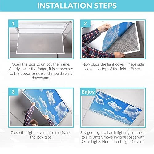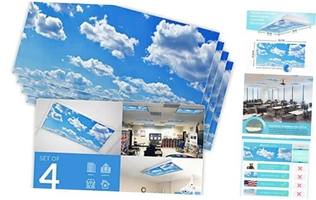 Menu 1. We require immediate payment. 2. We currently accept payment via eBay managed payments only. 3. Once payment is cleared, we will dispatch your shipment within 1-3 business days. Please refer to the "Shipping" tab for more information regarding shipping speed to your destination. Fluorescent Light Covers for Classroom Office - Eliminate Harsh Glare Causing Eyestrain and Headaches. Office & Classroom Decorations - Cloud 001-4pk Product description FLUORESCENT TRANSFORMATION: Transform any standard 2x4 ft fluorescent fixture with our 22.38" x 46.5" UL certified backlit film light covers. Ideal for sensory rooms and classrooms. EYE COMFORT: Reduce headaches and eye strain with our flexible self-extinguishing light covers. Perfect for traditional fluorescent. RELAXING AMBIANCE: Add a calming touch to any space with our variety of designs ceiling light covers. Made in the USA and easy to install, perfect for offices and classrooms. VERSATILE SOLUTIONS: Our lightweight fluorescent light covers offer a practical and cost-effective solution for drop ceilings in a wide range of settings, including classrooms, offices, hospitals, and more. GLARE PROTECTION & UL CERTIFIED: Shield electronic screens from glare with our fluorescent light covers. Choose from a variety of decorative shades to add style to any room. PLEASE MESSAGE US IF YOU HAVE ANY OTHER QUESTIONS, AND MANY THANKS FOR READING ALL OF THIS. Copyright ©#. All Rights Reserved.