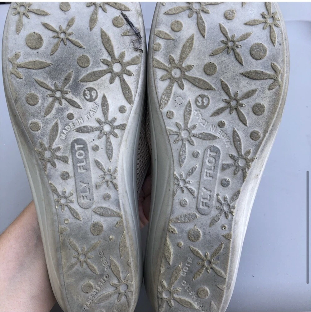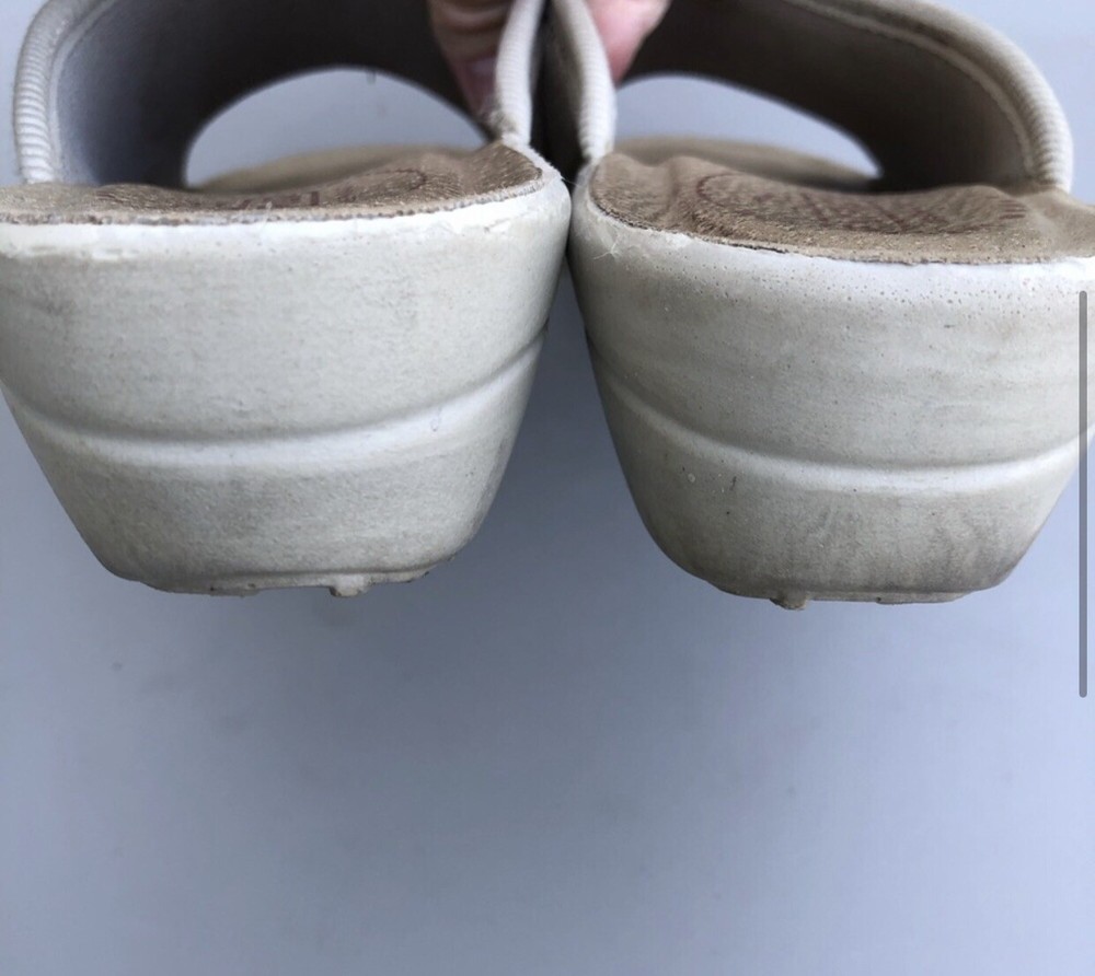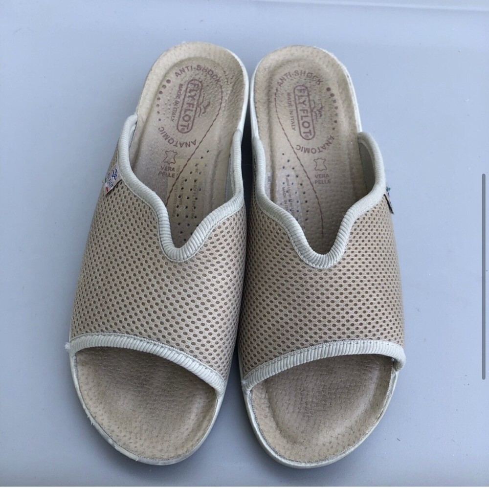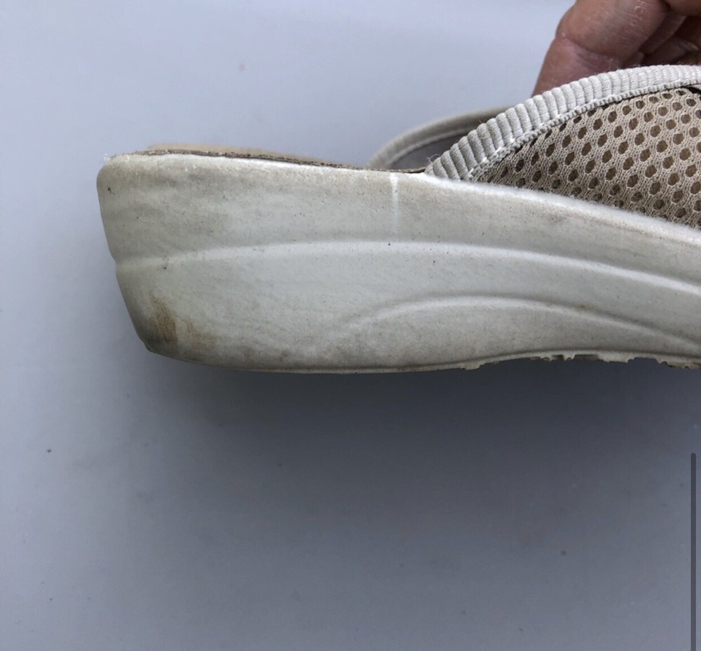 Fly Flot Anti-Shock Anatomic Slip On Shoes Tan Mesh Clogs Sz 8-8.5/39. Shows some discoloration on white part.