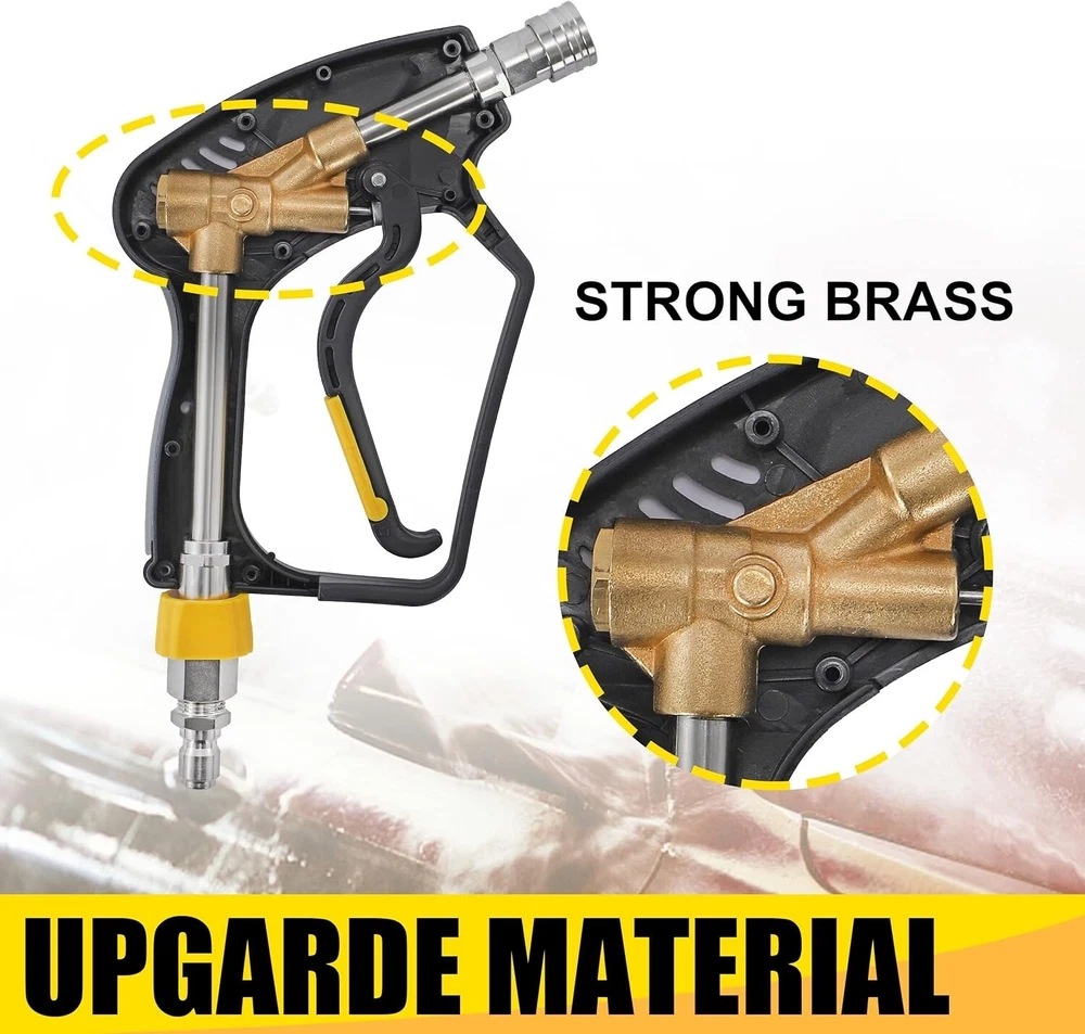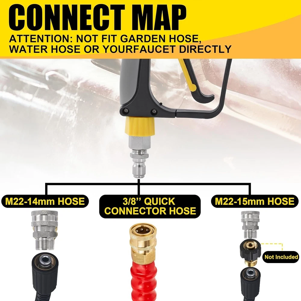 Foam Cannon with Pressure Washer Gun 5000 PSI, Power Washer Gun with 3/8'' Swivel Quick Connector, Adjustable Foam Blaster, M22 and /4 Inch Quick Connect, .5 Liter PRESSURE WASHER GUN SWIVEL FITTING: With 360-degree swivel, foam gun avoids kinking your pressure washer hose effectively, extended your pressure washer hose's service life. UPGRADED FOAM CANNONS: Power washer foam cannon’s working condition is 000 PSI to 3600 PSI. Snow foam cannon’s container bottle has a bigger mouth’s easy to fill in and an extra-wide neck to prevent crack issues, no leaking. A larger capacity foam lance’s container Capacity: Liter / Gallon. IMPROVED POWER WASHER GUN: Pressure washer guns’s made of high temperature resistant plastic & silicone material, snub nose pressure washer gun's internal structure is made of high-quality brass and stainless steel. Car wash spray gun’s working pressure is up to 5000PSI, max temperature for water is up to 50℃ ( 300℉). STRONG COMPATIBILITY: Pressure washer short gun has 3/8" NPT adapter. Incidental M22 4mm to 3/8’’ quick connector’s available for different sizes of high power washer hose, offers different connect way and provides effective convenience for your life. UNIVERSAL APPLICATION: Car foam cannon is a good cleaning helper. Wide mouth foam cannon’s useful for Motorcycle, Car washing; Roofs, Driveways, and Siding washing; Floors, Windows washing; and more helpful for detailing Trucks or SUVs. Car wash mitt scrubs your car cleanly. High-quality products and professional services give you a wonderful shopping experience.