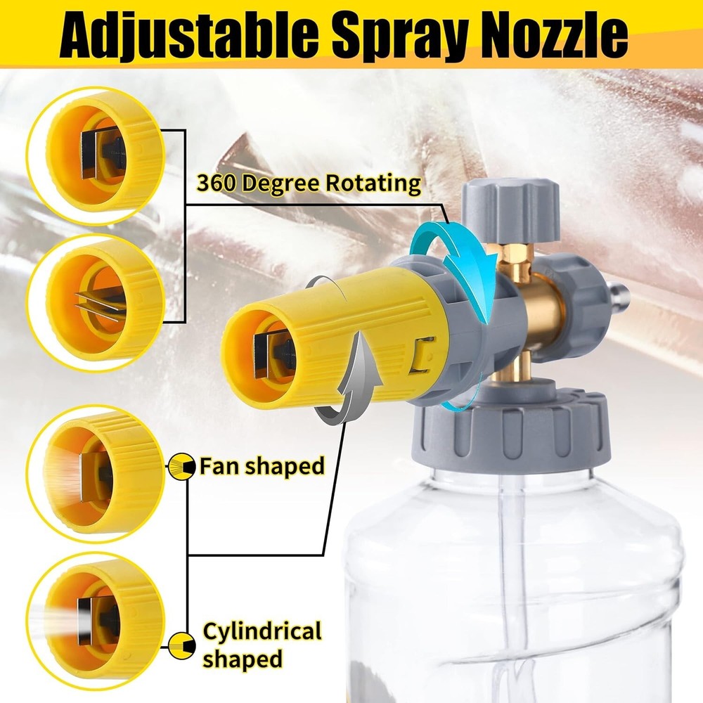 This foam cannon is a game-changer for car washing! The 360-degree swivel prevents hose kinks, and the adjustable foam blaster delivers thick, rich suds effortlessly. The wide-mouth bottle makes refilling a breeze, and it works flawlessly with my pressure washer. Super sturdy and easy to connect—definitely worth every penny for a professional-level clean!