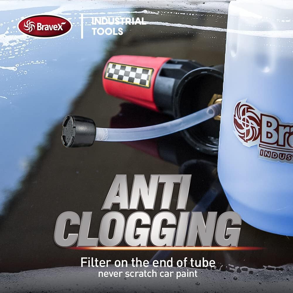 About this item 【Heavy Duty Brass Core & 1.1mm Metal Orifice】- The foam cannon is made with all thick brass core and wall engineering plastic can to be leak-free and durable under high pressure, can produce plenty thick snow and remove the thickest dirt and mud easily. (Notice: 5 nozzles included in the kit) 【Built to Last】- ①Extra Wide Bottle: Designed to spread the pressure out, efficiently avoid neck cracks that is frequently happened to the other models after a period time use. ② Filters on the end of tube set to filter particles in the soap or water, avoid any blocks or scratches to the car 【Excellent Foaming Performance】- The spray nozzle is adjustable and can rotate 180° to be vertical or horizontal, conveniently wash all nooks and corners. The snow foam thickness can be adjusted by top knob and incredible thick (maximum pressure reaches 4000psi) 【Widely Used】- Sprays thick car wash foam over any vehicles, luxury car, motorcycle, trucks, SUVS, floor, roofs, window, driveway. Compatible to 1/4’’ pressure washer connector, 725-4,000 PSI operating pressure range; 2-5.3 gallon/minute pressure washer 【100% Satisfaction】- Backed by 90-days no asked 100% money back and lifetime customer service Product Description Designed for Professional Car Wash, Suitable for Most Pressure Washer (Garden hose not suitable) This foam cannon works under 725 PSI ~ 4,000 PSI,and water flow 2.0 GPM ~ 5.3 GPM Suitable for most 1/4 connector pressure washer, can be widely used on not only car but motorcycles, windows, driveways, roofs, ground, floors, wall and siding or watering flowers and plants. About us We are committed to select and manufacture premium automotive accessories. This foam cannon is the one selected for your best choice. Its kinds of flexible adjustments for your convenience, 100% brass core & solid plastic bottle and metal orifice construction make it definitely premium and durable. 1 * Foam Cannon 5 * Pressure Washer Nozzles 1 * Instruction Manual Heavy Duty Foam Cannon Required Condition Pressure: 725 PSI ~ 4,000 PSI; Never Exceed 4,000 PSI. Require Flow: 2.0 GPM ~ 5.3 GPM; Never Exceed 5.3 GPM Max Temperature: 60℃ / 140℉ Bravex foam cannon with built-in 3.0 orifice (1.1mm) Mix soap and warm water solution in the bottle Connect to the 1/4” connector of pressure washer Press the washer trigger to start spraying Adjust the water regulator to produce foam Adjust the fan blade (jet wide) to desired foam consistency WIDELY USED -- Sprays thick car wash foam over any vehicles, luxury car, motorcycle, trucks, SUVs, floor, roofs, window, driveway TIPS Before spraying the snow foam, rinse the car with water. After use, clean the foam cannon with water to avoid any blocks in the next use Save the soap by properly adjusting the foam concentration depending on how dirty of the car No swirls and scratches by choosing a good quality cannon & soap It is suggested that foam is produced with 20% soap + 80% water (adjustable as needed) Adapter needed if not 1/4’’ quick connector