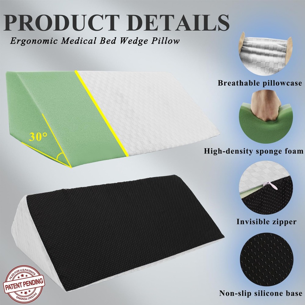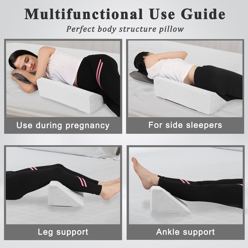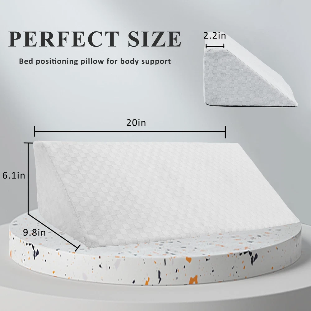 Our body positioning wedge pillow gives stable support to side sleepers, and the pillow is made of a high-density memory sponge that is not easily deformed and has strong enough support to give side sleepers a deep sleep. It is suitable for people who are bedridden patients, the elderly, pregnant women, and so on, not only to help turnover but also to change the posture to promote blood circulation, pregnant women use it to relieve lumbar fatigue during pregnancy and create a good sleep experience. The pillowcase of wedge pillow is very comfortable and easy to clean, just take it off and throw it into the washing machine, greatly saving care time and in line with the concept of sustainability. Unparalleled Comfort: The high-quality wedge pillow is filled with a comfortable memory foam material that provides softness and support and won't deform with long-term use, giving you a full night of quality sleep. RECOVERY PARTNER: Wedge pillows are suitable for post-surgical care of the lower back, legs, and abdomen, as well as for pregnant women. During pregnancy, expectant mothers can sleep on their side with the help of a pillow to relieve back strain. PROVIDES SUPPORT: The 30-degree angled triangular wedge pillow is designed to give extra support to the neck and spine, suitable for side sleepers. It maintains the natural curve of the cervical spine, helps improve sleeping posture, and reduces neck and back discomfort. RELIEF PAIN AND DISCOMFORT: The wedge pillow for the bed can help reduce pain and discomfort in the neck, shoulders, and back. Stable support reduces stress on the cervical spine and muscles and relieves pressure sores and pain. EASY TO CLEAN: The pillowcase of the wedge pillow can be easily removed, it has an invisible zipper that is very convenient and can be hand or machine washed.