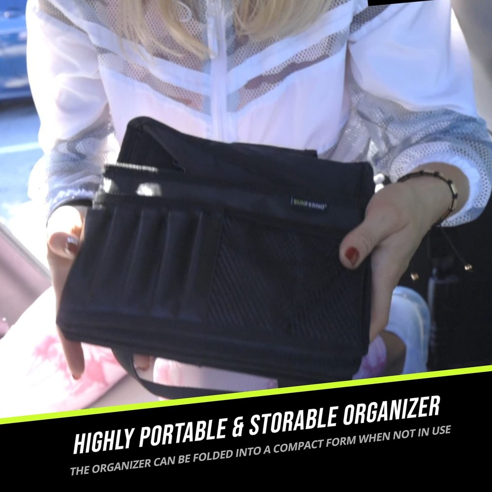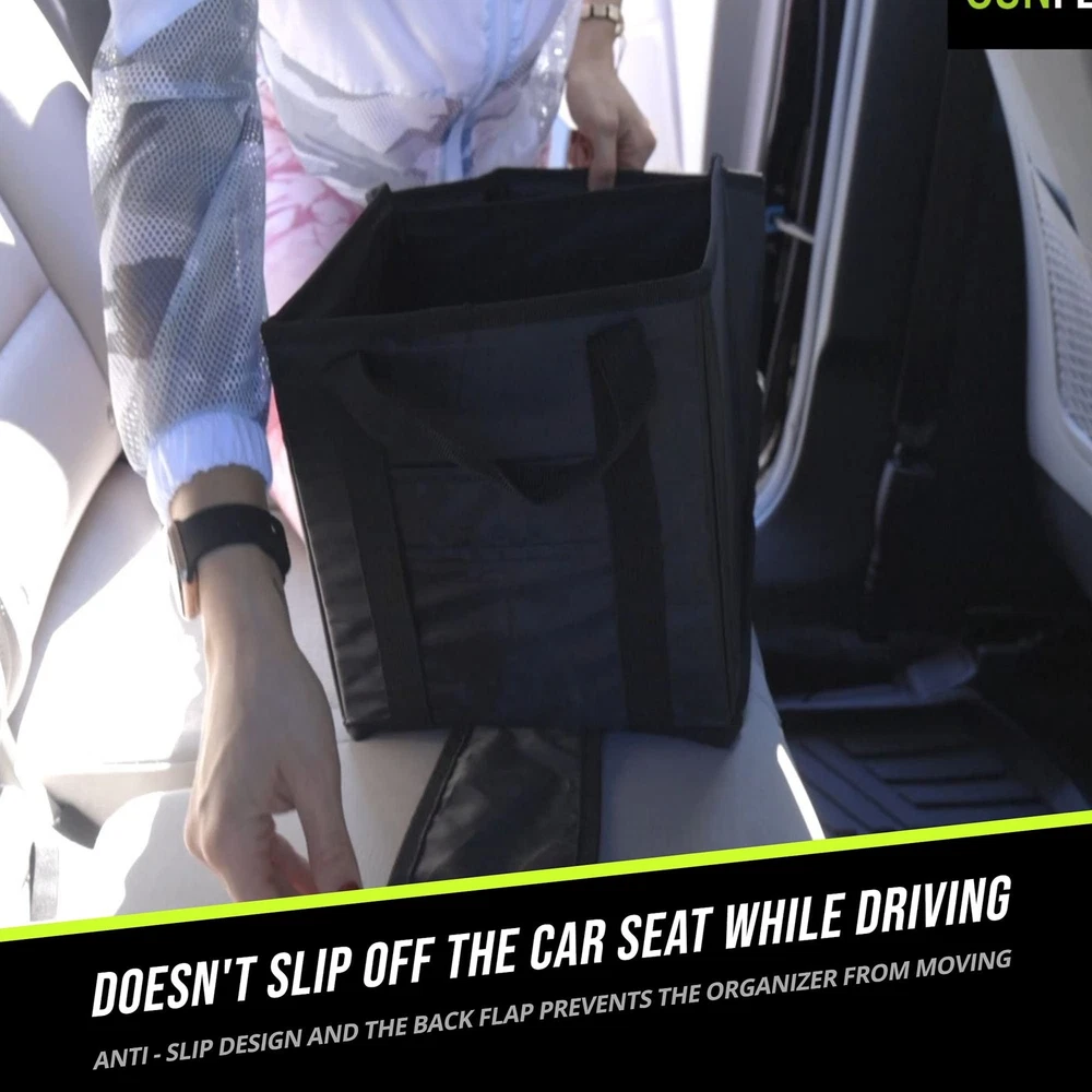 Foldable Car Seat Organizer for Front, Back Seat & Trunk - Store Your Baby Supplies, Kids Toys, Car Cleaning Supplies, Work Tools in the 12 Storage Compartments - Passenger Seat Organizer Product Details Specific Uses For Product: Automobiles Special Feature: Foldable Color: Black Brand: Sunferno Product Dimensions: 9.45"D x 9.25"W x 1.78"H Shape: Rectangular Capacity: 5.25 Gallons Number of Items: 1 Manufacturer: Sunferno Specific Uses For Product: Automobiles Special Feature: Foldable Color: Black Brand: Sunferno Product Dimensions: 9.45"D x 9.25"W x 1.78"H Shape: Rectangular Capacity: 5.25 Gallons Number of Items: 1 Manufacturer: Sunferno Part Number: SF-CTO Item Weight: 1.7 pounds Country of Origin: China Item Package Quantity: 1 Special Features: Foldable Batteries Included?: No Batteries Required?: No Date First Available: April 22, 2021 ALL YOUR STUFF IN ONE PLACE - Do you ever feel like your children's toy collection, baby's stuff, car and work supplies are taking over your trunk organiser, back seat or even front seat of your car? Worry no more! The Sunferno foldable storage makes sure your car is organized. PERFECT ORGANIZER FOR YOUR HOME, OFFICE & CAR - Sunferno organizer is suitable for home & office organizing as well. It is durable, foldable, easy to carry and water-resistant. A perfect trunk Cargo organiser for SUV and ideal organizer for the whole family that everybody will love and enjoy using. Our Truck organizer measures 9.45 x 9.25 x 1.78 inches when folded. COMPATIBLE WITH ALL TYPES OF CARS - This foldable car accessory is convenient and suitable for all cars, jeeps, trucks, and vans. It is designed to perfectly hold your work supplies, automotive tools and other office supplies that need to be secured in place. DOESN'T SLIP OFF THE CAR SEAT - The organizer has anti-slip bottom designed to sit flat on the car seats, you can loop the seat belt to the organizer to secure it in place. The organizer also has flap at the back to tether the organizer to the seat gap. MULTIPURPOSE AND VERSATILE - This car organizer is not just for cars. It's also a great storage solution for home and office use. Its compact size makes it easy to store in small spaces, and its durable construction ensures it can handle heavy items. It's perfect for storing toys, office supplies, groceries, and more. Plus, it's easy to clean - just wipe it down with a damp cloth.