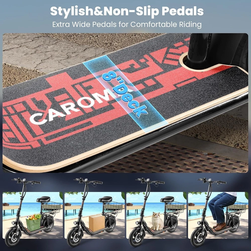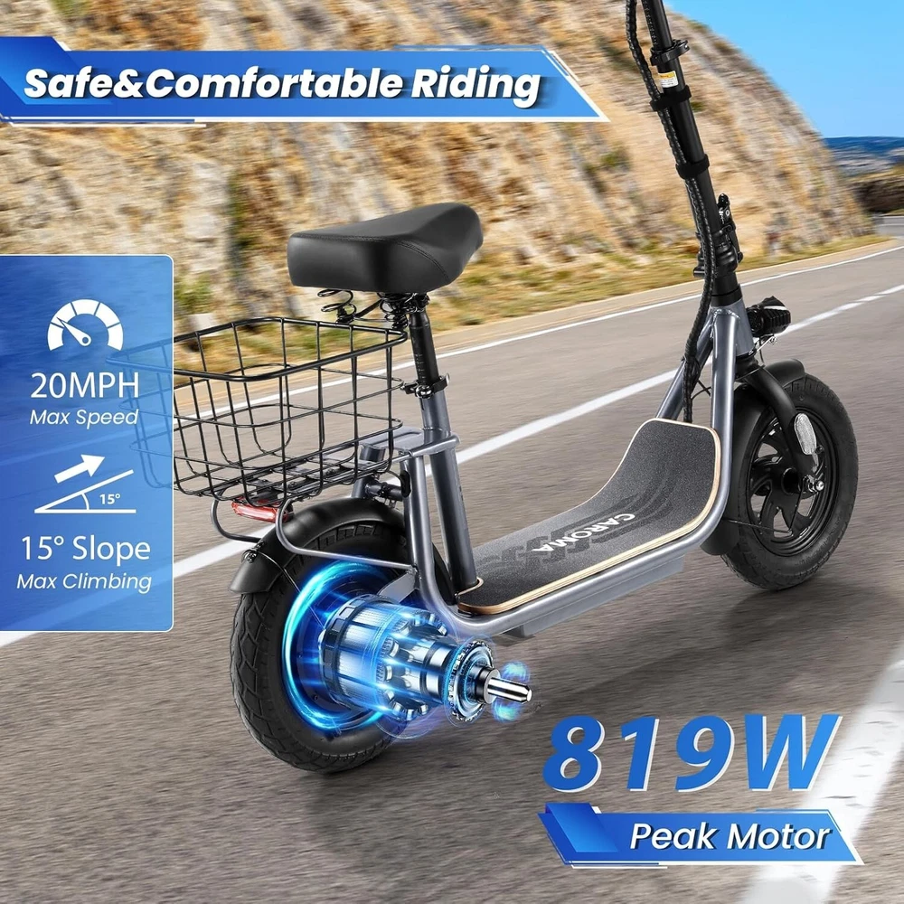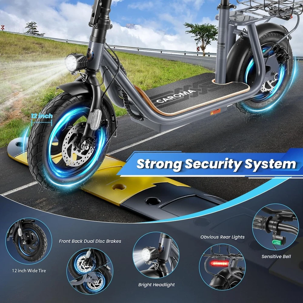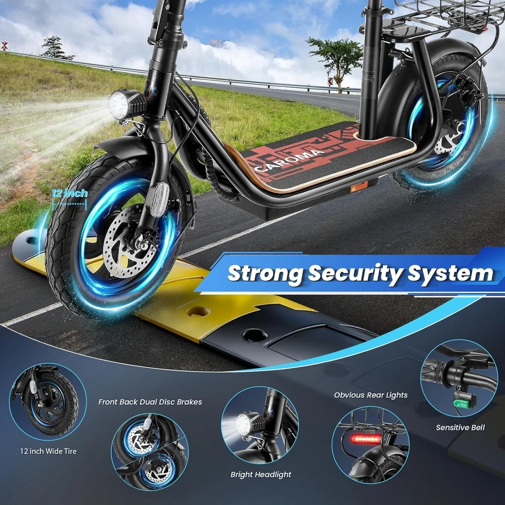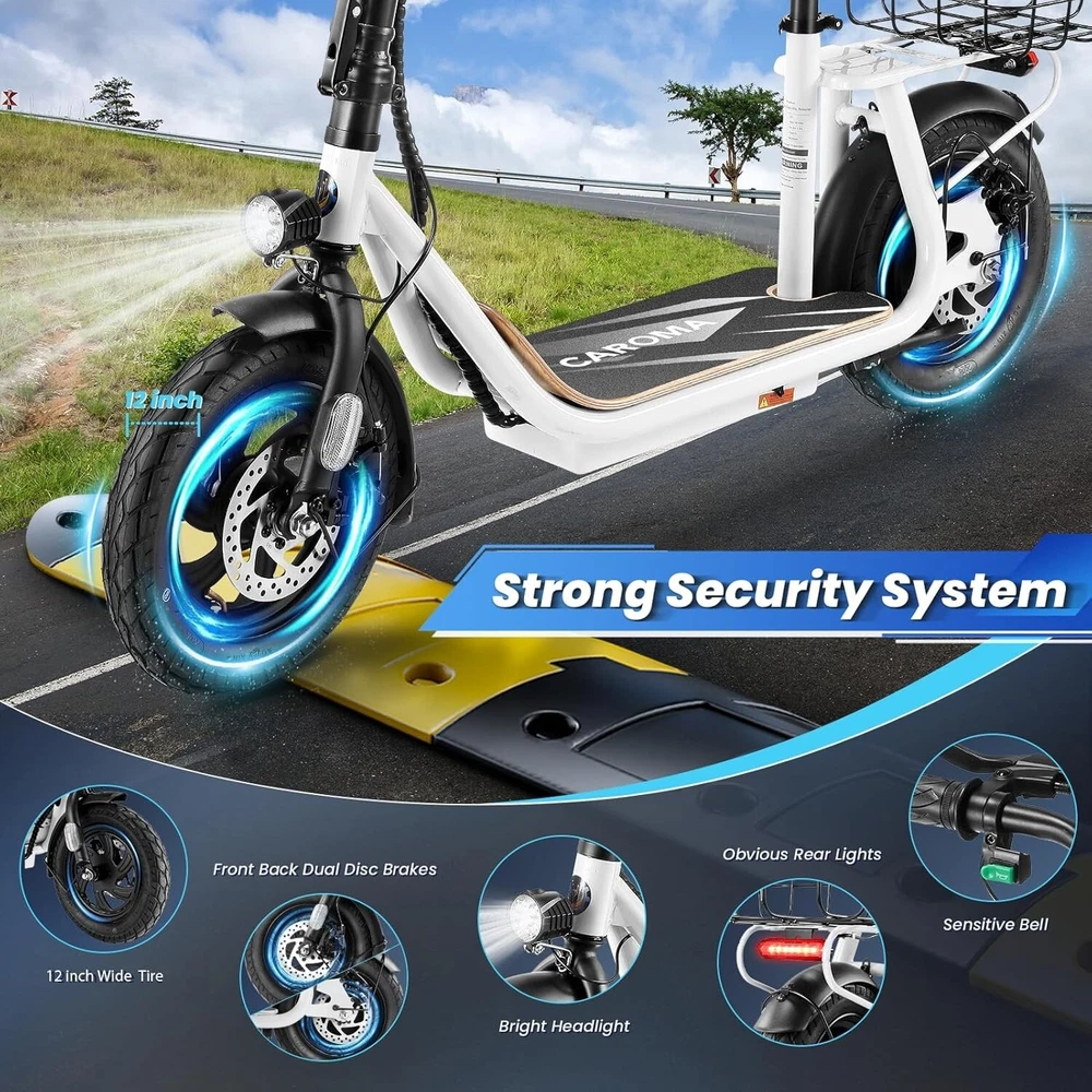 Product Description About this item Powerful Motor & Large Battery: Equipped with 1200W peak motor, Caroma electric scooter can climb 20° slopes and reach speeds up to 20MPH. Its 500WH battery charges in 7 hours and provides a 30-mile range, making it an ideal travel partner for commuting. Safe Riding with Caroma Electric Scooter: Smooth dual disc brakes+responsive horn+bright front&rear lights, allowing for a smooth and gradual stop and lighting up your way at night. Providing safe riding conditions, the E scooter electric is also suitable for beginners. Comfortable and Smooth Riding: Caroma electric scooter adults equipped with 8" WIDE DECK for comfortable foot placement, 12" WIDE TIRES for shock absorption when crossing obstacles, and SOFT & AJUSTABLE SEAT for comfortable long-term riding. Meets Various Commuting Needs:With a 264-lb max load and adjustable seat and handlebar, this motorized scooter for adults suits various body types. Its detachable basket, foldable handle, and lightweight frame make it easily fitting into a trunk, perfect for commuting, shopping, and outings. Easy Assembly & After-Sales Guarantee:The detechable scooter for adults arrives 90% assembled, complete with an instruction manual and installation tools, making setup a breeze. If you experience any issues such as motor failure, charging problems, or missing accessories, please contact us promptly. Caroma is committed to providing you with top-notch service.