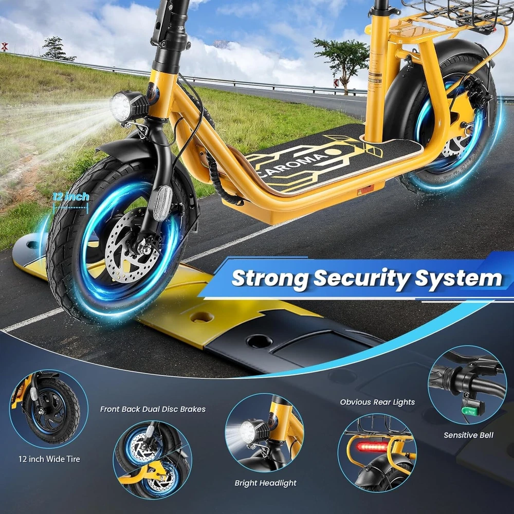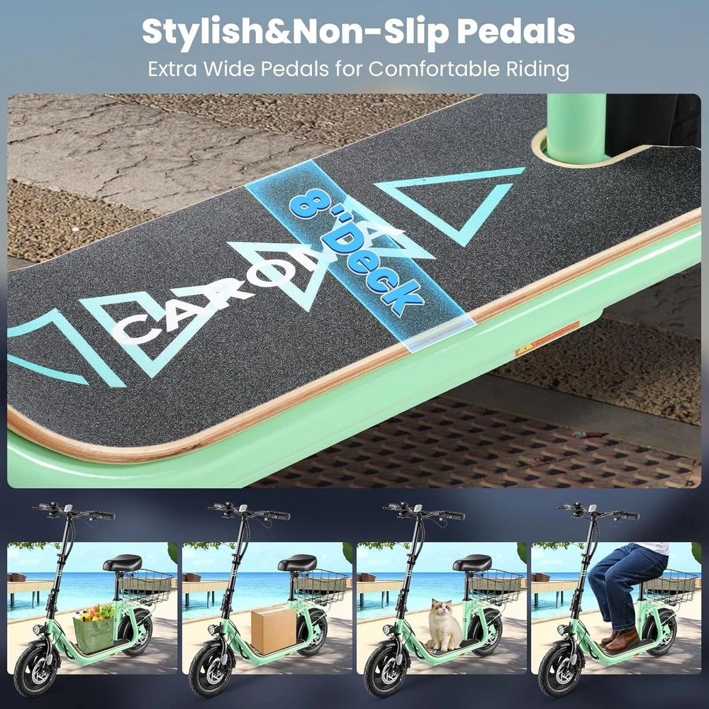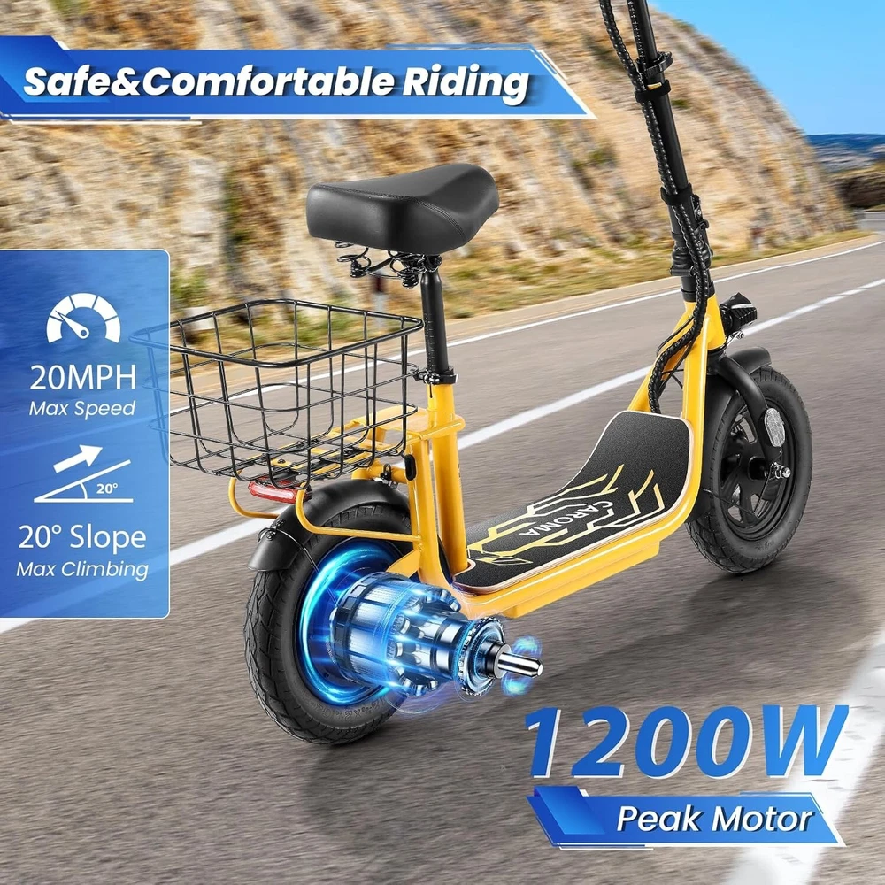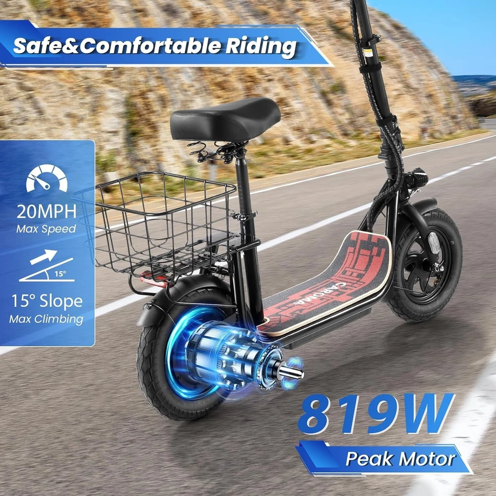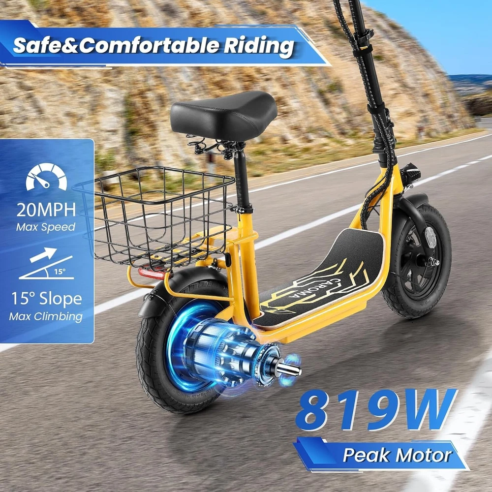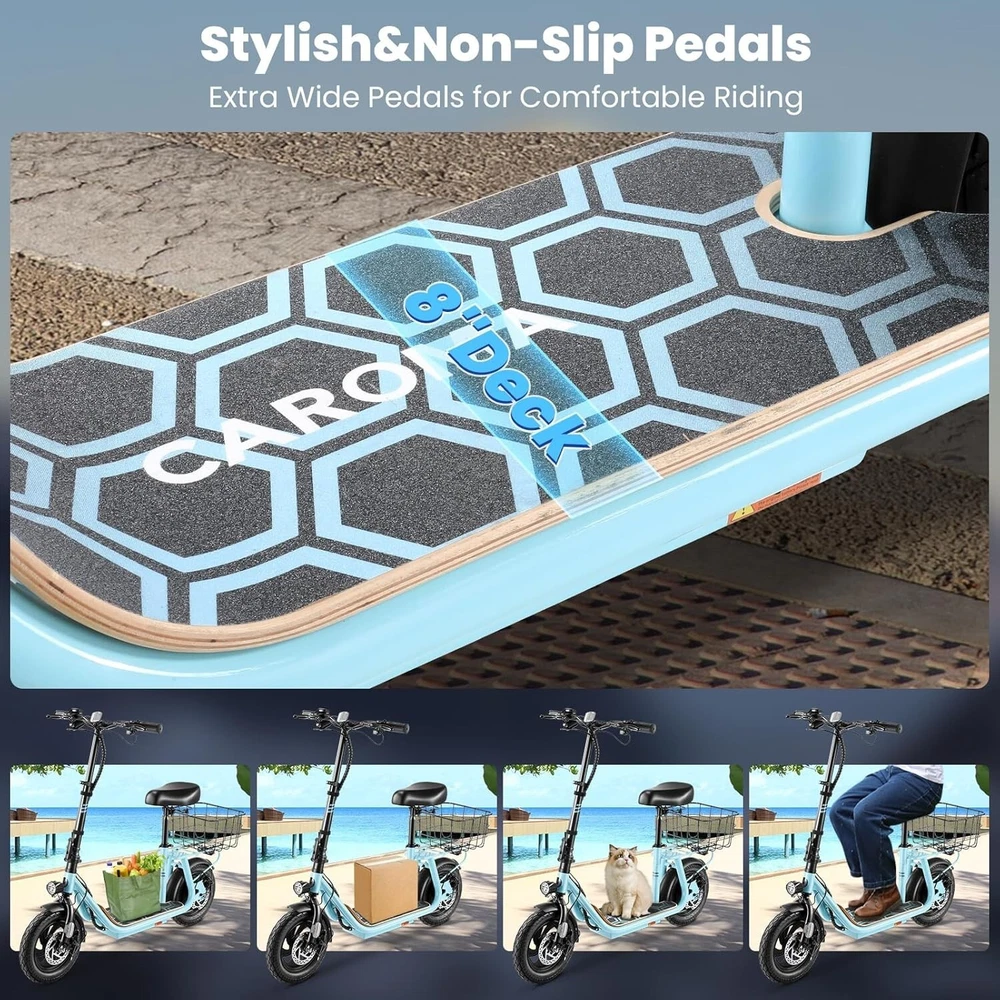 Product Description About this item Powerful Motor & Large Battery: Equipped with 1200W peak motor, Caroma electric scooter can climb 20° slopes and reach speeds up to 20MPH. Its 500WH battery charges in 7 hours and provides a 30-mile range, making it an ideal travel partner for commuting. Safe Riding with Caroma Electric Scooter: Smooth dual disc brakes+responsive horn+bright front&rear lights, allowing for a smooth and gradual stop and lighting up your way at night. Providing safe riding conditions, the E scooter electric is also suitable for beginners. Comfortable and Smooth Riding: Caroma electric scooter adults equipped with 8" WIDE DECK for comfortable foot placement, 12" WIDE TIRES for shock absorption when crossing obstacles, and SOFT & AJUSTABLE SEAT for comfortable long-term riding. Meets Various Commuting Needs:With a 264-lb max load and adjustable seat and handlebar, this motorized scooter for adults suits various body types. Its detachable basket, foldable handle, and lightweight frame make it easily fitting into a trunk, perfect for commuting, shopping, and outings. Easy Assembly & After-Sales Guarantee:The detechable scooter for adults arrives 90% assembled, complete with an instruction manual and installation tools, making setup a breeze. If you experience any issues such as motor failure, charging problems, or missing accessories, please contact us promptly. Caroma is committed to providing you with top-notch service.