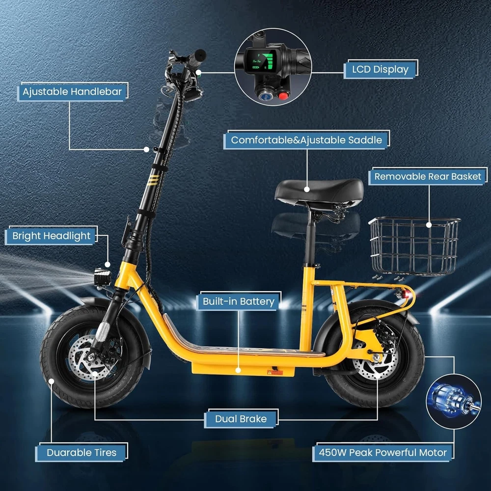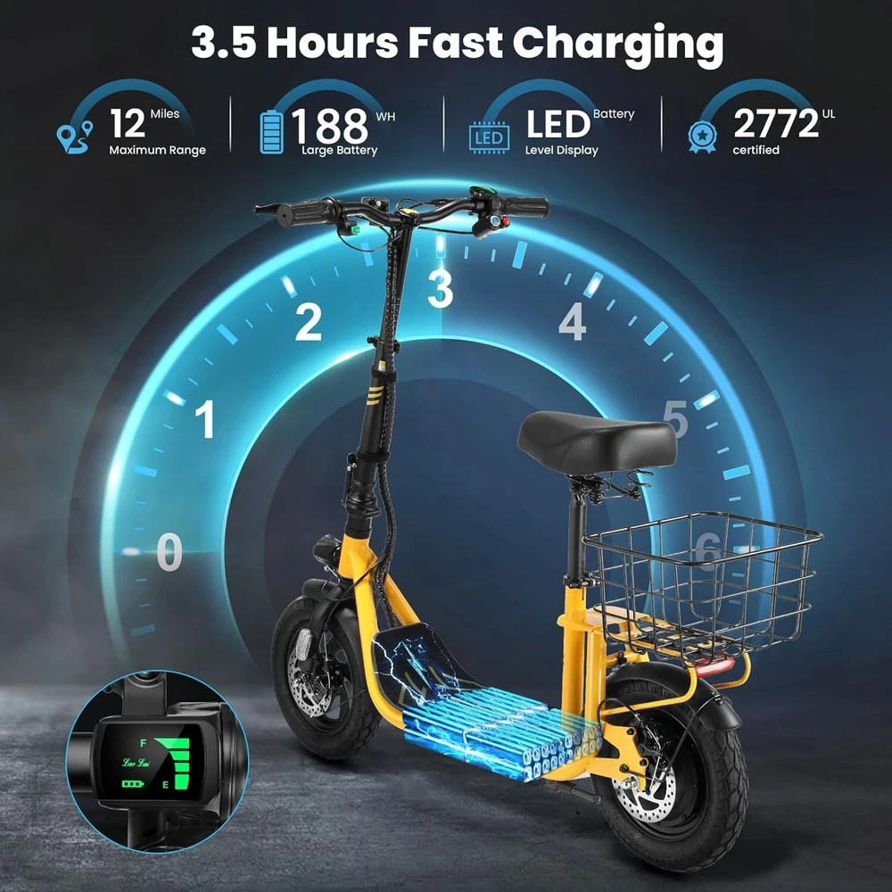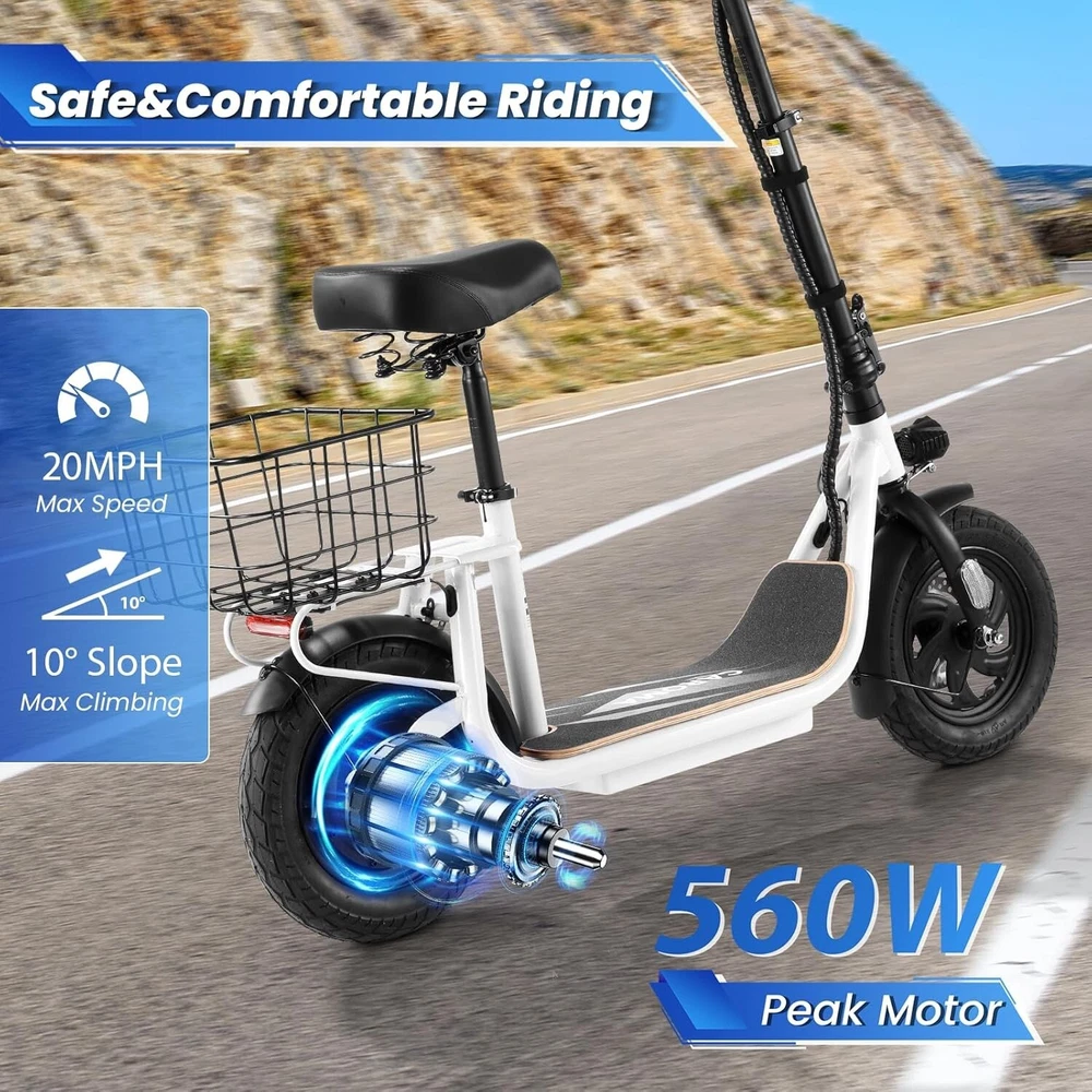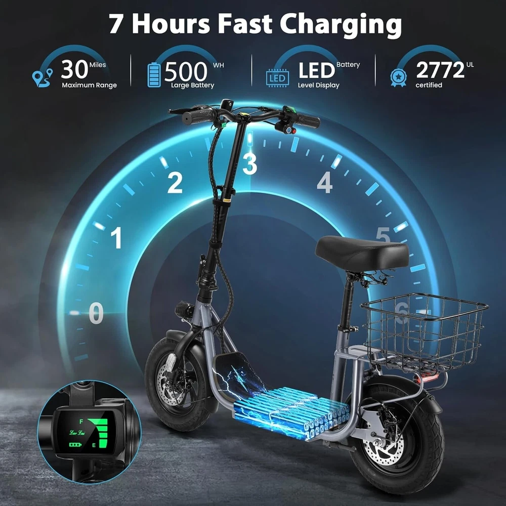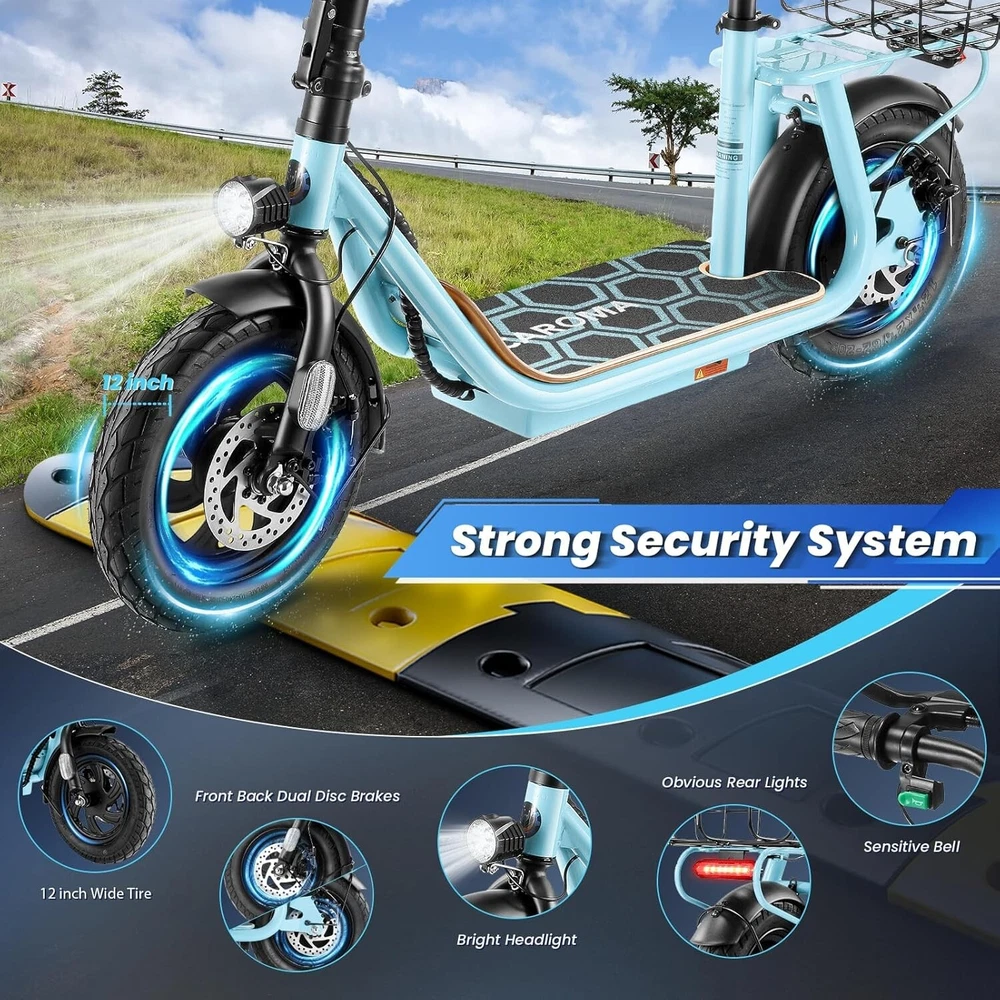 Product Description About this item Powerful Motor & Large Battery: Equipped with 1200W peak motor, Caroma electric scooter can climb 20° slopes and reach speeds up to 20MPH. Its 500WH battery charges in 7 hours and provides a 30-mile range, making it an ideal travel partner for commuting. Safe Riding with Caroma Electric Scooter: Smooth dual disc brakes+responsive horn+bright front&rear lights, allowing for a smooth and gradual stop and lighting up your way at night. Providing safe riding conditions, the E scooter electric is also suitable for beginners. Comfortable and Smooth Riding: Caroma electric scooter adults equipped with 8" WIDE DECK for comfortable foot placement, 12" WIDE TIRES for shock absorption when crossing obstacles, and SOFT & AJUSTABLE SEAT for comfortable long-term riding. Meets Various Commuting Needs:With a 264-lb max load and adjustable seat and handlebar, this motorized scooter for adults suits various body types. Its detachable basket, foldable handle, and lightweight frame make it easily fitting into a trunk, perfect for commuting, shopping, and outings. Easy Assembly & After-Sales Guarantee:The detechable scooter for adults arrives 90% assembled, complete with an instruction manual and installation tools, making setup a breeze. If you experience any issues such as motor failure, charging problems, or missing accessories, please contact us promptly. Caroma is committed to providing you with top-notch service.