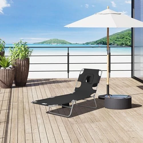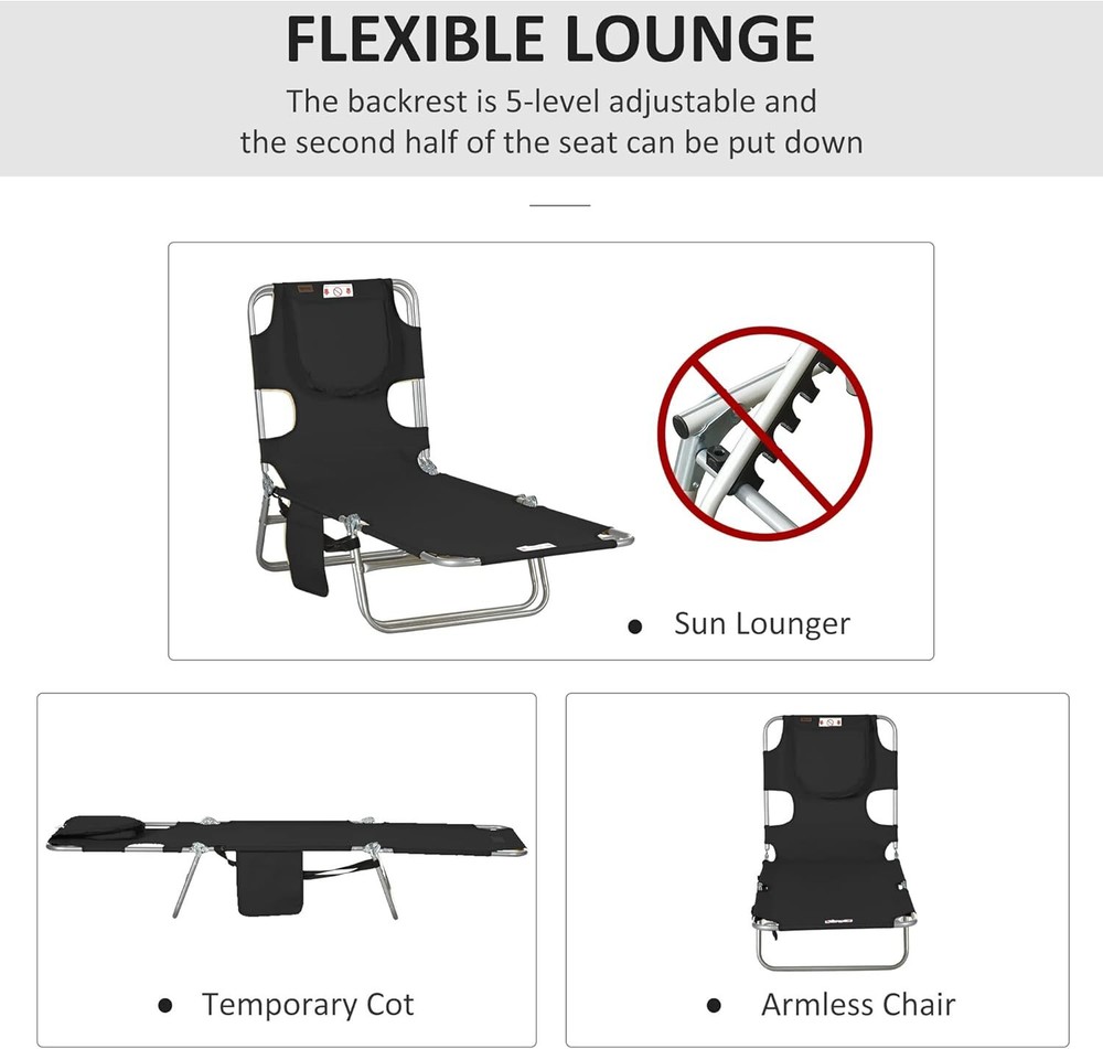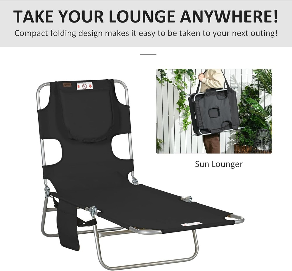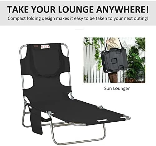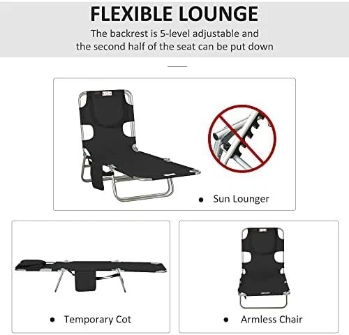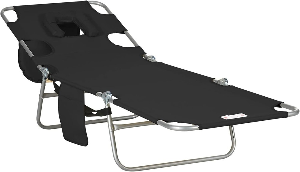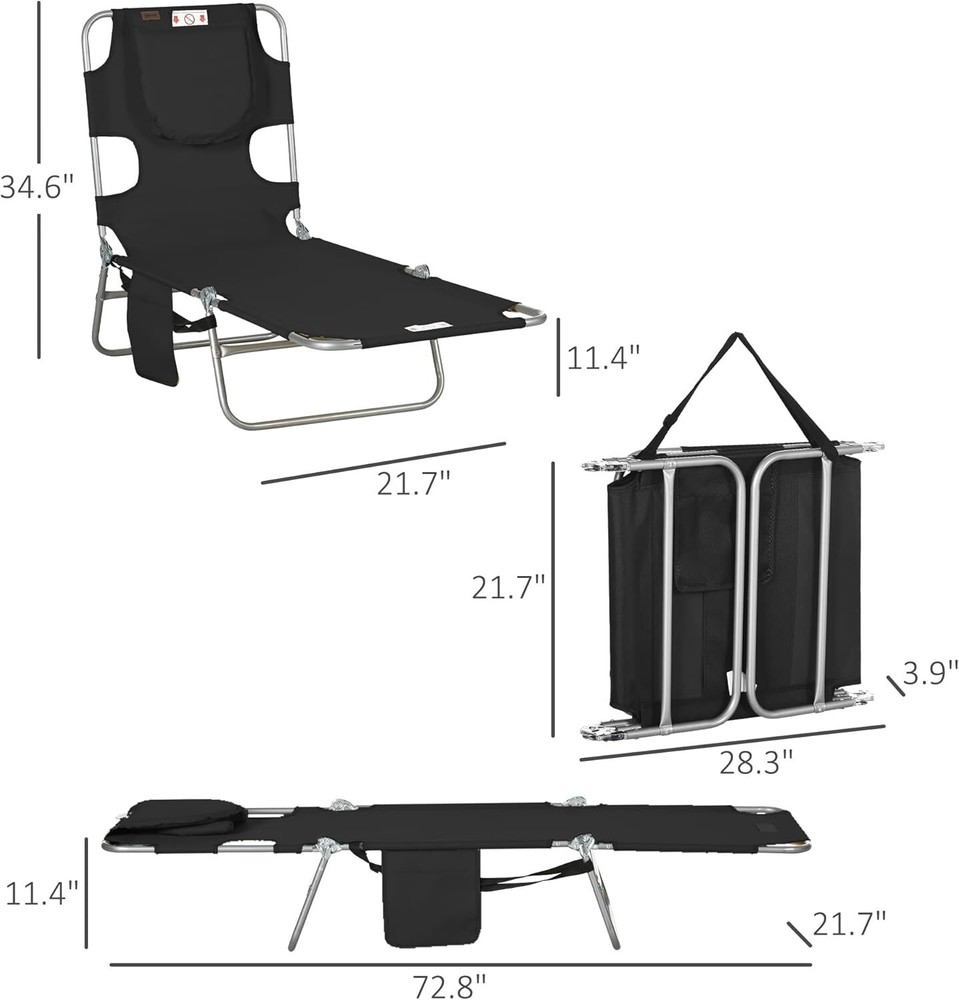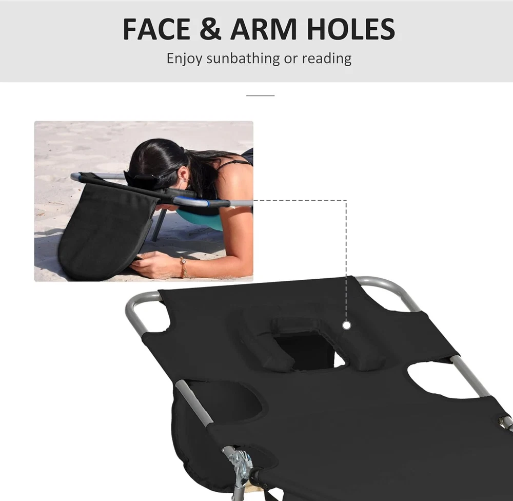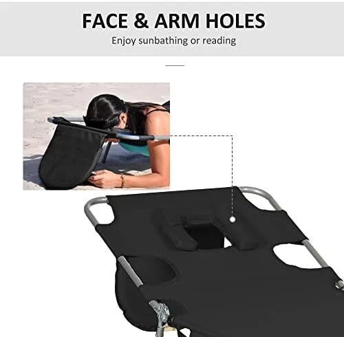Free eBay listing template designed by dewiso.com Outsunny Folding Beach Lounge Chair with Face Hole and Arm Slots, 5-Level Adjustable Sun Lounger Tanning Chair with Pillow for Patio, Garden, Beach, Pool, Black FREE AND FAST SHIPPING! About this item Reclining & Face Hole: The adjustable backrest of our patio lounge chair allows you to choose from 5 reclining angles with a pillow for padding and holes for your head and arms to let you read as you lie face down. Outdoor Tanning Chair with Storage: Feel free to relax fully, knowing everything is in its proper place. Our outdoor foldable tanning chair has a pocket to keep your phone, book, or other items safe and organized Foldable Design: With the tri-fold design, this patio lounger is space-saving for storage in the garage and easy to travel with, fitting in the trunk of your car. Outdoor Lounge Chair: The outdoor-ready combination of powder-coated steel and tough Oxford fabric allows our beach lounge to endure water while still maintaining a 264 lbs. weight capacity. Outdoor Chaise Lounge Chair Info: Overall Dimensions: 72.8" W x 21.7" D x 11.4" H (Fully Reclined); Folded Dimension: 28.3" L x 21.7" W x 3.9" H. Weight Capacity: 264 lbs. Product We offer a 30-Day Return Policy on items which you are not completely satisfied with. You have the option for a full-refund or an exchange of the item. No returns are available on items shipped outside of the US . Shipping We offer Free Shipping to the US and ship within 2 business days of payment, usually sooner. We use UPS express shipping. That's why your products are usually delivered within 3 days . Contact We try our very best to make sure every customer is completely satisfied. If there's a problem , message us! We're happy to help. 24/7 live chat available.