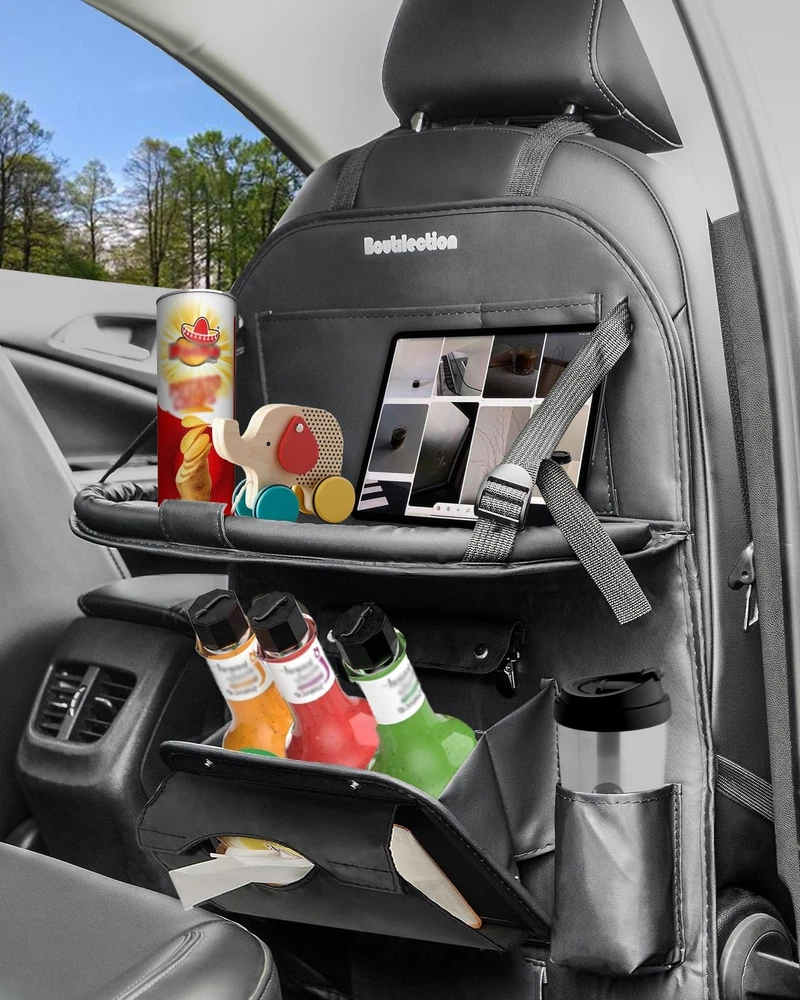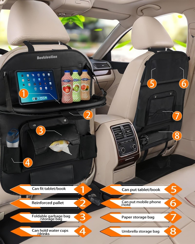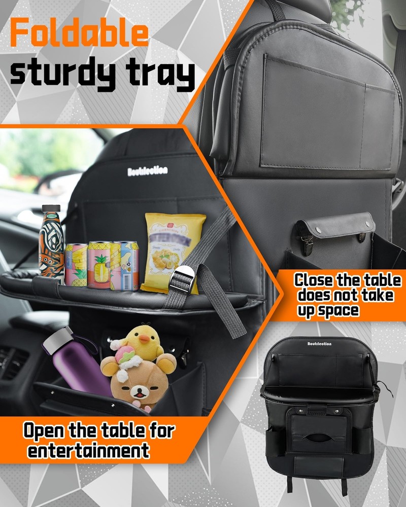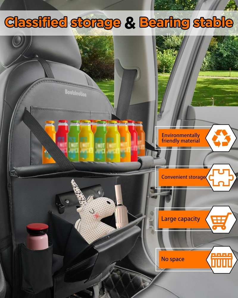 PU Car Organizer Backseat Holder, with Foldable Tray, Storage Box, Kids Organizer (1) - Buy Now with Fast Shipping! PU Car Organizer Backseat Holder, with Foldable Tray, Storage Box, Kids Organizer (1) Product Details Specific Uses For Product: Automobiles Material: Leather Special Feature: Crack Resistant, Leak Resistant, Abrasion Resistant, Foldable, Stain Resistant Color: black Brand: Boutilection Finish Type: Polished Product Dimensions: 0.2"D x 18.5"W x 25.6"H Shape: Rectangular Unit Count: 1.0 Count Number of Items: 1 Specific Uses For Product: Automobiles Material: Leather Special Feature: Crack Resistant, Leak Resistant, Abrasion Resistant, Foldable, Stain Resistant Color: black Brand: Boutilection Finish Type: Polished Product Dimensions: 0.2"D x 18.5"W x 25.6"H Shape: Rectangular Unit Count: 1.0 Count Number of Items: 1 Manufacturer: Boutique Trade Item Weight: 1.9 pounds Country of Origin: China Item model number: L48W34 Finish: Polished Special Features: Crack Resistant, Leak Resistant, Abrasion Resistant, Foldable, Stain Resistant Included Components: 1 Pack of Seatback Organizers Batteries Included?: No Batteries Required?: No Date First Available: August 6, 2024 Key Features ✅ Upgrade your car seat with this sturdy and durable car seat organizer. It provides ample storage space for all your essentials, including tablets, bottles, and snacks, keeping your car neat and tidy. ✅ Quality feeling. It is made of leather instead of cheap materials, and has a sturdy construction, ensuring durability and reliability. ✅ Say goodbye to messy car drives with these reinforced kick mats. They easily attach to the back of your car seats, keeping them clean and protecting them from spills and stains. They are eco-friendly and easy to clean, ensuring a neat and tidy car interior. ✅ Keep your kids entertained during long drives with the adjustable tablet holder and toys pockets. It's easy to install and foldable, making it perfect for family trips and long drives. ✅ Expand your space with this car seatback organizer. It features multiple pockets , cup holders, and multifunctional container that can be used as a storage or a garbage can, providing ample room for all your belongings and keeping them within reach. Product Description