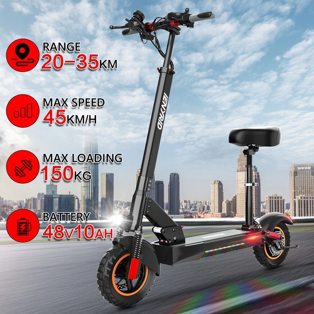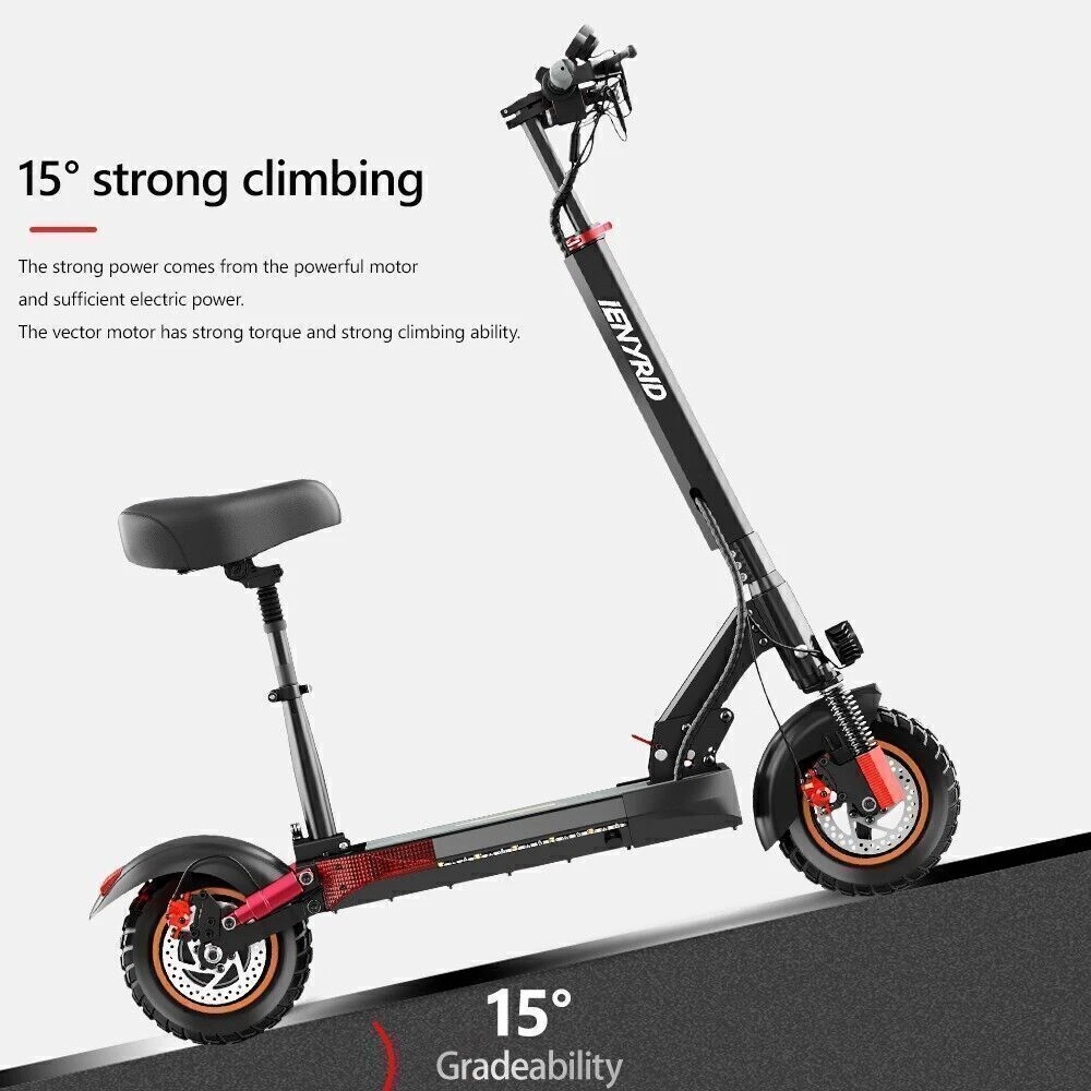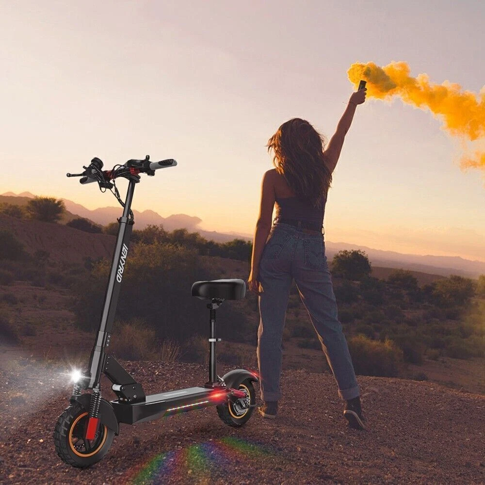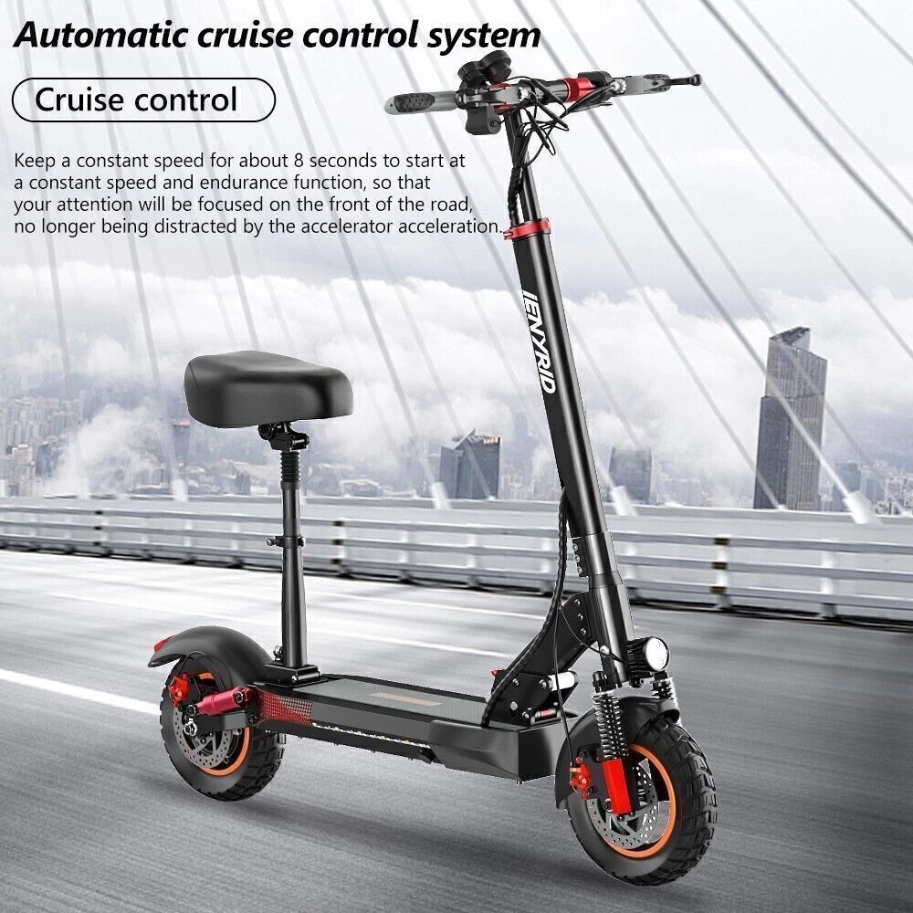 IENYRID M4 600W foldable electric scooter designed to let you travel in style and serves as fun and environmentally friendly way to explore the scenery! This electric scooter equips an upgraded 600W hight speed powerful motor, owning a 28 MPH max speed and a range of 31 miles, max load up to 330 lbs. Detachable seat design, freely switch 2 riding modes, so cool and so convenient. The excellent braking system makes the brakes respond more quickly and improves the safety when riding. The front and rear shock absorbers provides maximum rider comfort. With 1-second foot-actuated folding, the electric scooter can be quickly collapsed. After folding, the IENYRID electric scooter can be carried one-hand, making it a perfect commute companion. Cruise at a constant speed makes you more relaxed as well. The adult electric scooter is equipped with wider foot anti-slip pedal for larger feet support, high lumen head lamp for safe night riding, and clear LED display for relaxing riding. and clear LED display for relaxing riding. Let's live an active lifestyle and want to refine your traveling; or you are a novice of electric scooter, iENYRID M4 electric scooter for adults is your right one! Advantages of Product: Equips an upgraded powerful motor,owning a 28 MPH max speed and a range of 31 miles, max load up to 330 lbs. Dual front and rear disc brakes, quick respond braking also safer for emergency braking. Come with a soft seat and dual shock absorption system for your comfort driving. With 1-second foot-actuated folding, easy to carry and storage. Cruising at a constant speed makes you more relaxed, 3-speed modes of your choice. Clear LCD display shows the battery, headlight, cruise indicator, gear indicator, and total mileage for all your need. Multi-functional buttons achieve to change the speed, lights, and cruising modes easily. Conquers hills with ease. Detachable seat design freely 3 riding modes. Specification: Body: Aluminium alloy Motor: 600W Brushless Motor Battery: 48V 10AH Lithium Battery Adapter: Incoming 100-240 V, Outgoing 54.6 V 2A Brakes: Mechanical disc brake Tires: 10" Off-road Tires Lights: Front LED headlight, turn signals and taillight Max. loading: 330 lbs Max. Speed: 25 - 28 mph Maximum Range: 18-31 miles without recharging Charging time: 6 - 8 hours Gradeability: 10-25 degrees Product weight: 52.69 lb Package contents: 1 x IENYRID M4 Electric scooter. 1 x Portable Folding Handle 1 x Seat 1 x Tool set. 1 x Main charger. 1 x User manual About this item IENYRID M4 800W 🛴【Powerful Motor】IE-M4 electric scooter is equipped with 800W brushless motors which can reach a max speeds of around 25-28mph, this e-scooter can make your journey from home to the office, school or just around the neighbourhood 10 times less stressful. Experience the joy, fun and freedom of having an easy, safe and sound travel. 🛴【Smooth Ride】IE-M4 electric scooter features 10inch On-road and offroad pneumatic tires, disc brakes, comfy handlebars,easy to set up, use and understand, it can help you save time and money by providing you a unique and practical means of wheeled transport,enjoy wonderful rides conveniently. 🛴【Long Battery Life】Travelling long distances you want reachs up to 25-31 miles,and enjoy fast chargers,IE-M4 electric scooter for adults is a great public transport, this e-scooters is great for commuting to and from work each day, while allowing you to access recreational areas such as the beach on a weekend. 🛴【Safety】Foldable IE-M4 electric scooter with seat have unergone the UL2272 test processes,built in battery management system which make it a safe prosonal transport. what's more, bright headlights, simple headset adjustment, simple to learn and use ,the comfortable ride easily tackled every route. 🛴【Compact Size】IE-M4 electric scooter is foldable and easy to store anywhere.In just a matter of seconds, you can fold it into more compact sizes. Furthermore, the stylish and elegant designs make it ideal companions in your daily commute.it is easy to carry up stairs, stow under a desk or hide away in a closet. 🛴【Stable and Durable】 IE-M4 scooter excels in acceleration and cornering and is extremely smooth. Built with sturdy and durable materials, with 10-inch tires and an overall frame, it ensures you enjoy a stable and comfortable riding experience during your commute.