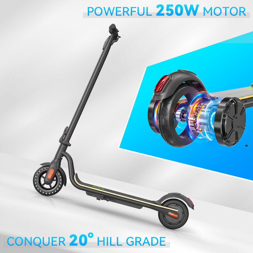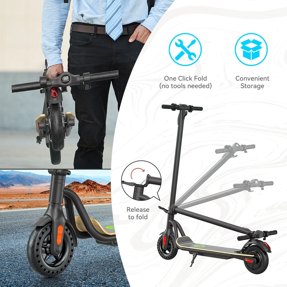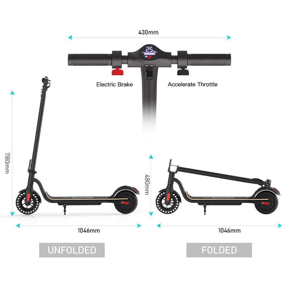 NOTE:The appearance of the product you receive may vary slightly from the image shown due to differing production batches! Main features: LONG RANGE BATTERY LIFE - Powerful 250W motor and 7.8 Ah/36V lithium battery pack that supports a speed of up to 15.5 Mph with a range up to 14 Miles. Updated large-capacity battery life, designed for commuters and longer distances. 8.0" HONEYCOMB & SOLID TIRES - Shock-absorbing rubber tires offer a smooth ride even over bumpy surfaces. PORTABLE FOLDING DESIGN - Electric scooter can be folded easily in 3 seconds with quick folding latch for easy carrying and storage. BATTERY INDICATOR AND LIGHTS - Battery indicator keeps to track battery life. Ultra bright LED headlight and taillight. Fast recharging about 5 hours. GEAR SHIFT SETTING - 1st gear for a 7.5 Mph comfortable ride or 3rd gear to get the 15.5 Mph fast experience. Extremely fun to ride and end boring commutes. Specification: Brand: Megawheels Model: S10 Dimension: Unfolding 105 x 43 x 118 cm; Folding: 105 x 43 x 48 cm Net Weight: 11.9kg Color: Black Frame Material: Aluminium Tires: 8.0" Honeycomb Front Tire & Solid Rear Tire Max Load: 100kg Max speed: 25KM/h Speed level: Gear 1--Max 10km/h ; Gear 2--Max 20km/h; Gear 3--Max 25km/h Mileage: 17-22km Grade Ability: 20 degree slope Working Temperature: -15°C-50°C Storage Temperature: -20°C-25°C Mode Type of Motor: Brushless hub motor Battery Type: High quality lithium battery Battery Capacitiy: 7.8 Ah Battery Voltage: 36V Charger Input Voltage: 100V-240V Charger Frequent: 50Hz/60Hz Charging time: 5 hours Package Contents: 1 * Folding Electric Scooter 1 * Battery Charger 1 * User's Manual Before use, please kindly read the schematic diagrams and assembly steps of manual to assemble the front wheel: 1. Step on the base, lift the fork firmly to remove the base. 2. Remove the rubber plugs on both sides of the front fork, and unscrew the front axle with the two 6mm hexagon wrenches in the package. 3. When installing the front wheel (please pay attention to the direction of the tread of the tire, as shown in the lower right or the inflation port to the right), and tighten the front wheel axle. 4. Plug back the rubber plugs on both sides of the front fork. Riding Skills: -Put your foot in the front of the scooter and the other foot on the floor before riding. -Make sure that the riding route is smooth. -Slide forward with the food standing on the floor before starting (like riding the scooter without power). -Immediately press the acceleration button and lean forward to avoid falling over backward due to inertia, so that the electric scooter will enter the working status. -Avoid pressing the handle with your body in the acceleration and deceleration process. Put one foot ahead and the other behind (like on the sliding plate/surfboard, put one foot ahead and the other behind by 70-90 for better comfort). -Turning – The turning principle of the electric scooter is the same with that of surfboard/sliding plate/skis. The handle shall be balanced with the body. Observe and make sure that turning is safe before turning. Tips: Before riding the scooter, please put one foot on the scooter deck and the other foot on floor and push the scooter forward by kicking the floor for some distance, in this way, the scooter will get some impulse to run forward. Note: This products have been certified under UL2272 safety standards.