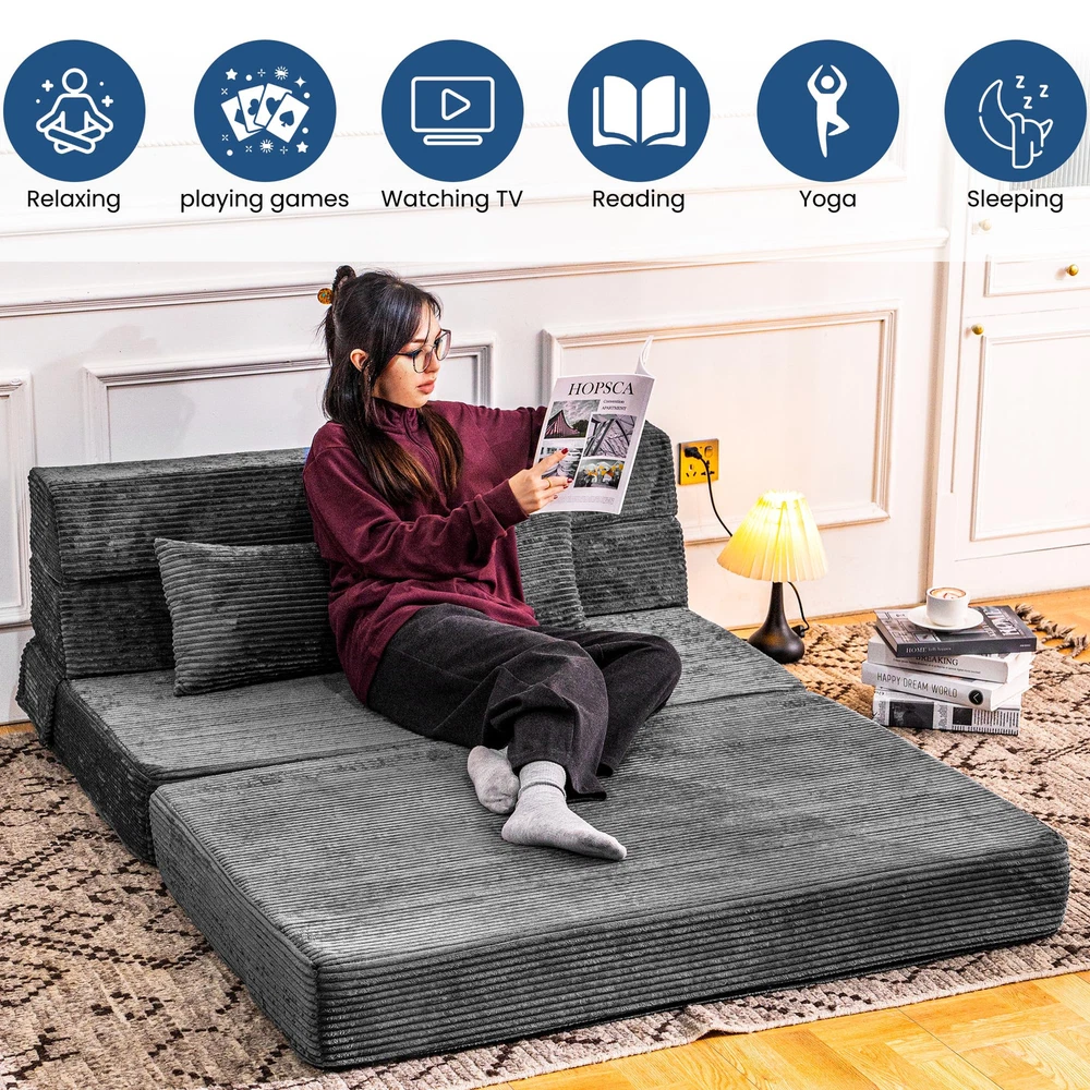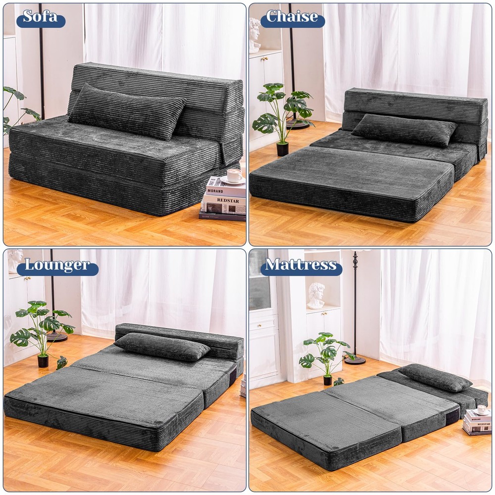 【Premium Fabric & Foam】This foldable sleeper sofa features High-Density foam, is soft and uniform, rebounds quickly, and is not easily deformed. The high-quality corduroy fabric is soft, breathable, and skin-friendly, ensuring a cozy seating experience for sitting, leaning, or lying down. 【Comfortable & Multi-Scene Use】Folding sofa bed is easy to move in any room and can be switched from a futon sofa to a sleepover guest bed, whether you want a sleeper sofa,fold out bed or folding mattress sofa. Perfect for places with limited space, like living rooms, guestrooms, apartments, loft, bedrooms, playrooms, college dorms, etc. 【Washable & Removable & Convertible】 Our foldable sleeper sofa has a smooth zipper and the cover is removable and washable. The folding mattress comes in four forms and can be easily converted into a sofa, chaise longue, chaise lounge, and mattress to meet the different needs. Velcro straps on both sides of the couch secure the backrest to the seat cushion. 【Ergonomic Design】The convertible sofa bed fits body curve perfectly and the included pillow can provide better support for your low back, so you won’t feel tired even seating or laying on this Futon Furniture for a long-time. High density memory foam sofa bed is very comfy, soft with great support, so you won't "sink in" or feel the hard floor. 【No Assembly】This lazy futon chair, with modular design, so there is no need to install, just pull it out of the box and use it. We use vacuum packaging mode for transportation. We recommend that you please allow 24-72 hours for the folding sofa bed to return to its complete shape.