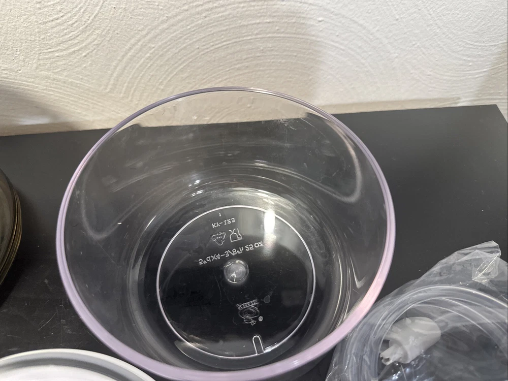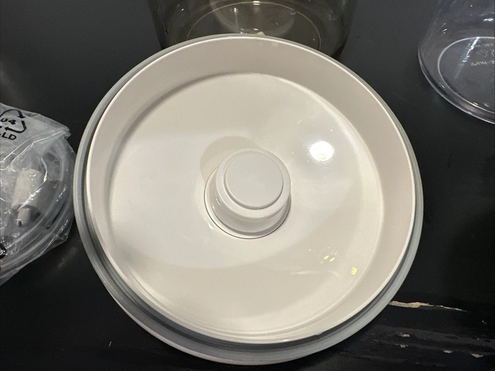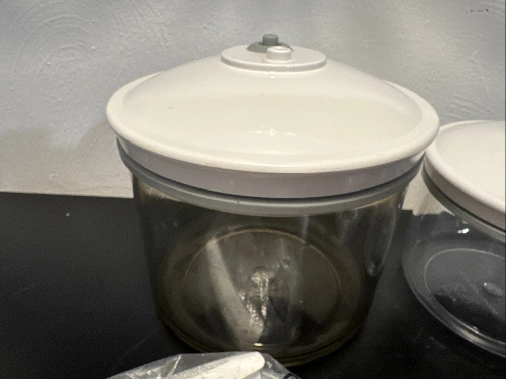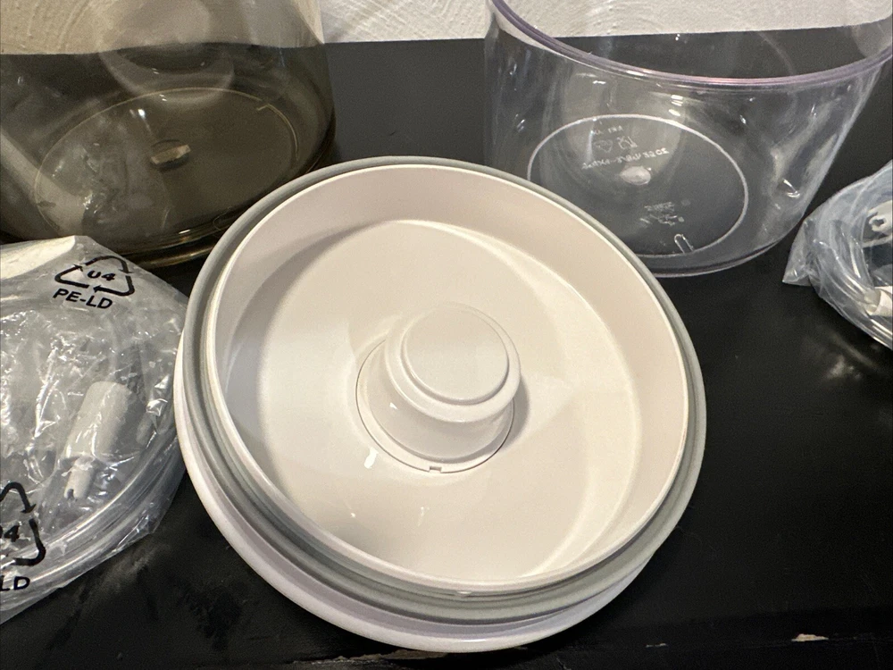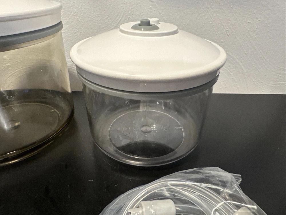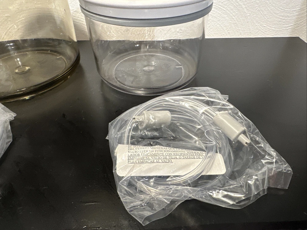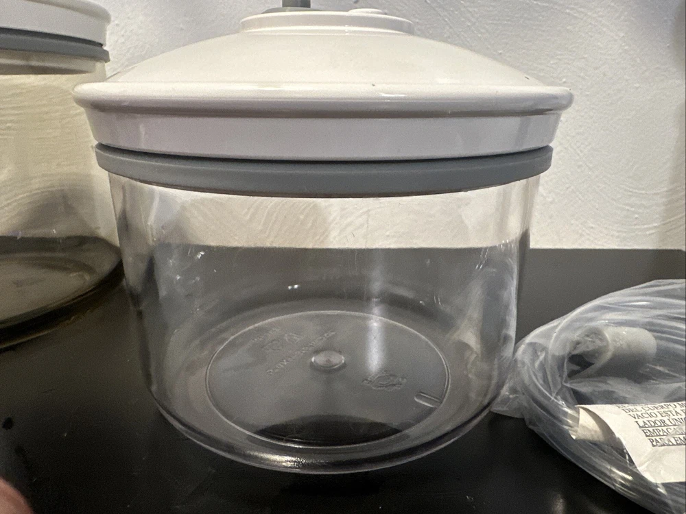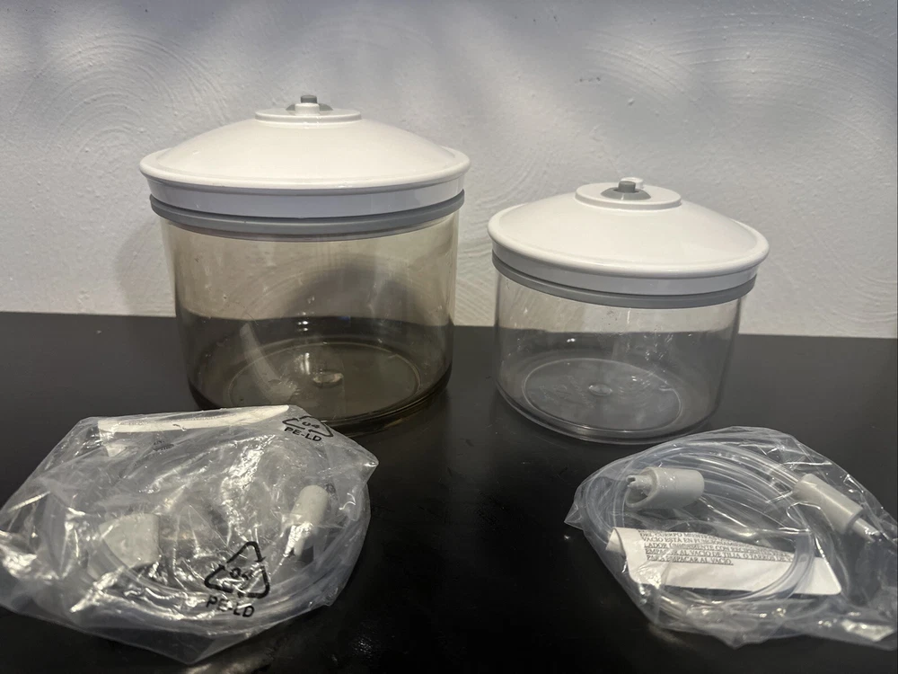 2 New Foodsavers Vacuum Canisters, 1 is a 25 oz and is clear and 1 is 50 oz and a light smoke color. Both are New. Both come with new hoses. In perfect new condition. FREE SHIPPING PLEASE look at pictures good, this is the exact item you will receive. From a smoke and pet free home ****PLEASE make sure your shipping address is correct, I will not reship free an item that has been return to me because of incorrect address ***************