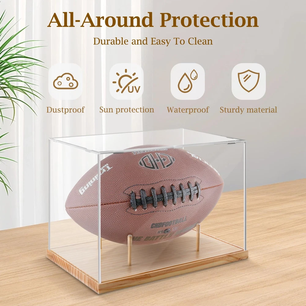 Football Display Case Full Size:Acrylic box inside size: 11.7”x 7”x 7.4“, wooden base size:12.2”x 7.48”x 0.59“. This football case size is designed to fit most footballs. It is recommended to measure the size of the football before buying. High Transparent Acrylic: Football case display clear is made of the highest quality acrylic material, the vision is clear and the high transparency makes the collection in the box achieve a better display effect. Antioxidant Protection:Displaying your memorabilia, keeping clean from dust, but also antioxidant and UV protection, can well protect the items inside from the external environment, protect your signature collection from fading. Easy Assembly:Display case is composed of 4 clear acrylic panels and a wooden base.The installation only needs to insert the acrylic panel into the card slot. The base xith 4 small detachable wood sticks. (Peel off the protective film before use) Multi functional Applications:Wooden base football display box not only meets your storage needs, but also adorns your space. You can use it to your models, trophy, perfume and plaything etc. It is the best choice for collectors and sports enthusiasts.