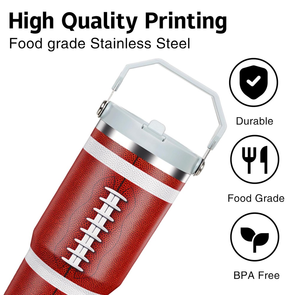1 [Versatile On-the-Go Tumbler]: Our versatile Football 30 oz flip straw tumbler is perfect for a variety of drinks, whether you're sipping water, smoothies, or iced coffee. With a built-in handle and flip straw, it offers convenient portability and easy sipping. Just pour in your favorite beverage and enjoy hassle-free hydration wherever you go! [Ergonomic Leak-Proof Football Bottle]: Our flip top water bottle is designed to fit most car cup holders and features an ergonomic rotating handle for easy mobility. The Flip Straw function makes sipping effortless, and the leak-proof seal ensures a secure closure with just a snap. [Durable, Stylish Football Tumbler]: Our 30 oz tumbler features a durable, fade-resistant coloring technique that maintains its elegant pattern without peeling over time. With a top handle, stylish flip straw, and unique design elements, it makes a thoughtful Football gift for anyone who enjoys refreshing drinks like water, coffee, or chilled smoothies. [Insulated Football Gift Tumbler]: A thoughtful Football gift for loved ones, this flip straw tumbler features a convenient flip-straw and rotating handle for enhanced convenience. Its double-wall vacuum insulation and durable 18/8 stainless steel construction keep your drinks ice-cold for hours. [Cold-Drink Insulation Tumbler]: This Football 30 oz flip straw tumbler is specifically designed to keep cold beverages cold for extended periods of time and provides exceptional insulation. It is not intended for hot liquids. To preserve the integrity of its surface and artwork, hand washing is highly recommended.