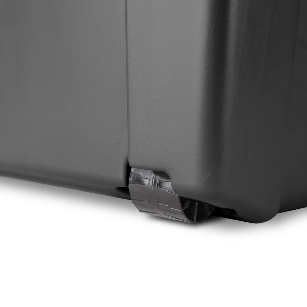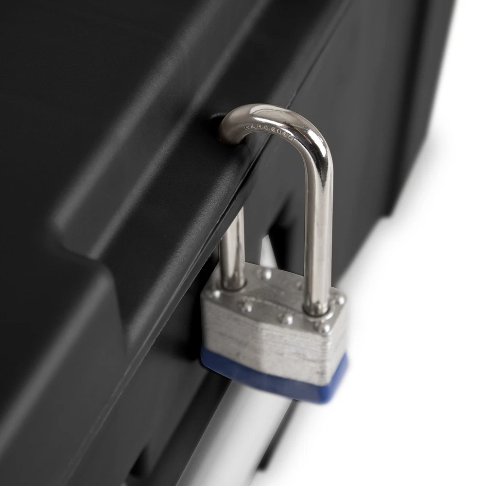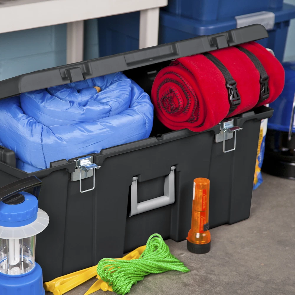 Need a durable and portable storage solution for camping or moving? The Footlocker is the ideal multi-purpose solution! It offers ample storage capacity and quality construction that is ideal for storing camping gear, sporting equipment, and more. Pack it up and use it to move into a dorm room, and keep your items concealed in your living space for easy access. Smooth rolling wheels and ergonomic handles allow for easier transporting of heavy loads. Use the integrated side handles or the full grip bail style handle when carrying lighter loads. The footlocker utilizes metal hinges and latches and accepts a standard-size padlock for added security. The overall assembled dimensions of this item are 31 1/4" L x 17 5/8" W x 13 7/8" H. Plastic Footlocker Adult Black Outside Dimensions: 31 1/4" x 17 5/8" x 13 7/8" Interior Dimensions at bottom: 26 1/2" x 13 3/4" x 12 3/8" Durable construction makes it the ideal solution for storing items in the garage, attic or basement or for transporting to camp or college Choose between the integrated handles on the sides of the Footlocker or the full grip bail handle when transporting Wheels allow Footlocker to be easily moved without having to carry it Features metal hinges and latches and accepts a standard size padlock for added security BPA-free and phthalate-free