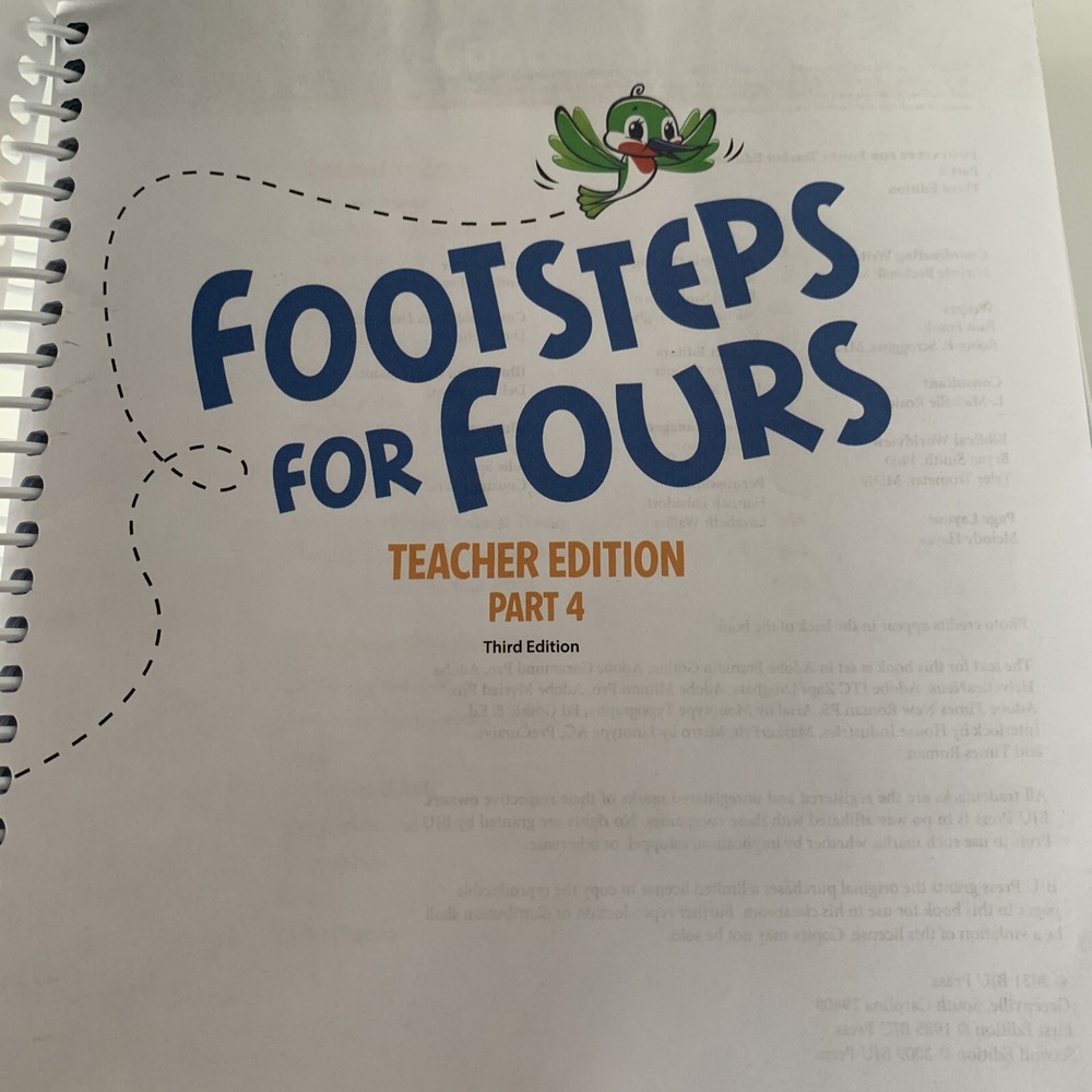 The product is a "Footsteps for Fours Teacher's Edition Part 4 - 3rd Edition" by BJU Press in English. It is a Spiral-bound book designed for preschool teachers at the beginner level. The teacher's manual features materials from BJU Press for classroom instruction and planning.