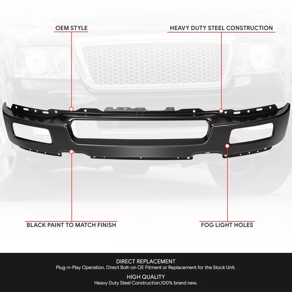 Welcome to Speed Daddy Store Home About Us Feedback Add To Favorites New Arrivals Ending Soon Contact Us For 04-06 Ford F150 Truck Steel Front Bumper Face Bar w/ Fog Lamp Holes Black Product Description Upgrade and replace your standard or worn Front bumper with a new one. Manufactured to be a direct replacement, installation is as simple as removing the old one and installing the new one. Specifics and Features : Plug-n-Play Operation, Direct Bolt-on OE Fitment or Replacement for the Stock Unit Black (Paint to Match) Finish Requires no Modification or Drilling With Fog Light Holes Includes : 1 X Front Bumper Notes : Compatible with: Ford F-150 2004-2006 Fits Models with Fog Lamps 100% Brand New Professional Installation is Highly Recommended Installation Instruction is NOT Included Shipping Payment Returns Terms & Conditions Feedback Contact Us DOMESTIC LOWER 48 US STATES: FREE SALES TAX: CA ONLY VERY IMPORTANT: Double check shipping address. We are not responsible for incorrect or undeliverable addresses. Please use Shipping & Payments tab on top of page for shipping details for your location. Shipping to PR, HI, AK and PO Box addresses will be charged the same as shipping to Canada. GU, VI, SAIPAN will be charged the same as international shipping rate. For Canada shipping please select the lowest price. We do not offer expedited shipping. US Territories such as GU, VI, SAIPAN will be charged the same as CANADA shipping rate. Transaction will be held until a full shipping amount received. Some of the packages cannot be delivered to a PO Box. Customer is responsible to ensure PO Box address given is deliverable by the shipping company. Package will be held until a valid physical address is provided. Customer assumes shipping charges incurred in shipping to undeliverable address. International buyers are responsible for all customs duties, taxes, and other applicable fees incurred by the country's customs/border regulations. Please contact customs for more information. We ship 98% of all orders the same or next business day after payment received/cleared. Please understand that once orders are shipped, we cannot control the transit times thereafter. Most orders will ship via USPS First Class/Priority Mail or FedEx/UPS or the best suitable carrier for the specific size of the product. We are not responsible for any changes to address after item has been shipped. Item will be shipped out within 24 hours after payment cleared, except for weekends and holidays. PayPal e-check takes 3-7 business days to be processed. We will not ship until an e-check has been cleared. 30 Days Free Returns, please notify us within 30 days after you've received your order. Please email us or call us to obtain a RMA (Return Merchandise Authorization) number from us, and have the RMA number written on the return package. Items to be returned must be in resalable condition. All returns are for refund ONLY. No exchange accepted. For emissions related items, please check with your local jurisdiction for emission specific requirements before purchasing. All items do not come with installation instruction unless otherwise specified. If item is questionable, please consult your local professional/mechanic before making purchase. Shipping DOMESTIC LOWER 48 US STATES: FREE SALES TAX: CA ONLY VERY IMPORTANT: Double check shipping address. We are not responsible for incorrect or undeliverable addresses. Please use Shipping & Payments tab on top of page for shipping details for your location. Shipping to PR, HI, AK and PO Box addresses will be charged the same as shipping to Canada. GU, VI, SAIPAN will be charged the same as international shipping rate. For Canada shipping please select the lowest price. We do not offer expedited shipping. US Territories such as GU, VI, SAIPAN will be charged the same as CANADA shipping rate. Transaction will be held until a full shipping amount received. Some of the packages cannot be delivered to a PO Box. Customer is responsible to ensure PO Box address given is deliverable by the shipping company. Package will be held until a valid physical address is provided. Customer assumes shipping charges incurred in shipping to undeliverable address. International buyers are responsible for all customs duties, taxes, and other applicable fees incurred by the country's customs/border regulations. Please contact customs for more information. We ship 98% of all orders the same or next business day after payment received/cleared. Please understand that once orders are shipped, we cannot control the transit times thereafter. Most orders will ship via USPS First Class/Priority Mail or FedEx/UPS or the best suitable carrier for the specific size of the product. We are not responsible for any changes to address after item has been shipped. Payment Item will be shipped out within 24 hours after payment cleared, except for weekends and holidays. PayPal e-check takes 3-7 business days to be processed. We will not ship until an e-check has been cleared. Returns 30 Days money back, please notify us within 30 days after you've received your purchased item. All return requests must be submitted through your eBay account. You have to obtain a RMA (Return Merchandise Authorization) number from us, and have the RMA number written on the return package. Buyers pay for return shipping fee. Items to be returned must be in resalable condition. All returns are for refund ONLY. No exchange accepted. Returns for refund are subject to a 20% restocking fee. Terms & Conditions For emissions related items, please check with your local jurisdiction for emission specific requirements before purchasing. All items do not come with installation instruction unless otherwise specified. If item is questionable, please consult your local professional/mechanic before making purchase. Feedback Contact Us Store Home About Us Feedback Add To Favorites New Arrivals Ending Soon Contact Us Need Help? Contact Us on eBay Subscribe to our New