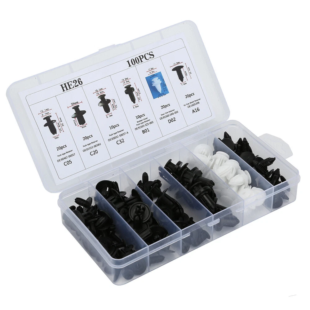 OE/OEM Part Number: Clip Trim Car Push UPC: 534265633692 Manufacturer Part Number: 100 Pcs Automotive Push Type Retainer Kit Universal Fitment: Yes Superseded Part Number: Universal For Auto Car SUV Off-Road Pickup Truck Interchange Part Number: Screw Fender Body Door Trim Panel Hood Country/Region of Manufacture: China Packing: PP Box Placement on Vehicle: Left, Right, Front, Rear, Upper, Lower gtin13: 534265633692 Color: Black & White Brand: Unbranded Warranty: 1 Year Features: Easy Installation Manufacturer Warranty: 1 Year Material: Nylon Clips, Plastic Box Package Contains: 100pcs Clips, 1 Plastic Box Other Part Number: Under Engine Splash Guard Rivet Fastener Clips Attachment Type: Clip-On Finish: Plastic Fitment Type: Direct Replacement Type: Bumper Item Type: Fastener
