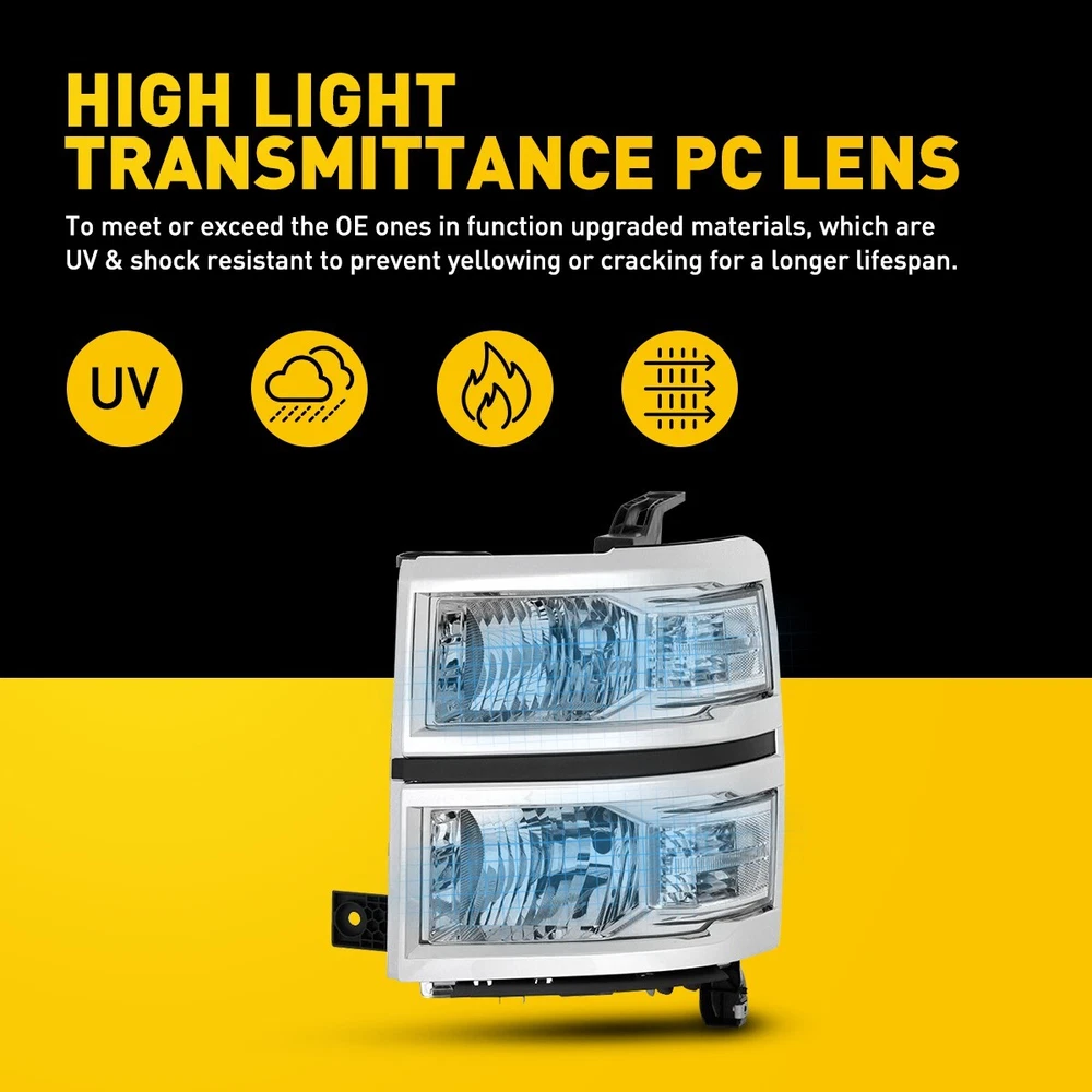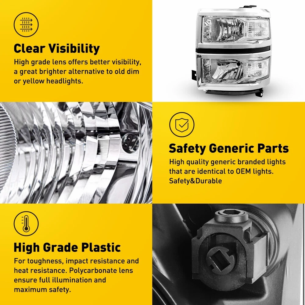 Fit for: For 2014-2015 Chevy Silverado 1500 Models Only (Fit For 2014 New Body Style Models Only; Does NOT Fit For HD Models) Specifications: OE number: 20933724, 20933725, 20933722, 20933723, 23172782, 23172783 GM2502389, GM2503389, GM2502395, GM2503395, GM2502410 Material: ABS+PC (ABS Plastic Housing/Polycarbonate lens) Appearance color: 1.Housing Color: Chrome 2.Lens Color:Clear 3.Reflector Color:White Note: Projector ×(Not include) DRL ×( Not Include) Bulb × (Not include) Features: For 14-15 Chevy Silverado 1500 OE Style Chrome Housing Clear Corner Headligh EXA Fit for: For 2014-2015 Chevy Silverado 1500 Models Only (Fit For 2014 New Body Style Models Only; Does NOT Fit For HD Models) Specifications: OE number: 20933724, 20933725, 20933722, 20933723, 23172782, 23172783 GM2502389, GM2503389, GM2502395, GM2503395, GM2502410 Material: ABS+PC (ABS Plastic Housing/Polycarbonate lens) Appearance color: 1.Housing Color: Chrome 2.Lens Color:Clear 3.Reflector Color:White Note: Projector ×(Not include) DRL ×( Not Include) Bulb × (Not include) Features: *Easy to install: Direct replacement, drilling and cutting are not required. *Superior quality: Made of ABS and PC materials with toughness and heat resistance functions to ensure its long service life and durability. *Angle adjustment: Equipped with a headlamp Angle adjustment knob, you can adjust the best Angle of view through the knob. *Suggestion: 1.Please confirm the OE number before purchasing! 2.Professional installation is required! Packaging include: Headlights*2(Left+Right) Item Specifics Number of Pieces 2 Type Headlight Assembly OE/OEM Part Number 20933724, 20933725, 20933722, 20933723, 23172782, 23172783 Fitment for 2014-2015 Chevy Silverado 1500 Models Only Attention Fit 2014 New Body Style Models Only; Does NOT Fit HD Models Manufacturer Warranty 1 Year Universal Fitment No Interchange Part Number GM2502389, GM2503389, GM2502395, GM2503395, GM2502410 Fitment Type Direct Replacement Brand AUXITO OE/OEM Part Number 20933724, 20933725, 20933722, 20933723, 23172782, 23172783 Fitment for 2014-2015 Chevy Silverado 1500 Models Only Attention Fit 2014 New Body Style Models Only; Does NOT Fit HD Models Manufacturer Warranty 1 Year Universal Fitment No Interchange Part Number GM2502389, GM2503389, GM2502395, GM2503395, GM2502410 Fitment Type Direct Replacement Brand AUXITO Payment We only accept PayPal payment, should be received within 3 days from the date of purchase. Please keep the consistency of Paypal address and ebay address. Payment should be made within 4 days once you won a item ,or ebay will launch Unpaid Reminder agaist you and there will be bad record on your ebay account . Buyers are responsible for import duties, custom fees and taxes.Please check with your country's custom office to determine the additional costs before you finally make the purchase Shipping All items will be shipped in 48 hours after receiving your payment . We ship this item to US only via USPS first class mail. It usually takes 3-6 working days to deliver. Returns We offer 30 days return policy. Please contact us within 30 days t from the date you receive your order if you have any issues with the product or want return .Refund will be send after we got your resend package. All returned items should be in the original packaging , return tracking information should be provided .. Buyer is responsible for return shipping cost due to the problem not caused by item quality itself . Contact Us Our office hours are MONDAY - FRIDAY 9:00PM - 6:00PM PST, but we will response you once we get your message .There will be some delay on response if you send message or E-Mail on weekend. FAQ Q1: Will this bulb fit my vehicle? A: We can match almost any vehicle to one of our bulb sizes. eBay only lets us include partial vehicle fitments per listing, but if your vehicle does not show up on the compatibility table at the top of our listings, welcome you to contact us for free consulation before purchasing a product. Q2: My item has not arrived, what's taking so long? A: Sometimes items take longer than expected, especially if it’s going far or to rural area. Check with your post office to see if your item has been held up. Sometimes USPS will not update a tracking number until it has arrived at its destination. If your item still has not arrived after a few days, let us know so we can double check for you and help solve it asap. Q3: Do I need to mention the Year, Make and Model in the notes when place order? A: YES. Please include the Year, Make, and Model in the notes section during checkout to ensure you receive everything needed for your kit! Q4: My bulbs won't fit, help! A: Special bulb holder may be required. See if you can take the holder from the stock bulb. If not, let us know. The bulb size may be wrong, double check the item you received with the item you ordered. Do you have an aftermarket lighting housing? These may not be perfectly fitted for aftermarket bulbs and will require some manual modifications. Q5: Neither side lighting up? Both sides flicker, flash, or work inconsistantly. A:Check the headlight fuses, and then check the ballast plugs to insure correct installation. If this doesn't work, there may be a voltage problem with the vehicle. You probably just need a relay or capacitor. Q6: WARNING ABOUT POLARITY Unlike halogen bulbs, LED are polarity sensitive. BEFORE you start your LED kit installation, verify the polarity on your vehicle by simply plugging the LED bulb into your vehicle socket. - if your light turns on, please proceed to install both bulbs onto your vehicle. - if your light DOES NOT turn on, disconnect the bulb and flip the socket in order to reverse the polarity (this will not damage your vehicle electrical system in any way). Once you made sure the LED bulb turns on, please proceed to install both bulbs onto your vehicle. Note: There is no convention when it comes to polarity. Different car manufactures have different polarity s