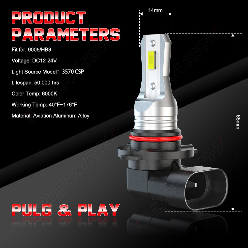 Product Advantages: 9005 (High Beam) + 9006 (Low Beam) High brightness High temperature resistant High purity of luminescence Good stable performance Built-in Driver Ballast Instant on fast cooling Energy saving environmental Long lifespan(>50000hr) Interchange Part Number: Use for high Beam, Low Beam, DRL or Fog Lights… LED Type: 6Pcs Led Chips Each Bulb Other Part Number: 6000K (Xenon HID Pure White) Head Light Lamp Bulbs Beam Angle: 360 Degrees Placement on Vehicle: Left, Right, Front Color: 6000K (Pure White Color) Condition: 100%Brand New/ Never Used Need additional Parts or Modification? 100% Integrated Design, Plug and Play. (Few vehicles may require load resistors to stop flickering or fix error message) Package include: 4x LED Headlight Bulbs 9005 (High Beam) + 9006 (Low Beam) Features: 1.Each Bulb have 2 sides of Super Bright LED Chips 2.Complete Kit: No Other Ballast/Driver Required Just Plug and Play - Newest Technology 3.Beam Angel: 360 Degrees 4.Color Temperature: 6000K Pure White 5.Smart Efficient Cooling System, Fast Heat Dissipation 6.High quality Aluminum heat dissipation ensures the secure temperature range 7.Low Power Consumption than Halogen bulb or Hid Kit, Energy Saving 8.Low Voltage Protection, High Precision Constant Current driver Chip 9.Shakeproof and Long lasting up to 50,000 Hours. 10.Easy installation, Plug and Play, NO modification required 11.Operating Temperature: -40°C ~ +80°C Automotive LED headlamps advantages: 1. LED lights than traditional halogen energy, more power. 2. Xenon lamp brightness and proximity , but the LED lights light up without delay, to enhance road safety. Instant start no strong currents impact , effectively protecting the car comes with a battery , improving battery life of more than 30%. 3. Fast cooling , the appearance of the most advanced design , thermal structure ingenious and reasonable. Less warranty, power driver with wide voltage constant current mode , the car can respond to a variety of voltage instability , the effective protection of normal use Led efficient and simple structure . Fewer Components damaged, repair the probability is very low , compared with HID ballast repair lower than 80% . 4. Heating temperature is low , protect the car . Xenon working temperature up to 800 ° -1000 ° , the main reason for the car ignition . 5. LED car headlights simple structure, fewer parts than xenon lamps, significantly lower than the xenon lamp failure rates ! 6. Automotive LED headlamps color temperature balancing. The Xenon bulbs in the same color to clear , about 6000K-6500K. Install Caution 1. As a safety precaution, make sure that the car has had time to cool down properly before starting the installation process. 2. Put the vehicle into park or make sure it is securely in gear. 3. Make sure to have the ignition turned off and the keys removed. 4. Be careful to avoid burns, especially when turning on or off the vehicles lighting. 5. Be careful to avoid crushing or cutting the bulbs. Also make sure to not touch the bulbs with your fingers, as this will cause blotting. 6. Fully examine the connection of the contact points, ports and the wires as faulty connections can cause lighting problems. 7. Make certain that the end of the bulb does not come in contact with the interior light shield of the headlight when adjusting the bulb. Brand New High Quality with Reasonable Price Fast Ship from KY or CA within 1 business day Tracking# Is Available With Free Shipping 60 days money-back guarantee & free return