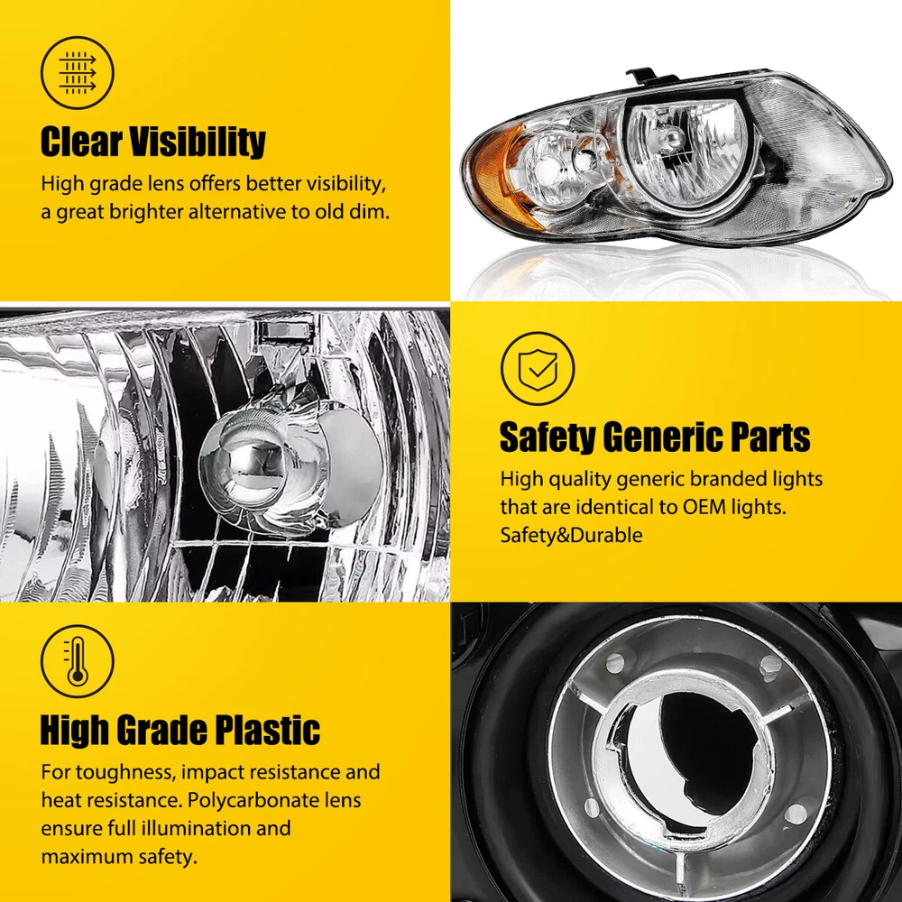 Fit for: 2005-2007 Chrysler Town & Country Van 4-Door With Long Wheel Base Models Specifications: OE number: 4857991AD, 4857990AD 4857991AB, 4857990AB CH2502152, CH2503152 Material: ABS+PC (ABS Plastic Housing/Polycarbonate lens) Appearance color: 1.Housing Color:Chrome 2.Lens Color:Clear 3.Reflector Color:Amber Note: Projector ×(Not Include) DRL × (Not include) Bulb × (Not include) Features: *Easy to install: Direct replacement, drilling and cutting are not required. *Superior quality: For 2005 2006 2007 Chrysler Town&Country 3.3L 3.8L Headlight Assembly Pair LH RH Fit for: 2005-2007 Chrysler Town & Country Van 4-Door With Long Wheel Base Models Specifications: OE number: 4857991AD, 4857990AD 4857991AB, 4857990AB CH2502152, CH2503152 Material: ABS+PC (ABS Plastic Housing/Polycarbonate lens) Appearance color: 1.Housing Color:Chrome 2.Lens Color:Clear 3.Reflector Color:Amber Note: Projector ×(Not Include) DRL × (Not include) Bulb × (Not include) Features: *Easy to install: Direct replacement, drilling and cutting are not required. *Superior quality: Made of ABS and PC materials with toughness and heat resistance functions to ensure its long service life and durability. *Angle adjustment: Equipped with a headlamp Angle adjustment knob, you can adjust the best Angle of view through the knob. *Suggestion: 1.Please confirm the OE number before purchasing!!! 2.Professional installation is required!!! Packaging include: Headlights*2(Left+Right) Item Specifics Brand AUXITO Lighting Technology Halogen Type Headlight Assembly Features DOT-Certified, Reflector Housing, SAE-Certified, Sealed Assembly Housing Color Chrome Placement on Vehicle Front, Left, Right Light Color Warm White Lens Color Clear Reflector Color Amber Manufacturer Part Number DYH128735LIGHTS Color Temperature 6000K Mounting Style Screws Voltage 12 V Vintage Part Yes Performance Part Yes Manufacturer Warranty 1 Year Universal Fitment Yes Lumens 10000 lm Finish Smooth Model For Town & Country Van 4-Door Headlights Material ABS, PC, PMMA Quantity 2 Packaging include Driver & Passenger Side Headlights Assembly Items Included No Bulbs Headlight Style Reflector Headlights Lightning Type Reflector High & Low Beam Automotive lighting systems Dual Beam Headlights systems Fitment Type Direct Replacement Assembly Type Composite Bulb Shape Code Please Use Stock Bulbs Mounting Hardware Included No Certifications DOT, SAE Dust and Moisture Protection Yes Waterproof Yes Ballast Included No Applicable Regions US Components Included Lens & Housing Attention 1 Fits models with 119" long wheel base only Attention 2 Do not fit models with 113'' wheel base OE/OEM Part Number CH2502152, CH2503152, 4857991AB, 4857990AB Payment Returns DESCRIPTION PAYMENT SHIPPING RETURN POLICY CONTACT US Shop Category Store Home LED Headlight ◈ H4 ◈ H13 LED Reverse Light ◈ T15/921/W16W LED License Plate Light LED Side Marker Light Car Parts & Accessories Tail Light assemblies Other Hot Item Picture New List Item Clear Chrome Projector Head Lights Lamp For 2014-2015 Chevy Silverado 1500 LH RH USD 226.99 LED License Plate Tag Light For Lexus IS ES GS RX Toyota Camry Super White PUS USD 12.99 FOR 06-11 HONDA CIVIC SEDAN HOUSING PAIR BLACK AMBER CORNER HEADLIGHT LAMP USD 69.99 2pcs 9006 Fog Light Driving LED Foglight Bulbs Xenon White High Power 4000LM USD 23.99 2x For 2006-2009 Dodge Ram 1500 2500 3500 Chrome Clear Headlights Headlamps New USD 85.99 Help & Info Payment Policy Shipping Policy Return Policy FAQ About Us For 2005 2006 2007 Chrysler Town&Country 3.3L 3.8L Headlight Assembly Pair LH RH Fit for: 2005-2007 Chrysler Town & Country Van 4-Door With Long Wheel Base Models Specifications: OE number: 4857991AD, 4857990AD 4857991AB, 4857990AB CH2502152, CH2503152 Material: ABS+PC (ABS Plastic Housing/Polycarbonate lens) Appearance color: 1.Housing Color:Chrome 2.Lens Color:Clear 3.Reflector Color:Amber Note: Projector ×(Not Include) DRL × (Not include) Bulb × (Not include) Features: *Easy to install: Direct replacement, drilling and cutting are not required. *Superior quality: Made of ABS and PC materials with toughness and heat resistance functions to ensure its long service life and durability. *Angle adjustment: Equipped with a headlamp Angle adjustment knob, you can adjust the best Angle of view through the knob. *Suggestion: 1.Please confirm the OE number before purchasing!!! 2.Professional installation is required!!! Packaging include: Headlights*2(Left+Right) Payment Returns All rights reserved. On Dec 17, 2024 at 18:11:41 PST, seller added the following information:
