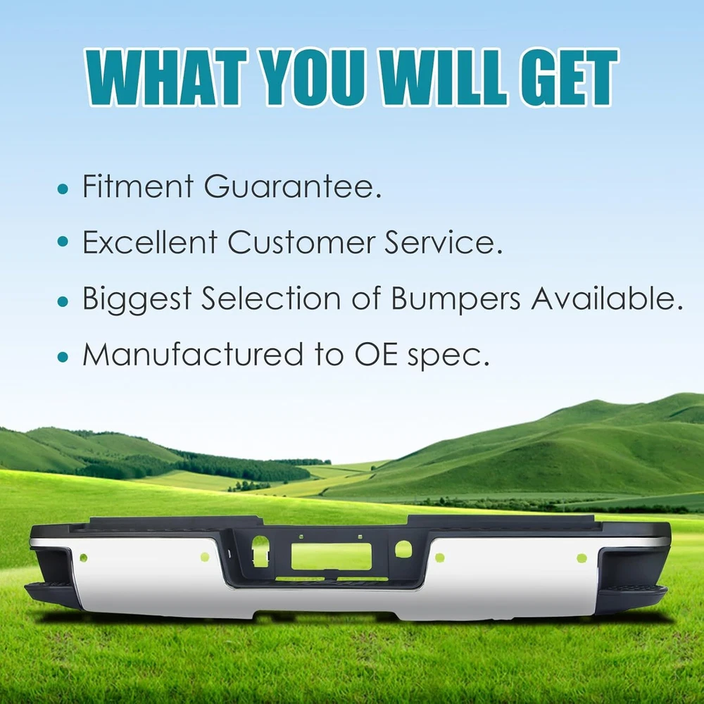 Park Assist Sensor Cut-out Rear Bumper Compatible with 2015-2019 Chevy Silverado/GMC Sierra 2500 HD 3500 HD, Step Bumper with Parking Sensor Hole without Tow Hitch for Dual Rear Wheel (Dually) Models , Chrome Bar Replacement Step Pad Assembly Product Description About this item Chrome Rear Bumper Assembly: Enhance the look of your 2015-2019 Silverado Sierra 2500 3500 with this and stylish chrome rear bumper assembly. compatible with Specific Models: Designed to compatible with seamlessly on Silverado Sierra 2500 3500 models from 2015 to 2019, e a precise and custom compatible with. Integed Park Assist: This rear bumper assembly comes equipped with park assist sensors, making parking and ee your vehicle easier and safer. Easy Installation: With a straightforward installation process, you can quickly upgrade your vehicle's rear bumper without the need compatible with professional help. Enhanced ion and Style: Not only does this chrome rear bumper assembly your vehicle, but it also adds a touch of sophistication and style to your Silverado Sierra 2500 3500. Features: 2015-2019 Chevrolet Silverado 2500 HD 2015-2019 Chevrolet Silverado 3500 HD 2015-2019 GMC Sierra 2500 HD 2015-2019 GMC Sierra 3500 HD For Models With Park Sensors For Use With Factory Tow Hitch (Hitch Plate Not Included) For Dual Rear Wheel (Dually) Models ONLY High Polished Chrome Finish Includes Reinforcement, Brackets, Hardware, Lamps and Step Pad Direct OE Replacement W/o Park Assist Sensor Cut-out Chrome Steel Rear Step Bumper Replacement for 2015-2019 Chevy Silverado Sierra 2500HD 3500HD Single Rear Wheels without Park Assist Sensor Holes GM1103182 Product Description About this item Compatible with: specifically designed replacement for 2015-2019 Silverado 2500HD 3500HD 2015-2019 Sierra 2500HD 3500HD, ensuring a secure and stable installation Premium quality steel: constructed from steel and chrome for an extra layer of protection and an aesthetic appeal, is designed to withstand daily crash, ensuring a long-lasting performance Easy installation: no drilling or cutting required, designed as a direct replacement for your original step bumper. Installation instruction is not included. Professional installation would be highly recommended Stable use: the stepped bumper provides additional protection for your vehicle, ensuring stable driving on the road Complete package: it comes with 1 x rear bumper as shown in the picture. All these components are of good quality, ensuring reliable performance and functionality Features: It undergoes strict factory testing to ensure reliable performance and a long service life It is designed to be a direct replacement, made to factory specifications, so no modifications are required This rear bumper is the good fit for your vehicle, seamlessly integrating with the overall design and enhancing its aesthetics Not only does this rear bumper provide excellent protection for your vehicle, but it also offers a stylish and sleek appearance Its finish adds a touch of elegance to your car while effectively guarding avoid impacts, scratches, and other forms of damage Fitment: Replacement for 2015-2019 Silverado 2500HD Replacement for 2015-2019 Silverado 3500HD Replacement for 2015-2019 Sierra 2500HD Replacement for 2015-2019 Sierra 3500HD Specifications: Part number: replacement for GM1103182 23108142-PFM 84078289 Color: chrome Material: steel Type: rear step bumper Placement on vehicle: rear Fitment type: direct replacement Attachment type: bolt-on Package included: 1 x rear step bumper shown in pictures Notes: With corner step Without hitch draw bar Without mounting brackets For Single Rear Wheel Models ONLY For models without park assist holes only For use with factory tow hitch (no stabilizer plate included) Payment Delivery Details Return Feedback Contact us Payment We accept payment by any of the following methods: Delivery Details Shipping Time Your item will ship within 3 days (Mon-Fri) of your cleared payment. Items will be shipped to the shipping address you specify via Paypal only. We are NOT able to change the shipping address once payment has been made. A tracking number will be provided once your item has shipped. Domestic Buyers No shipping to PO BOX and APO addresses. No shipping to PR, AK, HI. International Buyers International buyers please note: Import duties, taxes and charges are not included in the item price or shipping charges. These charges are the buyer's responsibility. Please check with your country's customs office to determine what these additional costs will be prior to bidding/buying. Return All returns must have RMA number. Returns with no RMA number will be avoided! 1. Changed your mind and don't want the item anymore? We back our products with a 30-DAY SATISFACTION GUARANTEE! (Item must be in the original condition as it was received. 30 Days Refund, 30 Day Replacement.). Brand New items will have 30 days warranty or replacement policy. 2. Restocking fees will be charged ONLY on Brand New items. 3. Defective/Dead items will be fully refunded or replaced after matching the serial number with the one in our records. 4. Mobile phones and tablets MUST be restored to factory setting. 5. If your order arrives incorrect or the package is damaged in result of a carrier company, you must notify us within 4 days of receipt. Defective items will be credited only after matching the serial number with the one in our records. We are aware of all fraud cases and have all the items details in our records. 6. If there is a quality issue or malfunction with the product, we strongly suggest you to contact the original manufacturer. 7. Any item needed to be returned must be securely packaged, insured and shipped with tracking for safety. We cannot be responsible for lost damaged packages. We carefully inspect returned items upon receipt before any possible refunds, credits, or exchanges. Feedback Customer satisfaction is our top priority. Please give us a chance to resolve any issues 