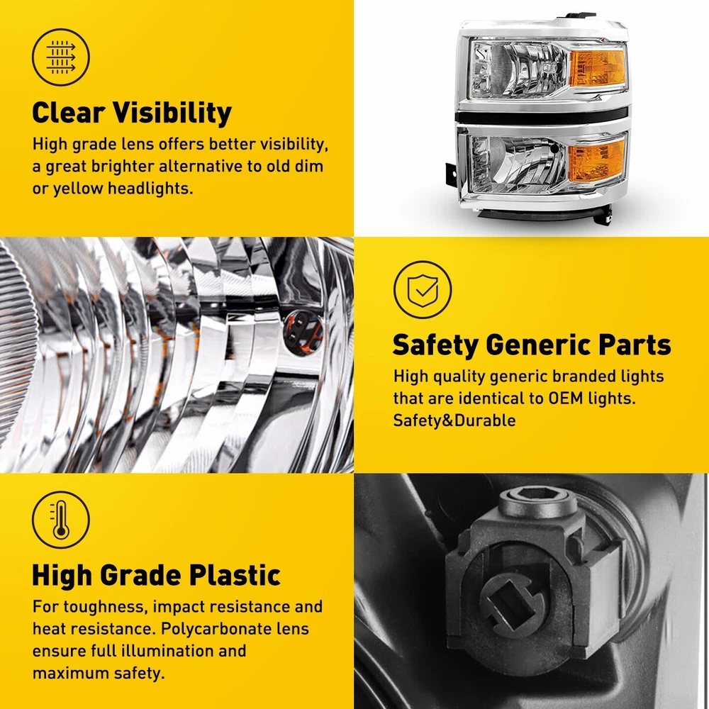Fit for: 2014-2015 Chevy Silverado 1500 Models Only (Fit 2014 New Body Style Models Only; Does NOT Fit HD Models) Specifications: OE number: 20933724, 20933725, 20933722, 20933723, 23172782, 23172783 GM2502389, GM2503389, GM2502395, GM2503395, GM2502410 Material: ABS+PC (ABS Plastic Housing/Polycarbonate lens) Appearance color: 1.Housing Color: Chrome 2.Lens Color: Clear 3.Reflector Color: Amber Note: Projector × (Not include) DRL × ( Not Include) Bulb × (Not include) For Chevy Silverado 1500 2014-15 Chrome & Amber Headlights Assemblies US Fit for: 2014-2015 Chevy Silverado 1500 Models Only (Fit 2014 New Body Style Models Only; Does NOT Fit HD Models) Specifications: OE number: 20933724, 20933725, 20933722, 20933723, 23172782, 23172783 GM2502389, GM2503389, GM2502395, GM2503395, GM2502410 Material: ABS+PC (ABS Plastic Housing/Polycarbonate lens) Appearance color: 1.Housing Color: Chrome 2.Lens Color: Clear 3.Reflector Color: Amber Note: Projector × (Not include) DRL × ( Not Include) Bulb × (Not include) Features: *Easy to install: Direct replacement, drilling and cutting are not required. *Superior quality: Made of ABS and PC materials with toughness and heat resistance functions to ensure its long service life and durability. *Angle adjustment: Equipped with a headlamp Angle adjustment knob, you can adjust the best Angle of view through the knob. Suggestion: 1.Please confirm the OE number before purchasing!!! 2.Professional installation is required!!! Package Included: Headlights *2 (Left+Right) Item Specifics OE Spec or Performance/Custom OE Spec High Beam Bulb Type HB3 Bulb (No included) Bulbs Included No Manufacturer Part Number DDZC-SILVERADO-14-15C-CA Low Beam Bulb Type H11(Bulbs are Not Included) Package included Driver & Passenger Headlights Placement on Vehicle Front, Left, Right Turn Signal Bulb Type 7443 Bulb (No Included) Brand AUXITO Bulb Shape Code H11/HB3 (Bulbs are not included) Type Headlight Assembly Interchange Part Number 20933724 20933725 20933722 20933723 23172782 23172783 2014 2015 Headlight Style Aftermarket OE/OEM Part Number GM2502389 GM2503389 GM2502395 GM2503395 GM2502410 Manufacturer Warranty 1 Year Housing Color Chrome Features Reflector Housing, Sealed Assembly, DOT-Certified Lens Color Clear Lighting Technology Halogen Payment Returns DESCRIPTION PAYMENT SHIPPING RETURN POLICY CONTACT US Shop Category Store Home LED Headlight ◈ H4 ◈ H13 LED Reverse Light ◈ T15/921/W16W LED License Plate Light LED Side Marker Light Car Parts & Accessories Tail Light assemblies Other Hot Item Picture New List Item For 2015-2020 Chevy Tahoe Suburban [OE Style] LED DRL Headlights Headlamps LH USD 139.99 4PC Smoked Lens LED Front Side Lamp Marker White For 2003-09 Dodge Ram 2500 3500 USD 15.99 Smoked Lens White LED Bumper Rear Side Marker Lights For 1993-2002 Chevy Camaro USD 22.29 Pair Halogen Headlight Set For 2011-2015 Chevrolet Chevy Cruze 4-Door Sedan EOV USD 113.99 For 2016-2018 Honda HRV HR-V Chrome Housing Headlights Assembly Left&Right Pair USD 145.99 Help & Info Payment Policy Shipping Policy Return Policy FAQ About Us For Chevy Silverado 1500 2014-15 Chrome & Amber Headlights Assemblies US Fit for: 2014-2015 Chevy Silverado 1500 Models Only (Fit 2014 New Body Style Models Only; Does NOT Fit HD Models) Specifications: OE number: 20933724, 20933725, 20933722, 20933723, 23172782, 23172783 GM2502389, GM2503389, GM2502395, GM2503395, GM2502410 Material: ABS+PC (ABS Plastic Housing/Polycarbonate lens) Appearance color: 1.Housing Color: Chrome 2.Lens Color: Clear 3.Reflector Color: Amber Note: Projector × (Not include) DRL × ( Not Include) Bulb × (Not include) Features: *Easy to install: Direct replacement, drilling and cutting are not required. *Superior quality: Made of ABS and PC materials with toughness and heat resistance functions to ensure its long service life and durability. *Angle adjustment: Equipped with a headlamp Angle adjustment knob, you can adjust the best Angle of view through the knob. Suggestion: 1.Please confirm the OE number before purchasing!!! 2.Professional installation is required!!! Package Included: Headlights *2 (Left+Right) Payment Returns All rights reserved. On Dec 17, 2024 at 13:24:08 PST, seller added the following information: