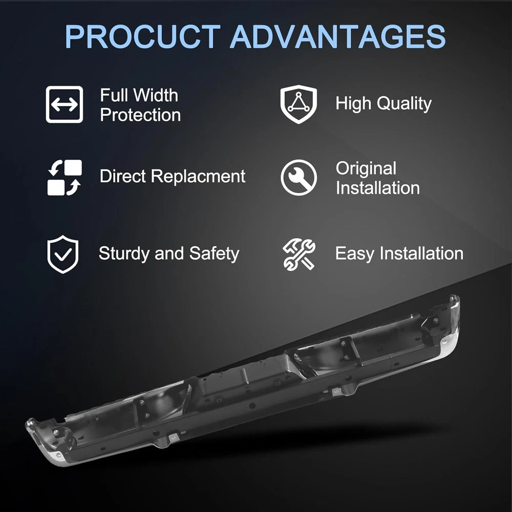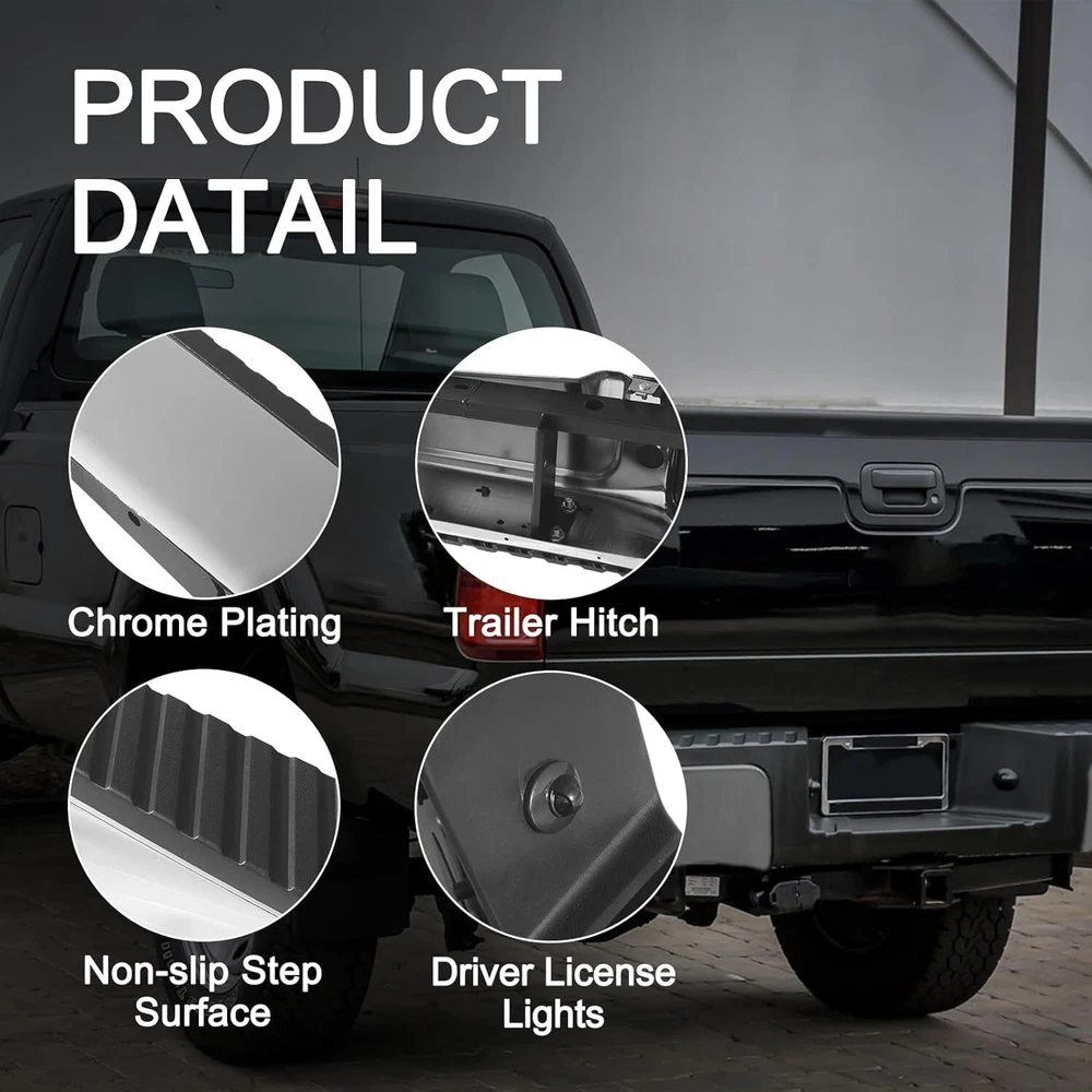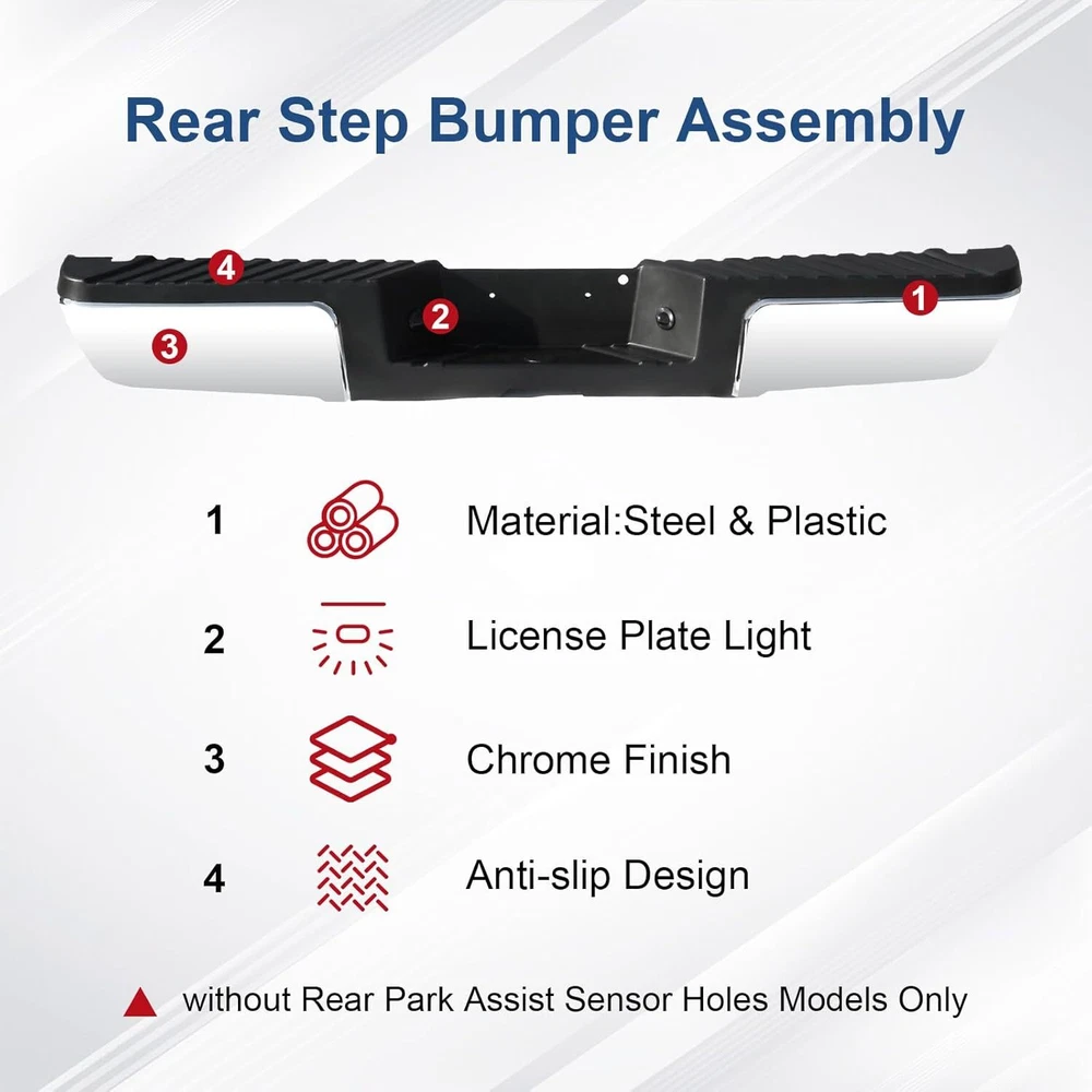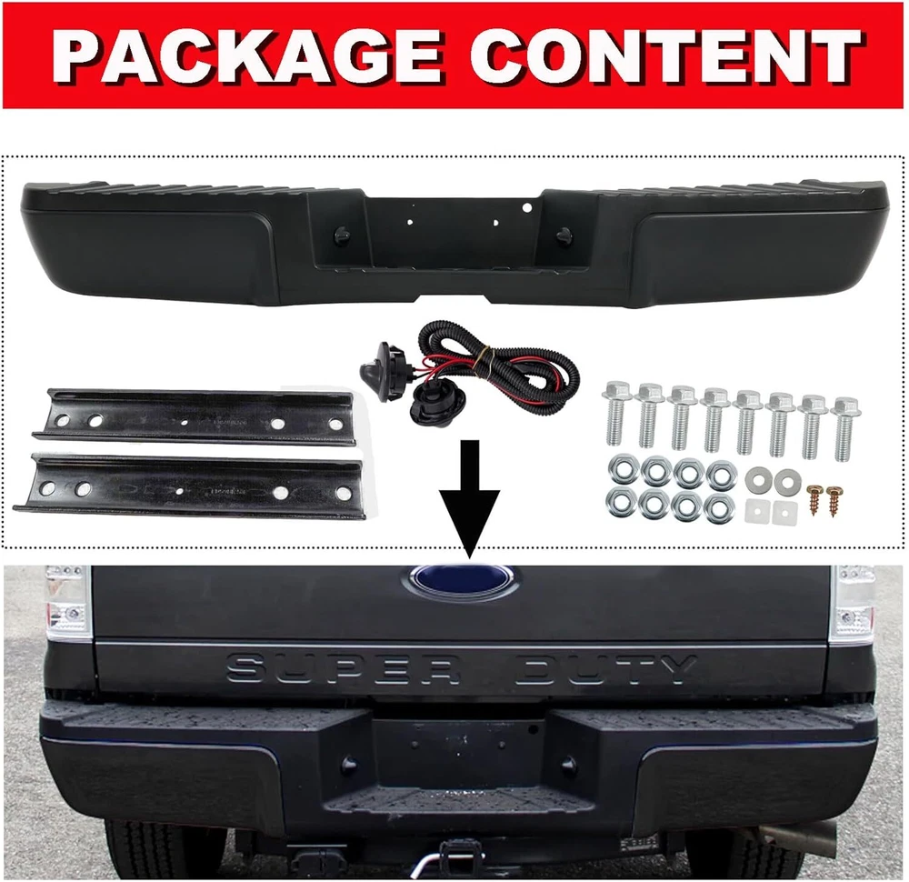 Chrome Style Rear Step Bumpers Assembly Replacement for Ford F-250 F-350 F-450 Super Duty 2008 2009 2010 2011 2012 2013 2014 2015 2016 W/O Park Assist Sensor Holes, Back Bumper Chrome Product Description About this item Rear Bumper replacement for: Ford F250 F350 F450 Super Duty 2008-2016. Note:this rear step bumper WITHOUT Rear Park Assist Sensor Holes. Part Numbers: FO1103148 9C3Z17906B-PFM. NOTE: Check the year and model of the vehicle carefully before buying Good Chrome Steel Construction:The rear step bumper assembly is made from using high quality steel and ABS plastic, it is designed to withstand impacts and protect the rear of your vehicle from damage. Easy installtion: It comes with a rear step bumper, brackets, license plate light and all the necessary hardware to make the installation process quick and easy with no modifications or drilling required. Simply remove your old bumper and replace it with our rear bumper. Enhanced protection: In the event of a collision, the rear bumper absorbs and cushions the impact of the outside world, effectively mitigating collisions and scratches, and restoring your vehicle to like-new condition at all times, protecting both the vehicle body and passengers. About service: Durable and Long Lasting Chrome Rear Bumper,the customer service period is 1 year. Note: Please check the display pictures and OEM to see before purchase. Package Includes: 1x Rear Step Bumper Assembly Compatible Vehicles: Compatible with 2008-2016 Ford F-250 Super Duty Compatible with 2008-2016 Ford F-350 Super Duty Compatible with 2008-2016 Ford F-450 Super Duty Replaces OEM Number: FO1103148,9C3Z17906B-PFM Suitable models Compatible with 2008 Ford F250 F350 F450 Super Duty Compatible with 2009 Ford F250 F350 F450 Super Duty Compatible with 2010 Ford F250 F350 F450 Super Duty Compatible with 2011 Ford F250 F350 F450 Super Duty Compatible with 2012 Ford F250 F350 F450 Super Duty Compatible with 2013 Ford F250 F350 F450 Super Duty Compatible with 2014 Ford F250 F350 F450 Super Duty Compatible with 2015 Ford F250 F350 F450 Super Duty Compatible with 2016 Ford F250 F350 F450 Super Duty Chromium Plating Chrome plated surface provides a bright, reflective finish and accent trim to the bumper, offering superior corrosion resistance and fade-free shine. Easy Installation Brackets, hardware & step pads included. Direct-to-frame mounts require no modifications installation. Step Function Made of durable alloy steel and resilent ABS plastic, this rear bumper assembly provides a convenient multi-purpose step solution for reaching the truck bed, roof rack or tool boxes. Black Style Rear Bumper Assembly Fits for Ford F250 F350 F450 Super Duty 2008-2016 W/O Parking Sensor Holes Back Bumper Replacement Black FO1103149 Product Description About this item 🚗 SUITBLE MODEL: Compatible with Ford F250 F350 F450 Super Duty 2008-2016. Replacement for # FO1103149. Please check the year and model of your vehicle carefully before purchasing. Please be noted that this rear step bumper WITHOUT parking aid sensor holes. 🚗 REFRESH APPEARANCE: Direct replacement for old or damaged bumpers, will give your car an incredible new appearance. Black color is easier to match with any color of vehicle, and brings a more stylish element to your pickup truck. 🚗 DURABILITY AND STRENGTH: The bumper is made of high quality steel and ABS plastic. Equipped with advanced production technology, can effectively enhance the lifetime of the product. Excellent durability and strength also provide protection for use in a variety of scenarios. 🚗 EASY INSTALLATION: Direct bolt-on. Easy to install without any drilling or modification. Professional installation is highly recommended for a better fit of the product to the vehicle. 🚗 PRODUCTS INCLUDED: 1 x Rear Step Bumper and Mounting Hardware. Payment Delivery Details Return Feedback Contact us Payment We accept payment by any of the following methods: Delivery Details Shipping Time Your item will ship within 3 days (Mon-Fri) of your cleared payment. Items will be shipped to the shipping address you specify via Paypal only. We are NOT able to change the shipping address once payment has been made. A tracking number will be provided once your item has shipped. Domestic Buyers No shipping to PO BOX and APO addresses. No shipping to PR, AK, HI. International Buyers International buyers please note: Import duties, taxes and charges are not included in the item price or shipping charges. These charges are the buyer's responsibility. Please check with your country's customs office to determine what these additional costs will be prior to bidding/buying. Return All returns must have RMA number. Returns with no RMA number will be avoided! 1. Changed your mind and don't want the item anymore? We back our products with a 30-DAY SATISFACTION GUARANTEE! (Item must be in the original condition as it was received. 30 Days Refund, 30 Day Replacement.). Brand New items will have 30 days warranty or replacement policy. 2. Restocking fees will be charged ONLY on Brand New items. 3. Defective/Dead items will be fully refunded or replaced after matching the serial number with the one in our records. 4. Mobile phones and tablets MUST be restored to factory setting. 5. If your order arrives incorrect or the package is damaged in result of a carrier company, you must notify us within 4 days of receipt. Defective items will be credited only after matching the serial number with the one in our records. We are aware of all fraud cases and have all the items details in our records. 6. If there is a quality issue or malfunction with the product, we strongly suggest you to contact the original manufacturer. 7. Any item needed to be returned must be securely packaged, insured and shipped with tracking for safety. We cannot be responsible for lost damaged packages. We carefully inspect returned items upon receipt before any possible refunds, credits, or exchanges. Feedback Customer satisfaction 