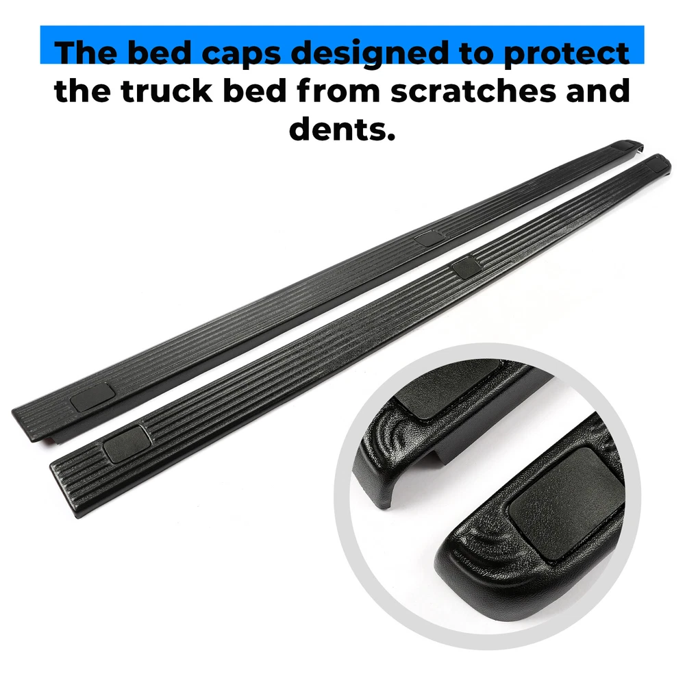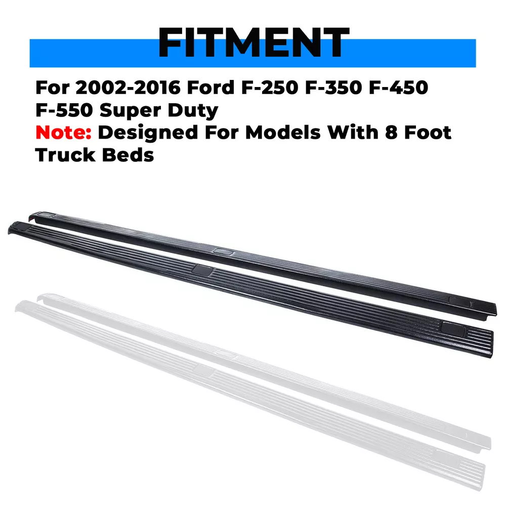 For Ford F250 F350 Super Duty 8.0' Bed Side Rail Top Molding Covers Right & Left Description This is a pair of black plastic bed caps designed to protect the truck bed from scratches and dents. Automotive side rail covers wrap around the back of the bed providing more coverage and a better fit than aluminum bed caps. Bed rail caps have double side tape pre-installed for a quick easy no drill installation. It is a complete kit that includes two bed rail caps in the ribbed finish with stake pocket hole cutouts. Feature 100% Brand New Protects paint from scratches or dents High impact ABS black plastic Textured finish prevents fading No drilling required Fitment For 2002-2016 Ford F-250 F-350 F-450 F-550 Super Duty Note: Designed For Models With 8 Foot Truck Beds Shipping All items will be shipped out in 1 business day,no expedited service available. We ship our items to USA only(Does NOT include Hawaii,Alaska or Puerto Rico, PO Boxes/APO's ). Contact us Any Questions,Just feel free to contact us on eBay.We will reply you in 24 hours.