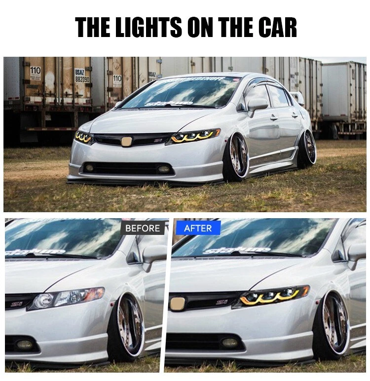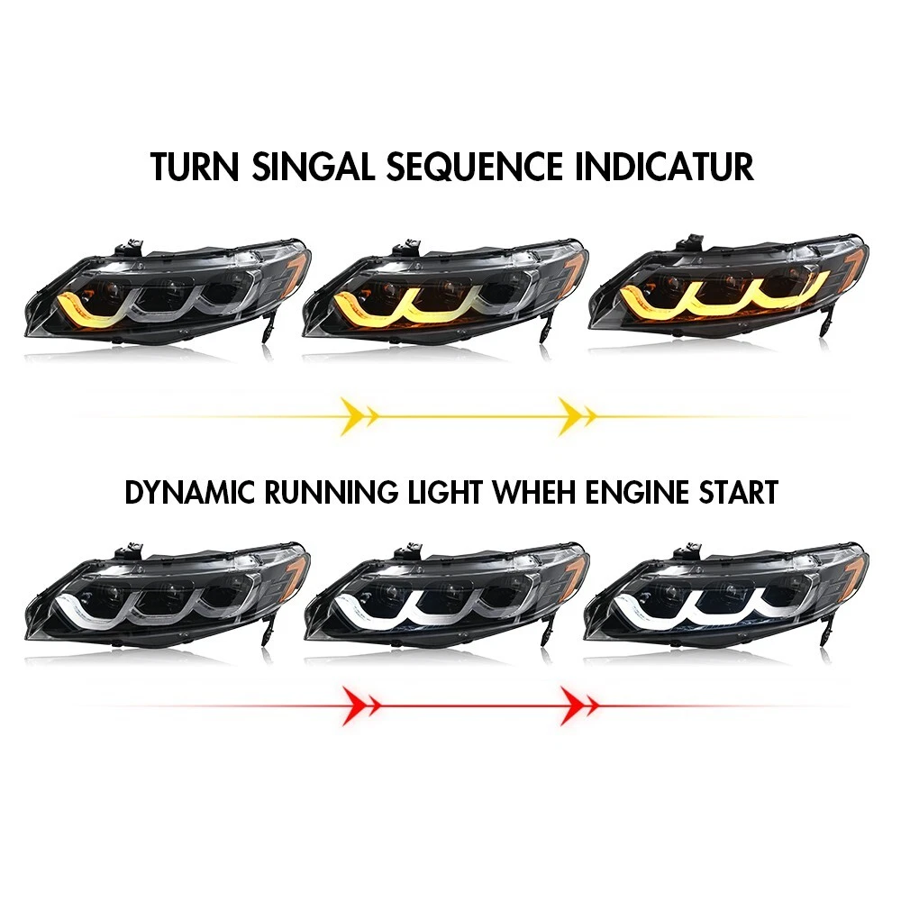 Pair LED Projector Headlight For Honda Civic 2006-2011 Sequential Turn Animation Fitment: For Honda Civic 2006-2011 Package Includes: 1 Pair (Driver Side + Passenger Side) Headlights Assembly Set (Including Some Installation Accessories) Specification : Brand :TT-ABC Product Condition: 100% Brand New Type: LED Headlights Assembly A few second of Start up Animation Sequential Turn Signal Full LED, No need to purchase additional light bulbs Function: DRL(White)+High Beam(White)+Low Beam(White) +Turn Signal(Yellow)+Side light (Yellow ) Housing Color: Black Lens Color:Clear Operating Voltage: 12V-14V Material:High Quality ABS Plastic+PC+PMMA Waterproof Rate:IP67 Warranty:1 year Features:DOT-Certifed, Durable, Easy lnstalation, High Quality, OE-Certified, SAE-Cerified, Sealed Assembly, Waterproof, ISO-Certifed, Dustproof And Shurdy Note: Please confirm the year of your car/light shape/ plug of your original lights whether these information as same as our lights, if you can't confirm it, please contact us. Please double check shipping address, We are not responsible for incorrect or undeliverable addresses.You can't change your shipping address after placing an order. Please Using your factory supplied connector/harness will avoid cutting or modifying any wires. We only provide electronic invoice "packing slip", if you need it, please note or contact us when you place an order. We will open the box and inspect the returned item to see if it is intact and the correct item before refunding you. If there is a problem with the product, please feel free to contact us, we can help you solve it as soon as quickly! Payment Delivery details After sales Contact us For tips Payment We only accept payment via eBay. Please make sure your eBay address is correct before you pay. Insufficient information will delay the order process so please read the invoice carefully during checkout. Delivery details To United States: 3-6 business days. Package will be sent out within 24 hours after the pament is received. Pick-up is unsupported servise. We will not be responsible for any delivery failure due to unclear address. Delivery is not available on weekends, public holidays or after business hours. After sales After-sale If it happens that the lights get moisture after you install them on your car, it would be normal for first time using. You just need to keep using for a period of days, the moisture will disappear. because there is inner air cycling in the lights as we design. As for headlights, you can also open the cover of low/high beam so that the moisture will out more quickly. If the moisture still exist, please feel free to send us message for help, we will try our best to help you. After you install, if you find that there have function does not work, please check if the harness is connected correctly, and exchange the left and right , If it still does not work, please rember take some photos or videos, please feel free to contact us. We will appreciate if you can takes some pictures or videos about your problem, and also send us the barcode of the products(every product we sell has a barcode on the backside of the light and outside of the package, it's very important for us to find the problem) If you open a request or case optionaly before communication, it would be hard for us to serve you. Contact us If you have any problem, please contact us or leave message for us for free. We will reply at once when convient. Don't worry, we always here waiting for your and like to help you. For tips There are some tips for you: 1. If There are any problems with the product, please contact with us before leaving any feedback or raise any dispute. 2. If you are in our exclusion countries. Please write to us for shipping .If When the goods arrive, please check them carefully 3. If you find that the goods have been damaged, please be sure to refuse to collect the goods and ask the courier to return the goods to us. If the goods are damaged, please do not collect. 4. If the item you have ordered is defective, contact us within the warranty period, we will replace the defective item for you with an item of equal functionality at first. 5. If buyer do not want neither replacement nor partial refund, but want returning,buyer should be responsible for all the returning ship charges.