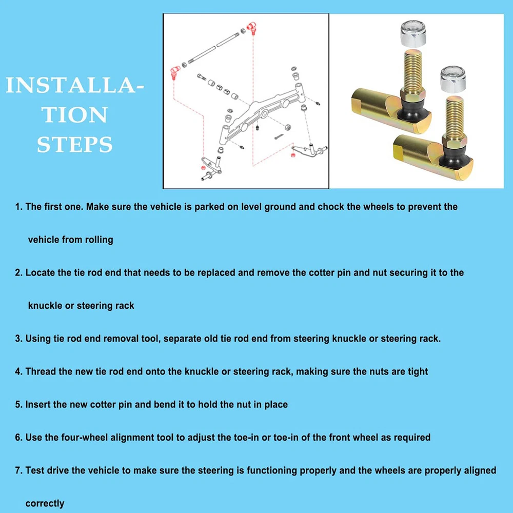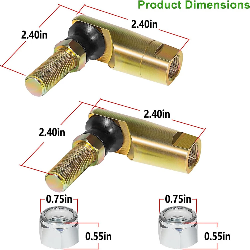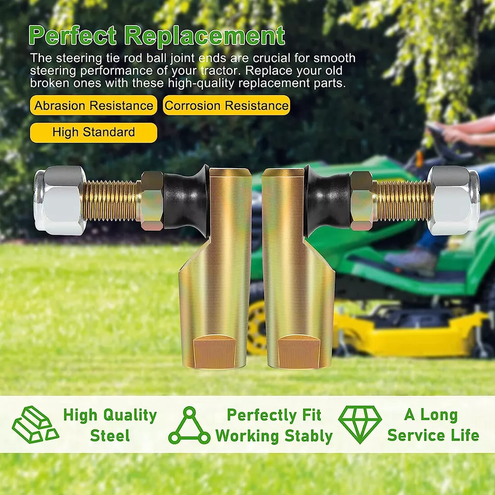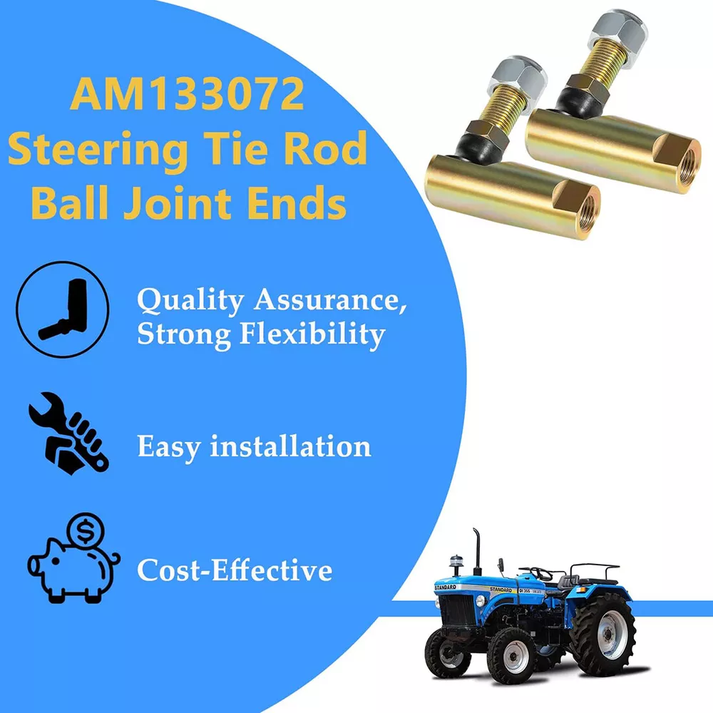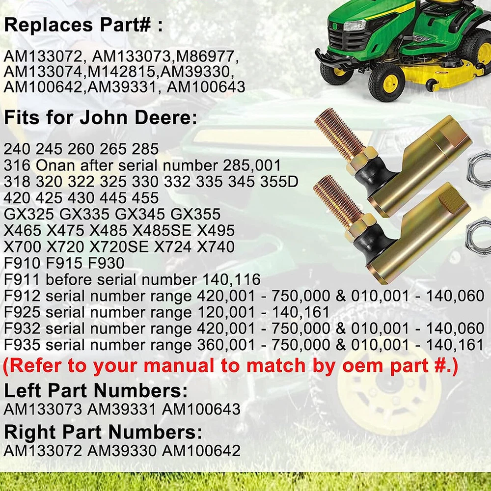 Fitment: Fits for John Deere 240,245,260,265,285,316,318,320,322,325,330,332,335,345,355D,420,425,430,445,455,GX325,GX335,GX345,GX355,X465,X475,X485,X495,GX325,GX335,GX345,GX355,F910,F911,F912,F915,F925,F930,F935 Features: 1) This Steering Tie Rod Ball Joint Ends are made of high quality durable 4130 Chromoly Steel and rubber.The high quality of the material and precision machined accuracy can withstand high-intensity use 2) As a part of the steering system in a vehicle, Switch Steering Tie Rod Ball Joint Ends can provide a pivot point for steering linkage and allow wheels to turn and move in the desired direction. Help to maintain the stability and control of the vehicle during steering movements, and ensure safety and reduce risk of accidents 3) With left part numbers AM133073, AM39331, AM100643, right part numbers AM133072, AM39330, AM100642. Provide cost-effective and reliable solution for John Deere models and other agricultural machinery to maintain steering system Package included: 2 Tie Rod Ends and 2 Nuts