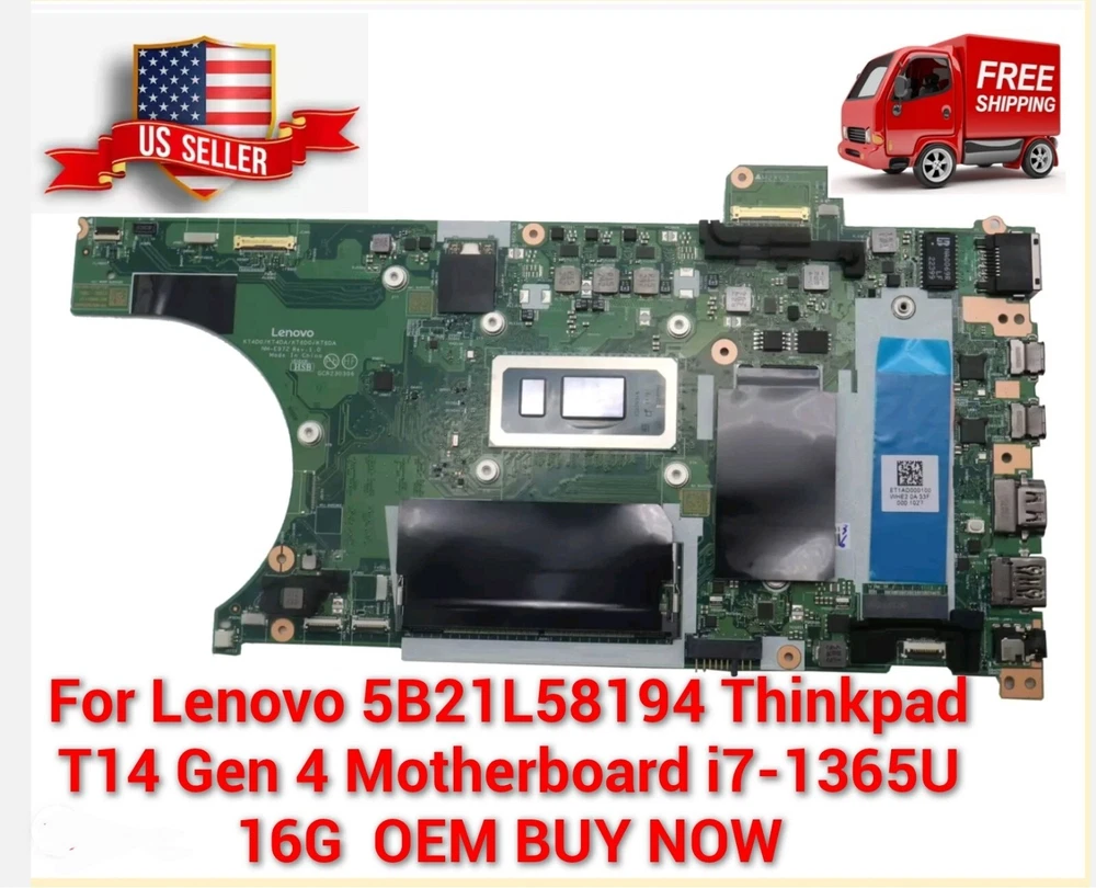 The product is an OEM motherboard designed for the Lenovo Thinkpad T14 Gen 4 model, specifically equipped with an Intel i7-1365U processor and 16GB of RAM. It is manufactured in China and is compatible with Lenovo systems. This motherboard serves as a crucial component for the computer, allowing for the smooth functioning of the device. With its high-performance processor and ample memory capacity, it is designed to provide a reliable and efficient computing experience for users of the Lenovo Thinkpad T14 Gen 4 laptop. The Lenovo 5B21L58194 motherboard is a genuine OEM component designed for the ThinkPad T14 Gen 4 and T16 Gen 2 laptops. It features an integrated Intel Core i7-1365U processor and 16GB of onboard memory, providing robust performance for business and professional applications. This motherboard is tailored to fit the specific form factor of the ThinkPad T14 Gen 4 and T16 Gen 2 series, ensuring compatibility with the laptops' chassis and internal components. The integrated Intel Core i7-1365U processor offers efficient performance suitable for multitasking and demanding workloads. The 16GB of soldered memory provides ample capacity for smooth operation of various applications. As an OEM part, the 5B21L58194 motherboard is identical to the original component installed in these ThinkPad models, ensuring seamless integration and maintaining the reliability and performance standards set by Lenovo.
