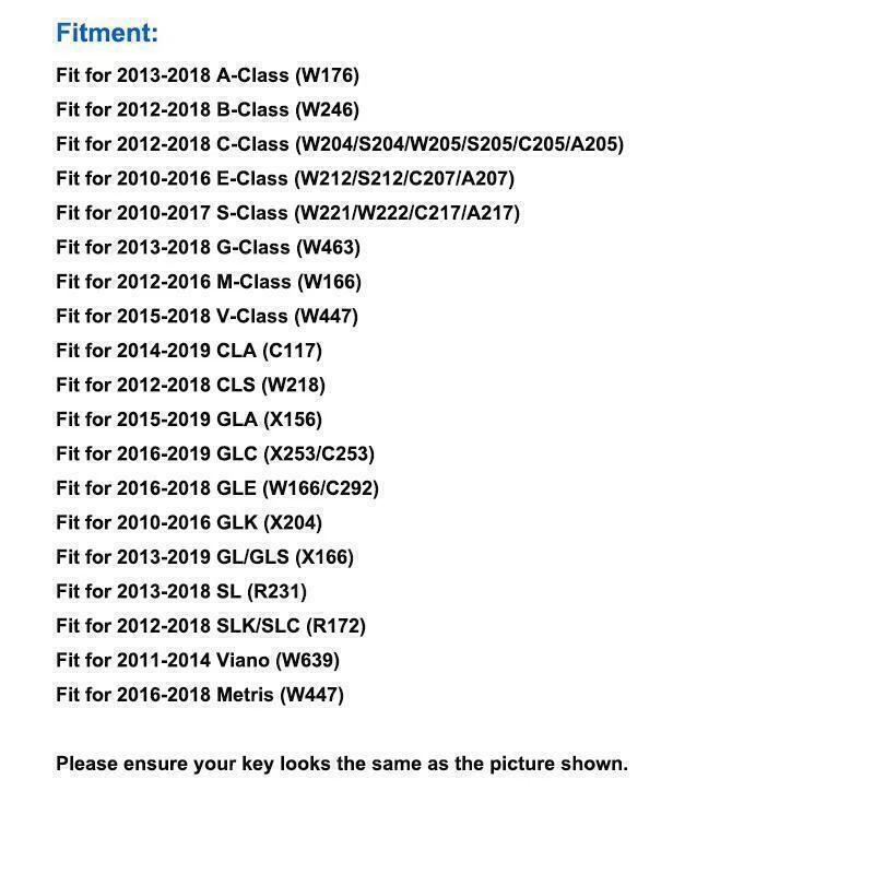 Product Description Carbon Fiber Smart Car Key Case Cover Fob Holder Accessories For Mercedes-Benz Fitments: 100% Brand new. It not really carbon fiber, just a silicone product that look like carbon fiber texture. Does not block the car key signal Anti-dust, anti-drop and anti-scratch The product is soft and tough, it can better protect your car key. This product does not cover the buttons and does not affect the feel of pressing. Fit Mercedes-Benz with Smart Key as below: Fit for 2013-2018 A-Class (W176) Fit for 2012-2018 B-Class (W246) Fit for 2012-2018 C-Class (W204/S204/W205/S205/C205/A205) Fit for 2010-2016 E-Class (W212/S212/C207/A207) Fit for 2010-2017 S-Class (W221/W222/C217/A217) Fit for 2013-2018 G-Class (W463) Fit for 2012-2016 M-Class (W166) Fit for 2015-2018 V-Class (W447) Fit for 2014-2019 CLA (C117) Fit for 2012-2018 CLS (W218) Fit for 2015-2019 GLA (X156) Fit for 2016-2019 GLC (X253/C253) Fit for 2016-2018 GLE (W166/C292) Fit for 2010-2016 GLK (X204) Fit for 2013-2019 GL/GLS (X166) Fit for 2013-2018 SL (R231) Fit for 2012-2018 SLK/SLC (R172) Fit for 2011-2014 Viano (W639) Fit for 2016-2018 Metris (W447) Please ensure your key looks the same as the picture shown. Package included: 1 x Key shell (car key is not included) 1 x Key chain Payment Shipping Returns Contact Us We accept PayPal via eBay Secure Check-Out only. Payment is expected within 7 days of auction close. Unpaid Items will be forfeited per eBay . Immediate payment needs to be processed for items with Add to Cart option so that any promotional discounts can be applied to your order immediately. Orders processed within 24-48 hours of payment verification. We only ship to confirmed PAYPAL addresses. Your PAYPAL address must match your shipping address. Service transit time is provided by the carrier and excludes weekends and holidays. Transit times may vary, particularly during the holiday season. We accept return, refund or exchange within 30 days. All returned products must be in their original packaging with all included accessories intact, and must be accompanied by a copy of the Return Item Authorization (RMA) issued by us, and sent to the address indicated in the Return Item Authorization. We shall notify you once we have received and processed your returned item. We typically process your returned items for evaluation & investigation within seven (7) days of receiving them. If it meets our warranty requirements, a refund will be given or a brand new replacement unit will be sent to you at our cost. Please don't leave Neutral, Negative feedback or leave low DSR ratings before communication. If you have any problem, Please contact us by message, we will do our best to service you. Thanks very much and have a good day! Payment We accept PayPal via eBay Secure Check-Out only. Payment is expected within 7 days of auction close. Unpaid Items will be forfeited per eBay . Immediate payment needs to be processed for items with Add to Cart option so that any promotional discounts can be applied to your order immediately. Shipping Orders processed within 24-48 hours of payment verification. We only ship to confirmed PAYPAL addresses. Your PAYPAL address must match your shipping address. Service transit time is provided by the carrier and excludes weekends and holidays. Transit times may vary, particularly during the holiday season. Returns We accept return, refund or exchange within 30 days. All returned products must be in their original packaging with all included accessories intact, and must be accompanied by a copy of the Return Item Authorization (RMA) issued by us, and sent to the address indicated in the Return Item Authorization. We shall notify you once we have received and processed your returned item. We typically process your returned items for evaluation & investigation within seven (7) days of receiving them. If it meets our warranty requirements, a refund will be given or a brand new replacement unit will be sent to you at our cost. Contact Us Please don't leave Neutral, Negative feedback or leave low DSR ratings before communication. If you have any problem, Please contact us by message, we will do our best to service you. Thanks very much and have a good day! powered by