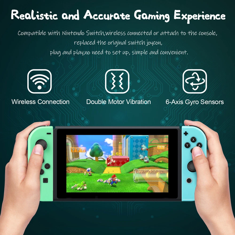 For Nintendo Switch Joy-Con Controller Gamepad Left + Right Wireless Joystick US Notes: We sell the controller and straps seperatelly, if you need both, please buy both Set. Features: 【Design for Nintendo Switch】 Switch controller is an ideal alternative to original controller, which is perfectly compatible with Switch. The left and right controller can be used alone, which is suitable for multi players combat or cooperative playing. It can also be installed on the switch to become a handheld mode, suitable for playing games alone. 【Support Wireless & Wired Function】 Switch controller the simple slot design ensures your switch is safe. Support the cable connection by sliding the switch controller onto the console and the switch controller automatically connects to the console. If the controller is not powered on, after connecting the console through the cable, the console will charge the controller. 【Ergonomic Design & Long Playtime】 Switch joycon the switch controllers offer multiple surprising new ways for players to have fun; With the unique grip and ergonomic design to rest your palms and index fingers. Comfortable to Hold If you use your switch as a handheld. You can now play for hours without your hands hurting. Especially fits for large hands. built-in battery in each joy con controller provides 15-20 hours gaming session. 【High Performance and Include Grip】 Switch joycon controller joy con controller left and Right Controllers controllers can be used as an entire controller or can be used as two independent controllers for Switch.Neoteric 3D stick can be operated precisely on 360°all-round. Offering you a pleasant gaming experience. NO NFC to support function and IR motion camera function. 【Double Shock & Motion Control Function】 Switch Joypad controller supports the Gyro axis and dual motors vibration functions. With 6-Axis gyro somatosensory and motion controls functions to provide real and stimulated gaming experience; Feel every hit and crash with hand-vibrating double shock response. Highly sensitive motion control system senses your every move and characters as well as objects in the game will move and react as you tilt,push and shake the controller. Compatible with Nintendo Switch/Lite/OLED console, NEW Replacement Not Original. Package: 1 pair controller( Left + Right ) Payment Delivery details Terms of sales About us Contact us Payment We accept payment via PayPal, Visa, Mastercard, Apple Pay, Google Pay etc. Delivery details 1. Items are generally shipped out within 24-48 hours after your payment has been cleared (Sat. & Sun. excluded.) 2. Orders from the United States will all be shipped out via USPS/Fedex. The shipment usually takes 1-5 business days( Exclude public holiday), if you need the item urgently, please contact us for detail before purchase. 3. We ship to US ONLY and do not support Collection. 4. All items will be shipped to buyer's paypal address. Please check your paypal address before place the order. 5. We are not responsible for wrong or undeliverable address. We reserve the right to charge the shipping fee again for returned items due to wrong address. Terms of sales 1. We provide 30 days free replacement ,30 days money back on non-defective, undamaged, unused and resalable products. Product is not eligible for refund after the 30-day refund period has expired. 2. Our warranty does not extended to any products that are physically damaged or that are not under normal operating conditions as a result of misuse or improper installation on the buyer/user's part. 3. For all returned products, Please contact us for the returning address. 4. In all cases, buyers pay shipping fees at their own cost to return products for exchange or refund. We will be responsible for the postage of replacements. Refund will be made upon receipt of the returned item. About us (1) We are a store, mainly run laptop accessory. Such as laptop battery , tool battery, ac adapter etc. (2) All item passed FCC / CE / ROHS certificates. Help buyer reduce the risk of damage, fire, dangerours mostly. (3) We work with a good quality OEM supplier and factory. Help you and us save money greatly. Contact us - You don't need to pay for eBay Square Trade for getting covered by our warranty policy. - There is a warranty label on our products like batteries and adapter chargers, please keep it safe and sealed. - We don't cover the failure or damage caused by misuse, accident, modification, inappropriate physical or operating environment, natural disaster, power surge, and improper maintenance or storage. - If you misuse the eBay Return Policy, our warranty to your purchase will be revoked. - Please contact us via eBay message if you have any problem and please allow us 24 hours to reply, we will do our best to help you solve it.
