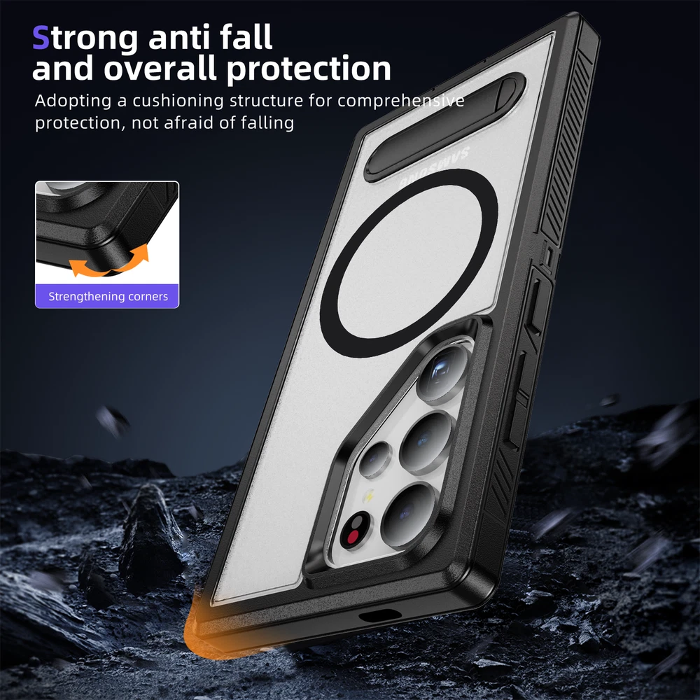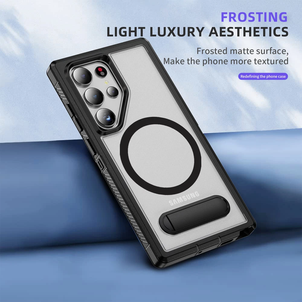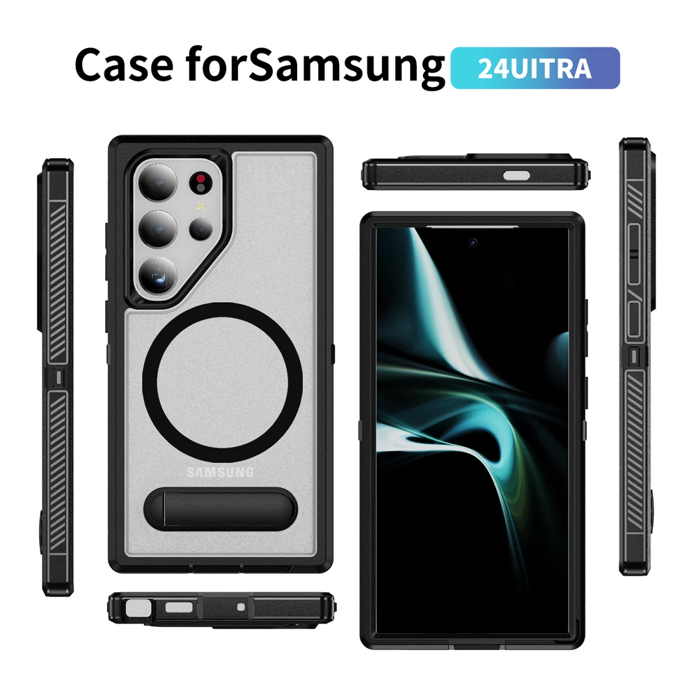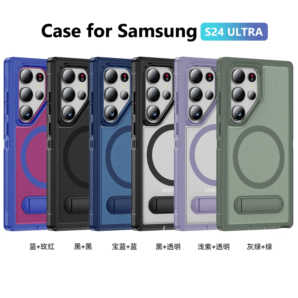 For Samsung Galaxy S24 Ultra S23FE S22 Mag Safe Magnetic Case Stand Rugged Cover 1. Magnetic design: The phone case has a strong magnetic function, which can easily install and remove the phone and keep the phone firmly fixed in the case. 2. Bracket function: The phone case also has a bracket function, which can stand the phone up for easy viewing of videos, video calls and other operations. 3. Durable material: The phone case is made of high-quality materials, which is durable and drop-resistant, effectively protecting the phone from damage. 4. Precise openings: The openings of the phone case are precisely positioned to ensure that users can easily access all buttons, interfaces, cameras and other functions. 5. Fashion design: The phone case has a stylish, simple and high-end appearance, which can add a unique personality style to the phone.