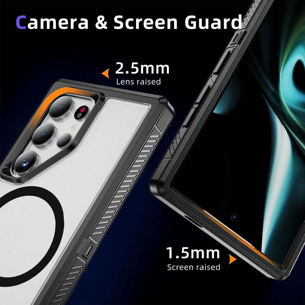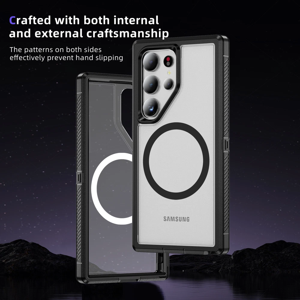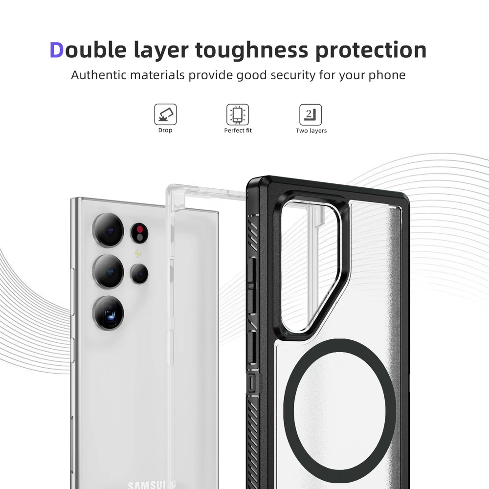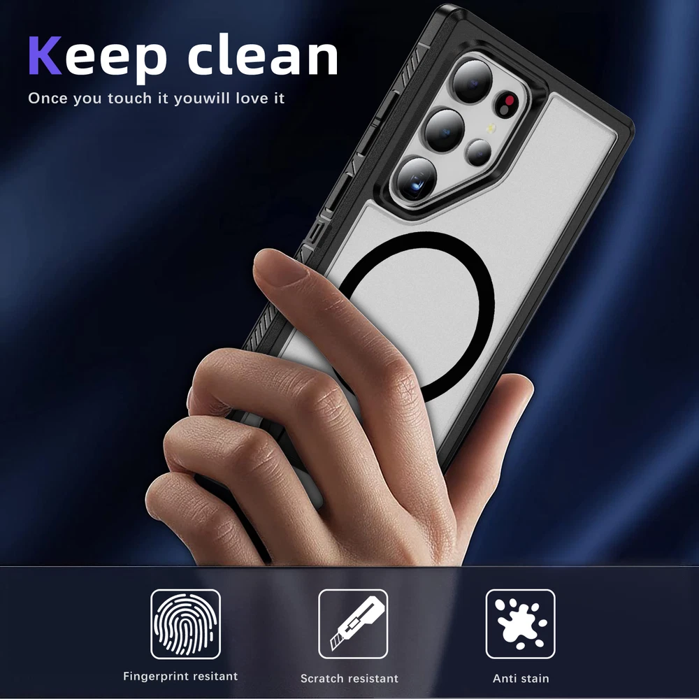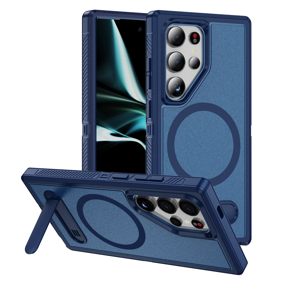 For Samsung Galaxy S24 Ultra S23FE S22 Mag Safe Magnetic Case Stand Rugged Cover 1. Magnetic design: The phone case has a strong magnetic function, which can easily install and remove the phone and keep the phone firmly fixed in the case. 2. Bracket function: The phone case also has a bracket function, which can stand the phone up for easy viewing of videos, video calls and other operations. 3. Durable material: The phone case is made of high-quality materials, which is durable and drop-resistant, effectively protecting the phone from damage. 4. Precise openings: The openings of the phone case are precisely positioned to ensure that users can easily access all buttons, interfaces, cameras and other functions. 5. Fashion design: The phone case has a stylish, simple and high-end appearance, which can add a unique personality style to the phone.