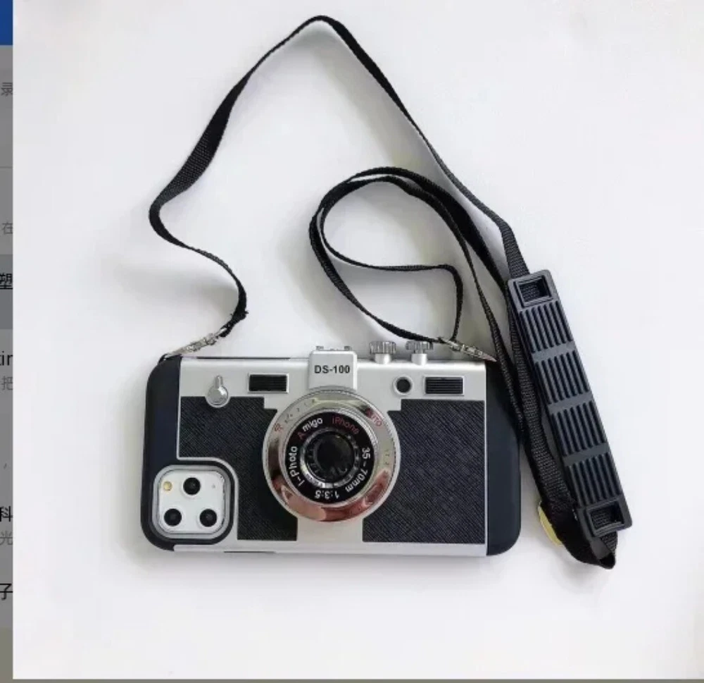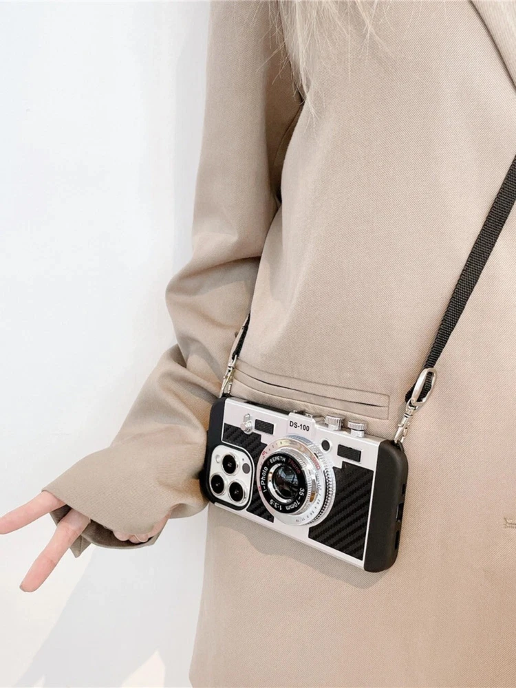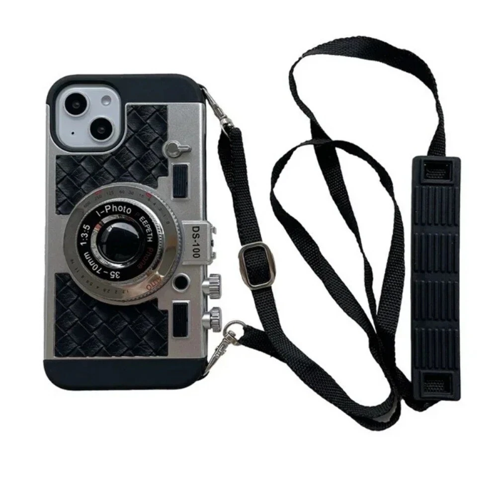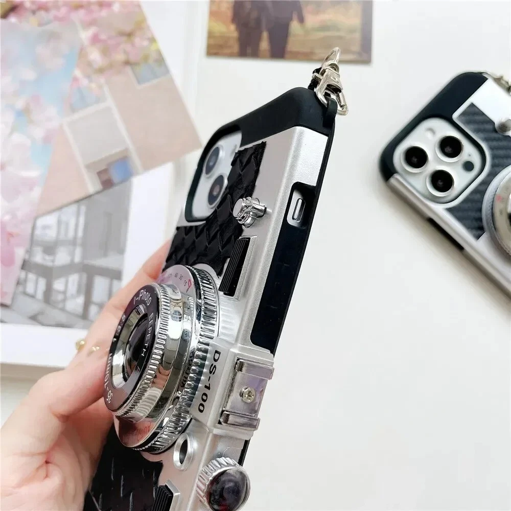For iPhone 15 16 14 13 pro max 12 11 Retro 3D camera With Lanyard Phone Case