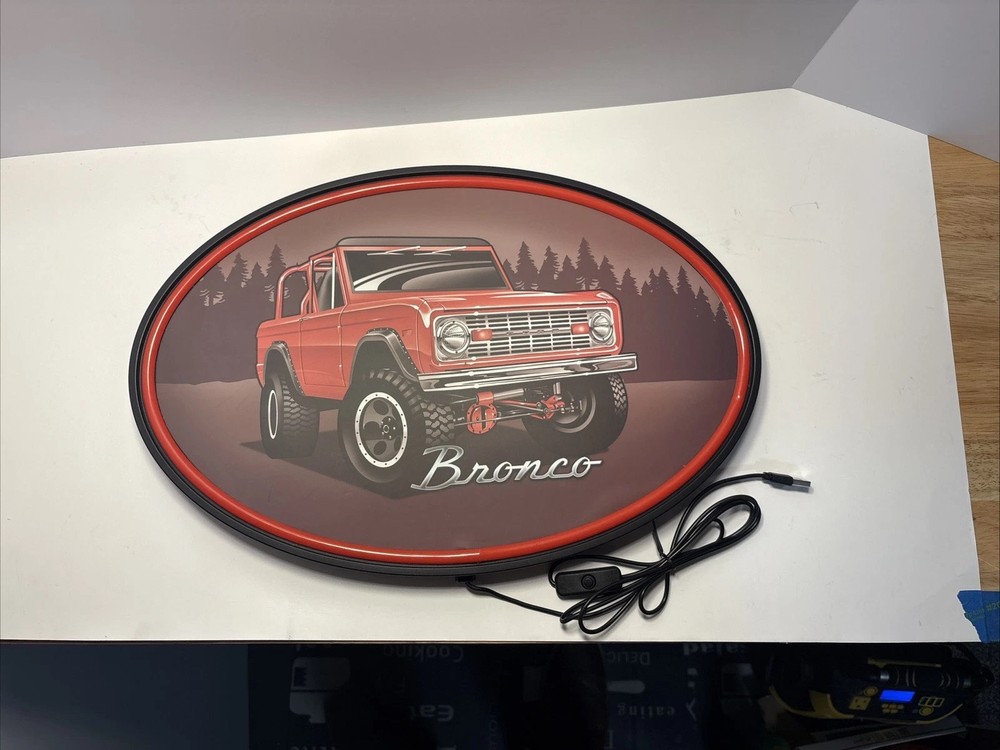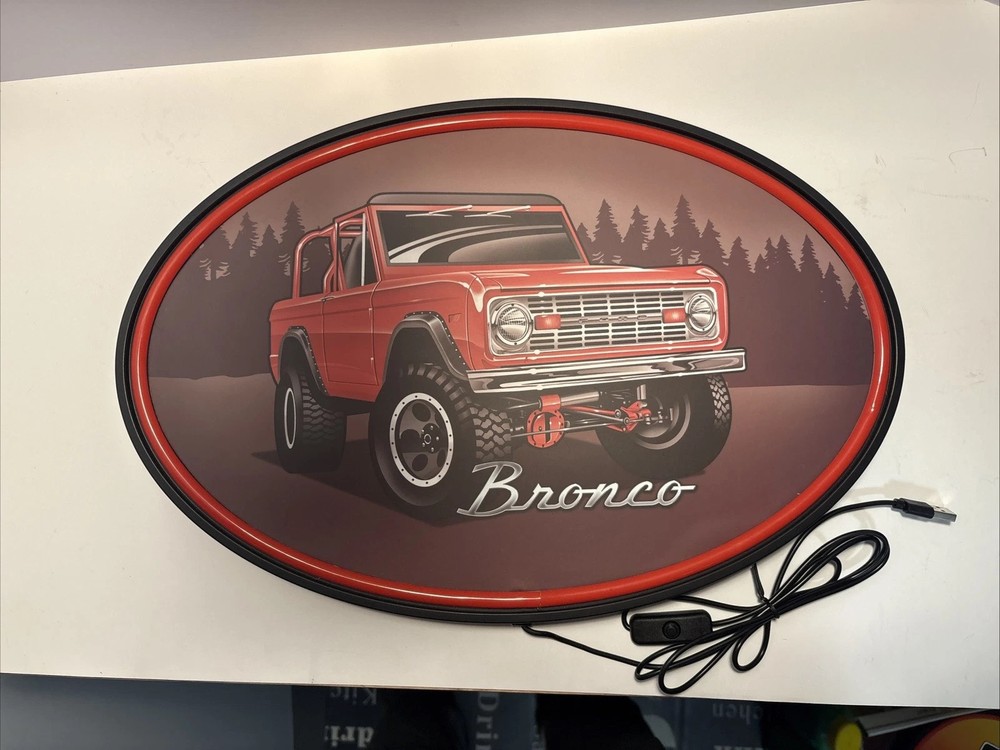Brighten up your space with this stunning Ford Bronco LED neon lighted sign. Measuring 17 inches in long, this oval-shaped sign is the perfect addition to any man cave, garage, or teen bedroom. Made from high-quality plastic and LED materials, this sign is durable and long-lasting. Featuring a red color and a marquee shape, this decorative sign is perfect for those who love art and want to add a touch of style to their decor. With a variety of mounting options, including hanging, wall-mounted, and door-mounted, this sign can be displayed in any room. Plus, with its luminous features and USB plug, this sign is sure to impress your guests. Add a touch of luxury to your home with this licensed Ford Bronco LED neon lighted sign today! New no box BC00713