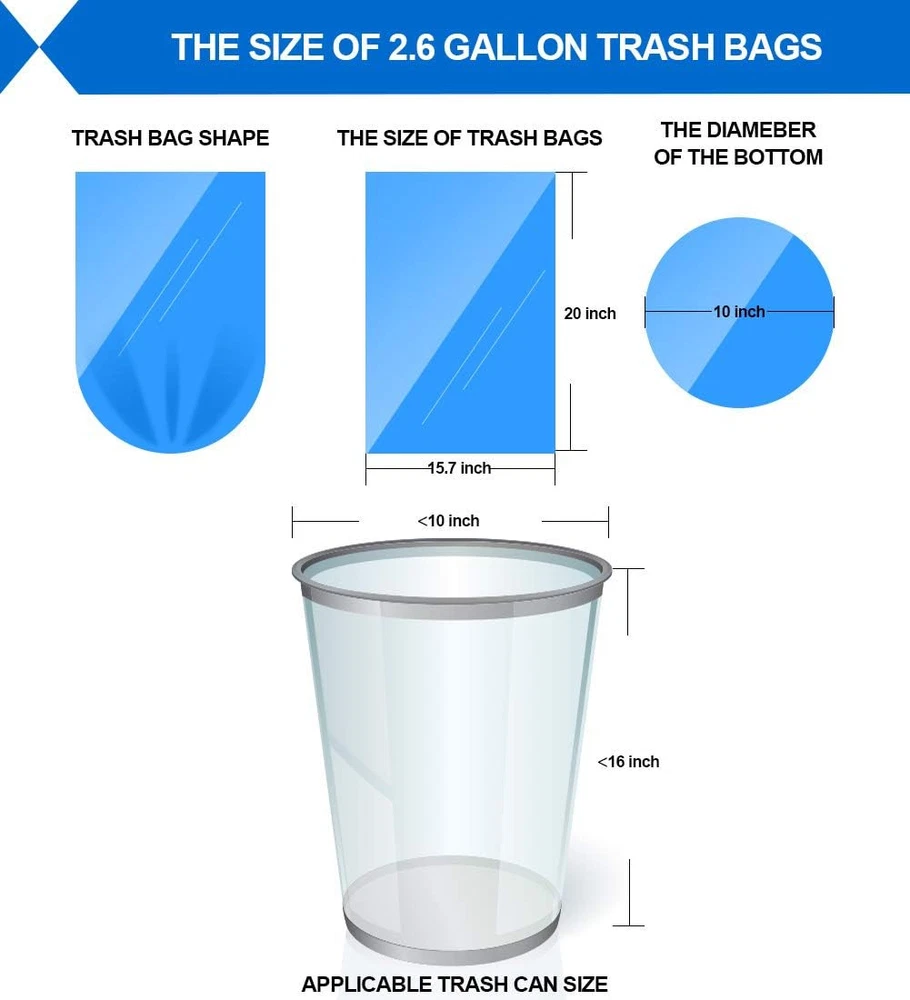 Forid Small Trash Bags for Bathroom - 2.6 Gallon - 150 Pack Product Details Is Discontinued By Manufacturer : No Product Dimensions : 7.87 x 1.97 x 3.94 inches; 1.06 Pounds Manufacturer : FORID Country of Origin : China Brand: FORID Capacity: 9 Liters Unit Count: 150 Count Recommended Uses For Product: Bathroom Trash, Food Waste, Baby Kitchen Waste Material Feature: Eco Friendly Color: Best Seller: 2.6 Gallon - 150 Pack Material: Plastic Item Form: Bag Scent: Odorless Number of Items: 150 Fit Most of Small Trash Cans - The size of our bin liners is 15.7 inches * 20 inches. 150 counts of 5 rolls 2.6 gallon clear small trash bags. The bin liners fit small size trash bins that round garbage bins with diameter ≤ 10", height ≤ 16". An integral forming on the bottom leave no space to leak. Multi-Color Choice & Roll Design - There are 5 colors of our small 2.6 gallon garbage bags, include Blue, Green, Pink, Yellow and Purple. They arrive in a neat roll with nice package box, perfect for storage. Extra Strong Material - FORID 2.6 gallon small trash bags are all made of pure HDPE material and odorless. This kind of material can make the 2.6 gallon garbage bags stronger than other normal trash liners. So you will find that our wastebasket liners no breakable, leakproof, extra strong and more durable. Multipurpose & Convenient - Not only a trash can liners for office, kitchen, living room, bedroom, bathroom, cleaning pet's litter, baby diapers and garage, these small bin liners can also store blankets, books and clothes according to season, and organize your holiday decorations. Customer Satisfaction - If you're not satisfied with our small trash bags, please feel free to contact us. We won't just say try our 2.6 gallon garbage bags and love them, we're truly dedicated to your satisfaction.