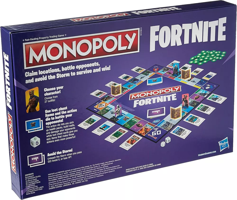 Recommended Age Range:13+Brand:HasbroCharacter Family:Fortnitegtin13:0630509810628Game Type:Board GameUPC:0630509810628Theme:FantasyGame Title:Monopoly: FortniteMin. Number of Players:2 playersCountry/Region of Manufacture:ChinaYear:2019Modified Item:NoType:Game BoardCustom Bundle:No