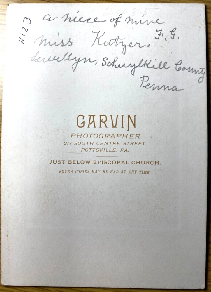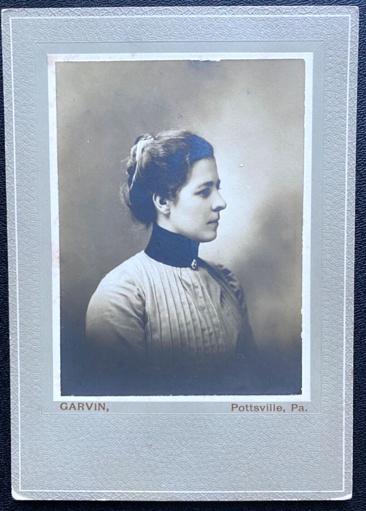 Miss Kutzer Young pretty woman Antique cabinet card photograph 1890s Photo taken by Garvin Studio of Pottsville, Pennsylvania Size of photo is 4.25"x 6.5" inches Visit our store for 2,000+ items – Thank You!