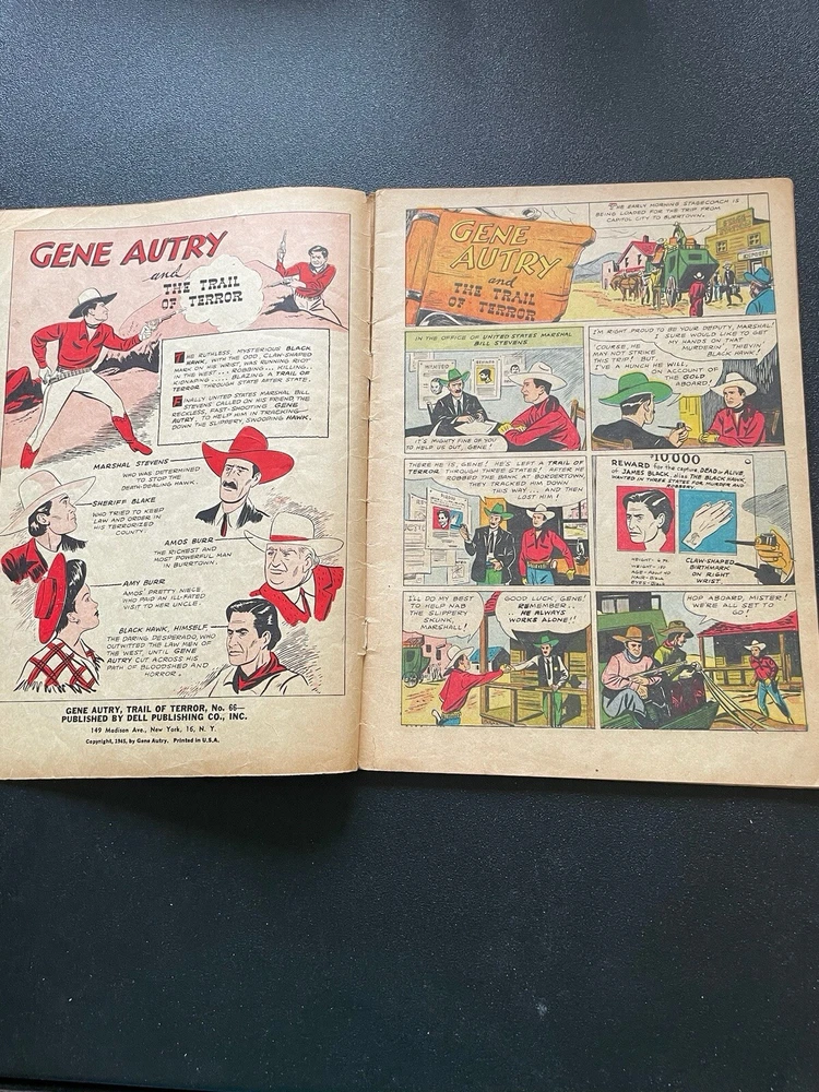 cover complete, dull cover, issue complete no pages or panels missing, corners rounded, creases on cover, spine intact with age appropriate wear, pages off white, minor tear last 4 or 5 pages on right hand margin does not interfere with story, rear cover minor tear left side in margin, feature two Gene Autry (the singing cowboy) stories begins inside front cover and ends inside rear cover, can be either collectible as a Four Color comic or a western comic collection Please observe photos carefully before ordering
