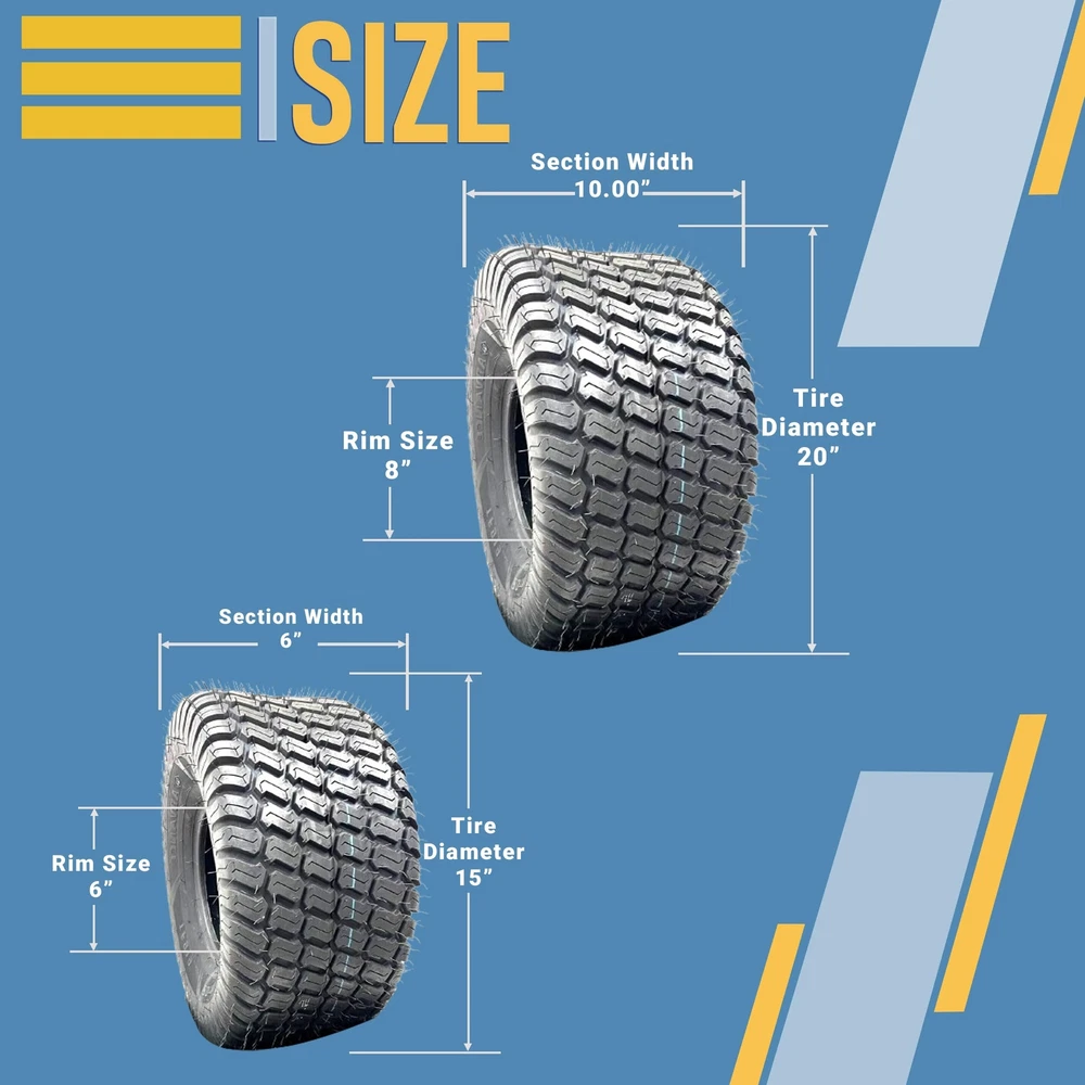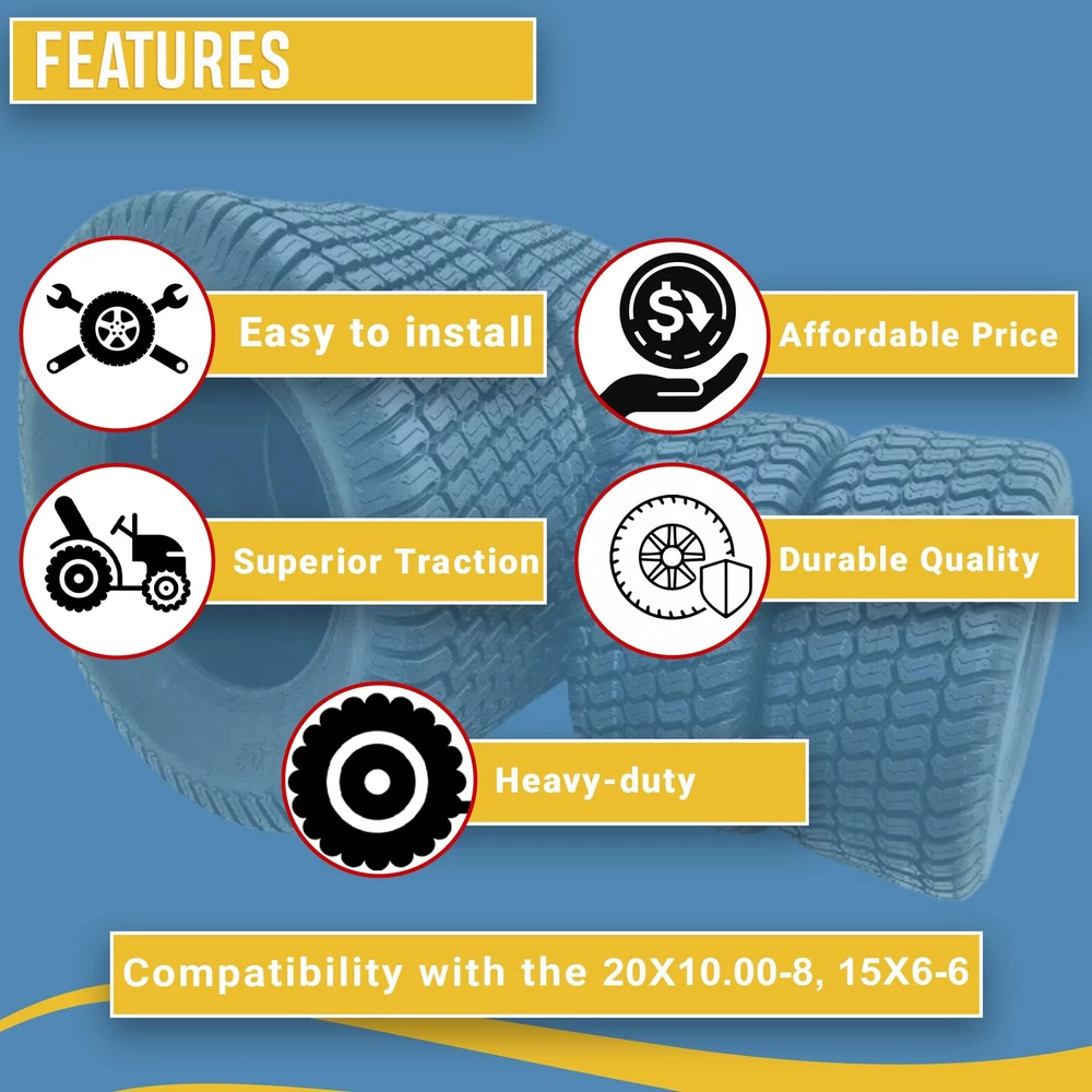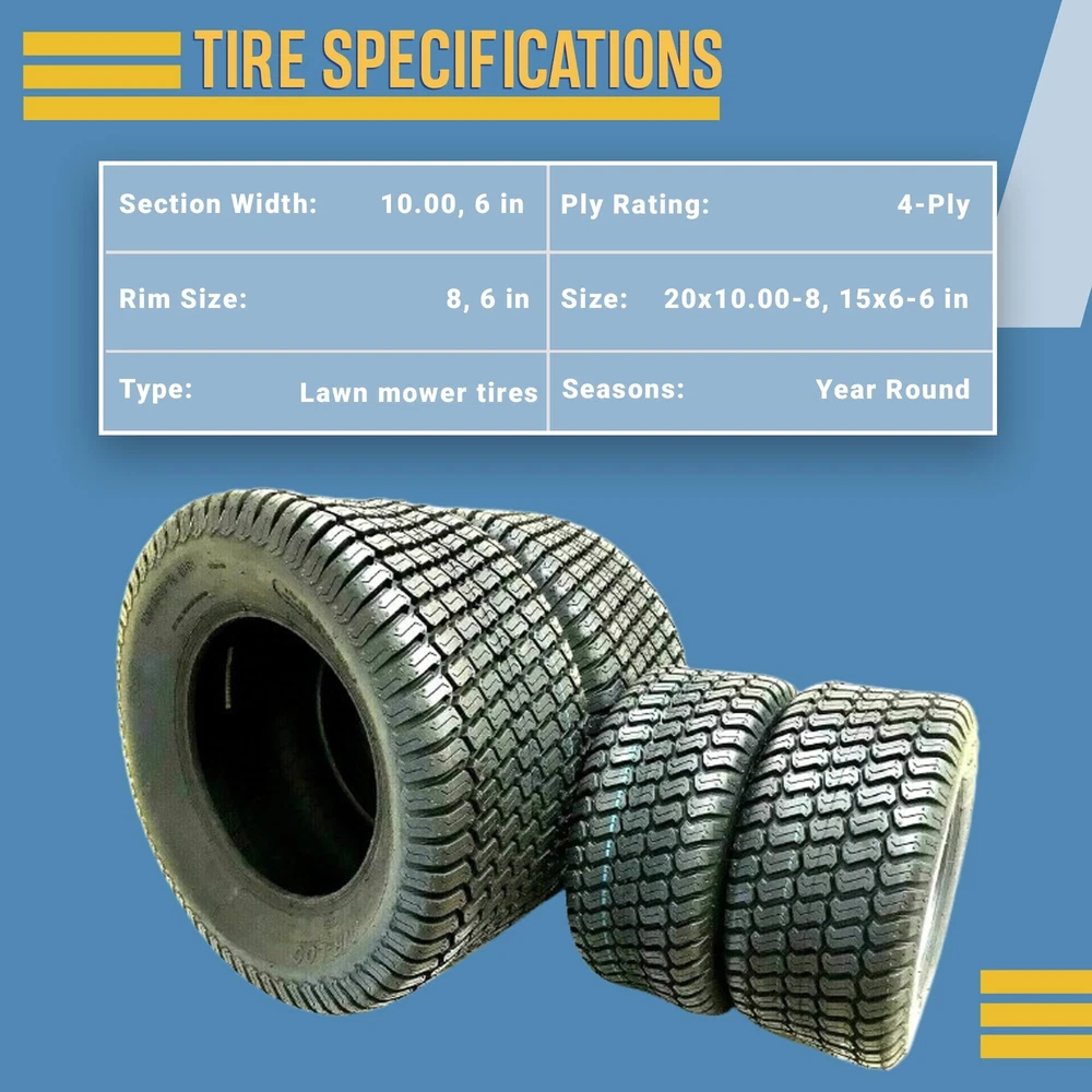 Size: 15X6-6, 20X10-8 Type: Lawn mower tires tubeless Ply: 4 βοΈππππ-πππππ ππππ πππππππ π ππ ππππππππ πππ πππππ Engineered to maintain uniform tread wear, these tires maximize their lifespan, ensuring prolonged and consistent performance and minimizing the need for frequent replacements βοΈπππππππππ πππππ ππππππ π ππ ππππππππ ππππππππ The tire's tread pattern is meticulously designed to offer superior grip, ensuring traction on different surfaces, minimizing slippage risks, and enhancing overall performance βοΈπππππππ ππππ πππππ π ππ πππππππ πππππππππππ This set includes varying sizes (15x6-6 and 20x10-8), accommodating different terrains and lawn tractor models, ensuring compatibility across various equipment βοΈπππππππππππππ ππππ πππ ππππ πππππππ ππππππ ππππππ Specifically tailored for 332 lawn tractor garden models, it ensures precise fitment and compatibility while optimizing stability and maneuverability βοΈππππππππ ππππ πππππππ ππππππ ππππππ ππππππππ Designed to perform consistently across different terrains, these tires provide stability and traction on grass, gravel, and other challenging landscapes