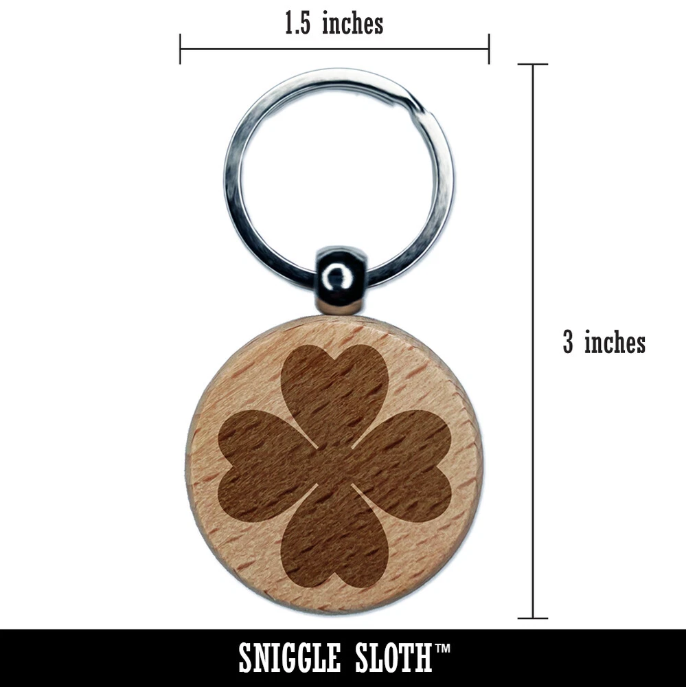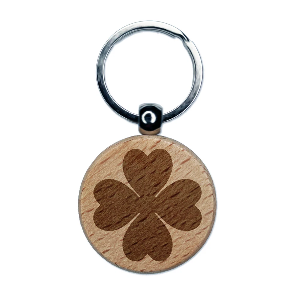 Four Leaf Clover Lucky Solid Engraved Wood Round Keychain Tag Charm