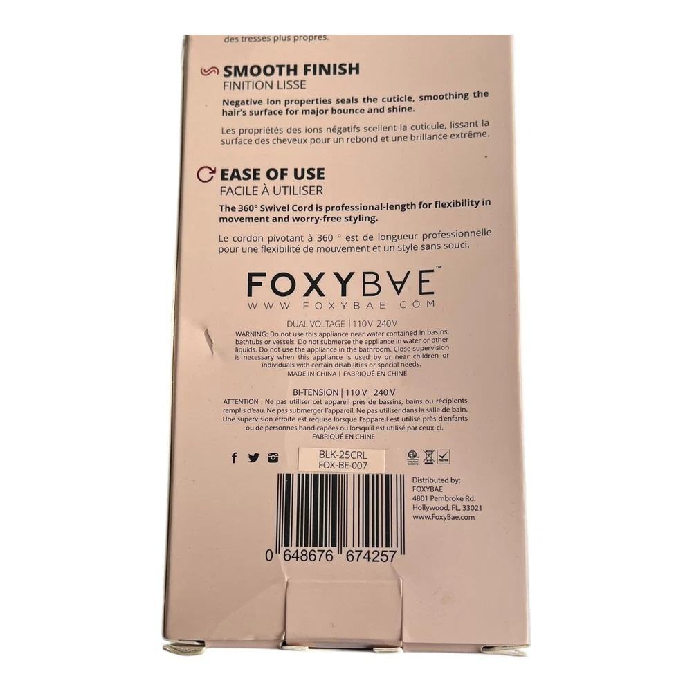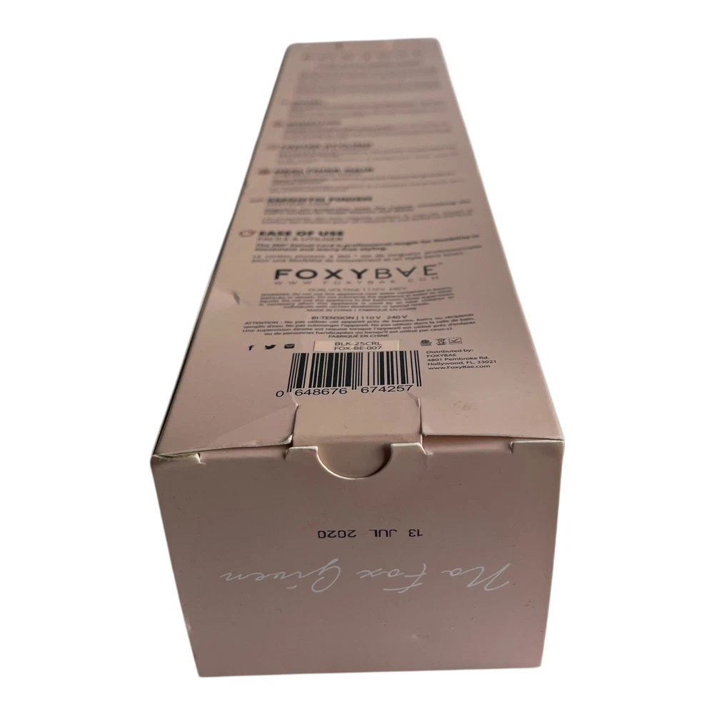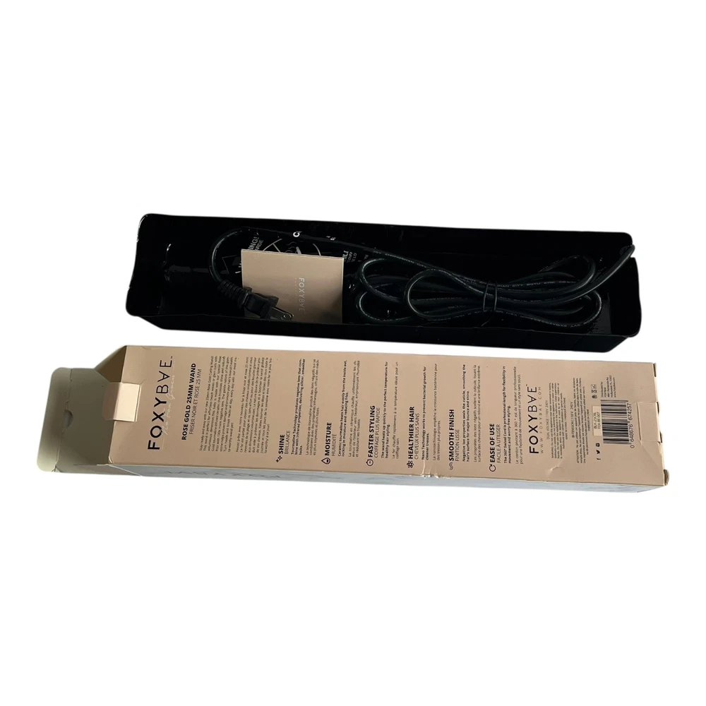 Overview Achieve salon-quality curls with the FoxyBae Rose Gold 25mm Curling Wand. This professional styling tool features advanced ceramic and negative ion technology to create smooth, shiny, and long-lasting waves while minimizing heat damage. Key Features 25mm Barrel: Perfect for creating medium-sized, bouncy curls. Rose Gold Finish: Stylish and elegant design. Negative Ion Technology: Seals the hair cuticle for reduced frizz and increased shine. Ceramic Technology: Distributes heat evenly for consistent styling and less damage. Faster Styling: Heats up quickly to the perfect temperature for efficient styling. Healthier Hair: Helps prevent bacterial growth for cleaner tresses. Smooth Finish: Leaves hair looking smooth, shiny, and frizz-free. Ease of Use: Features a 360° swivel cord for professional-length flexibility and tangle-free styling. Dual Voltage: Suitable for use worldwide (110V - 240V). Condition This item is brand new and has never been used. It is in its original, unopened packaging.